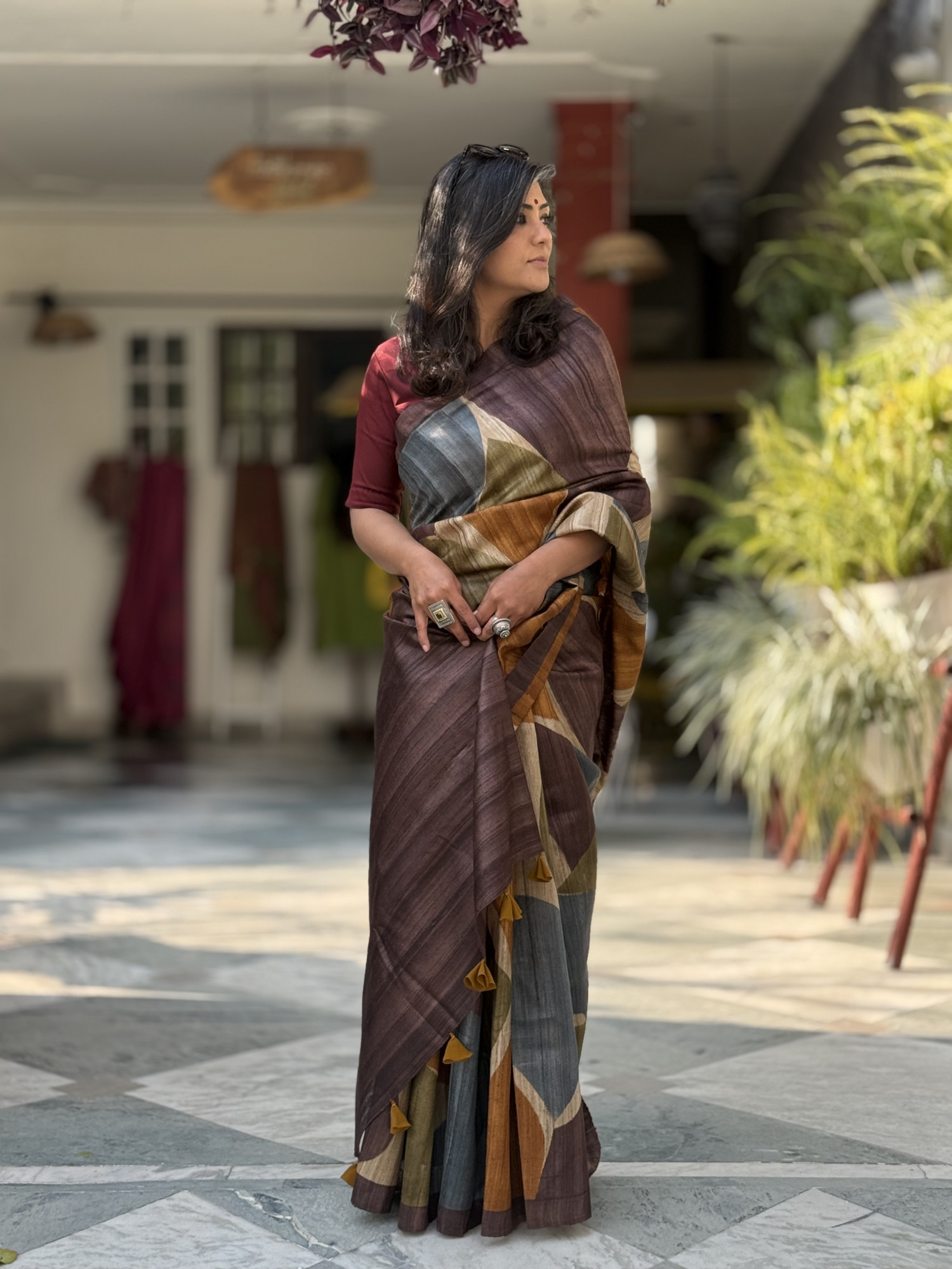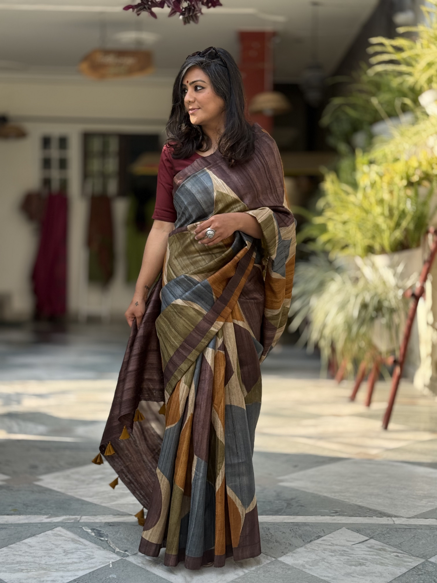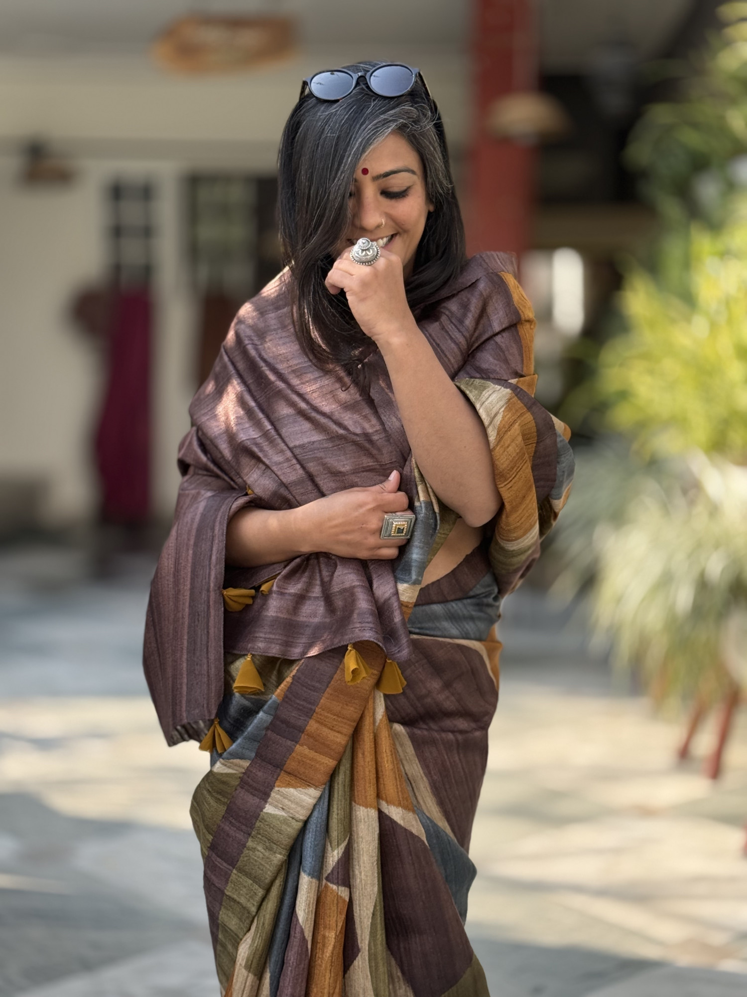 MULTI COLOUR PRINTED GHICHA TUSSAR SILK SARI. ACCESSORISED WITH TASSLES.