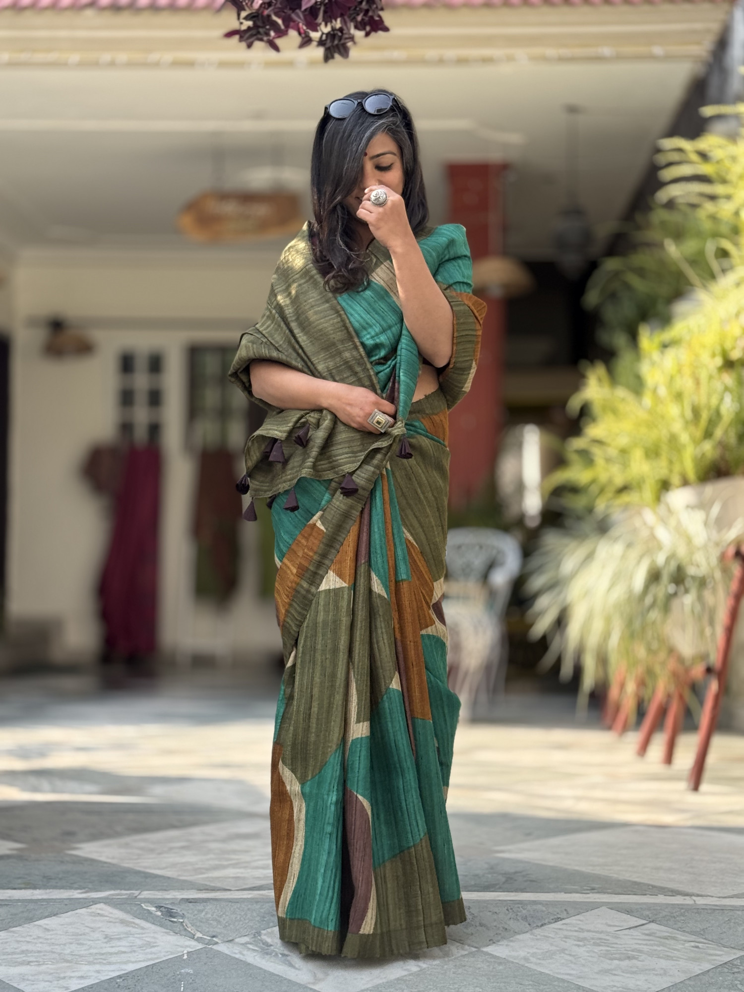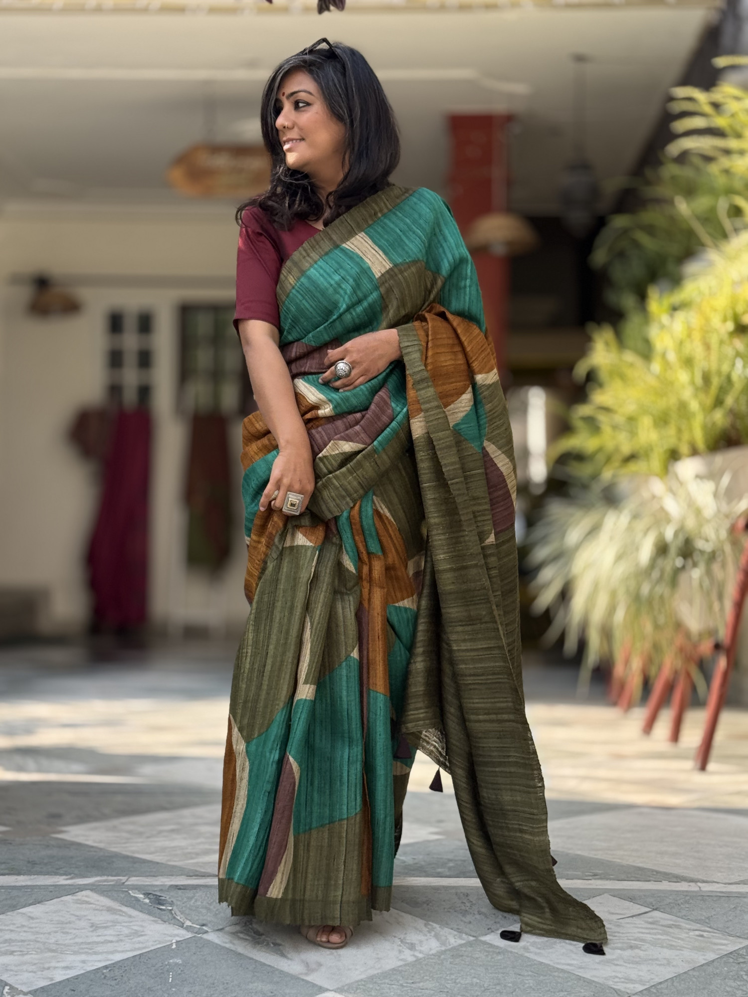 COMES WITH ITS OWN GREEN GICHA BLOUSE AND AN EXTRA RUST GICHA TUSSAR SILK BLOUSE PIECE (90 CMS)