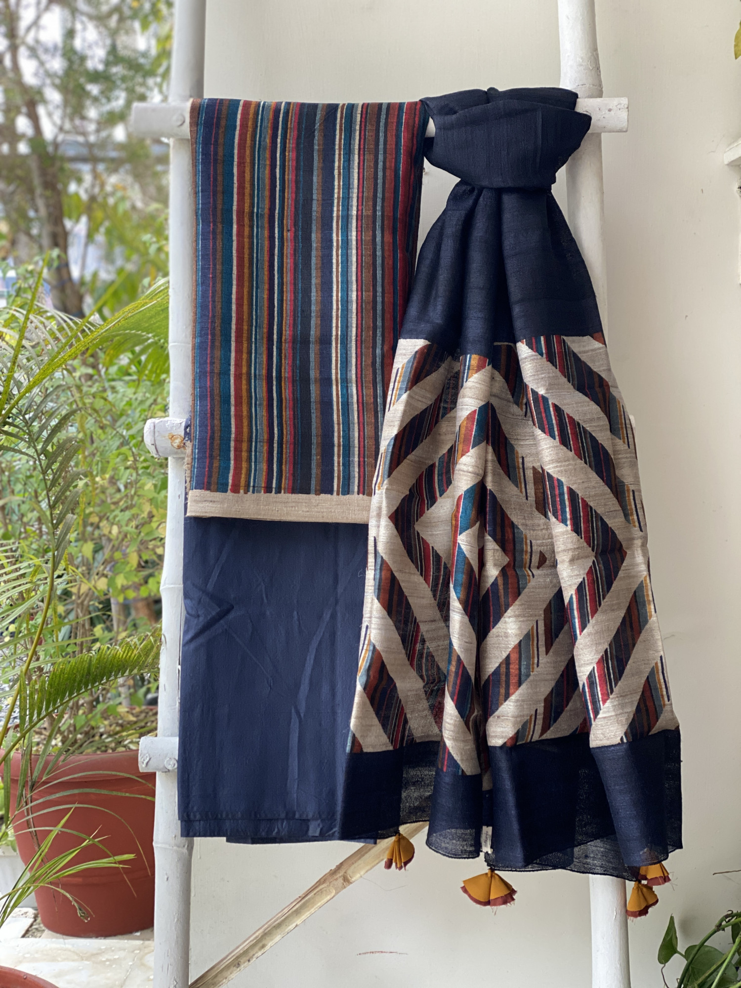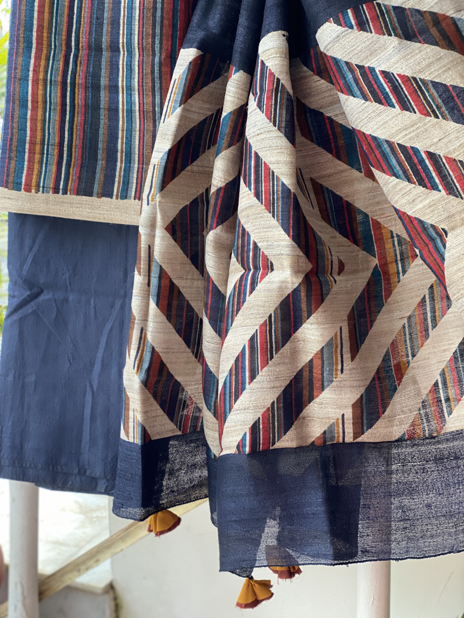 MULTI COLOUR GICHA SILK PRINTED SHIRT AND INDIGO WOVEN SILK PLAIN BOTTOM PAIRED WITH AN INDIGO GICHA SILK PRINTED DUPATTA . ACCESSORISED WITH TASSELS