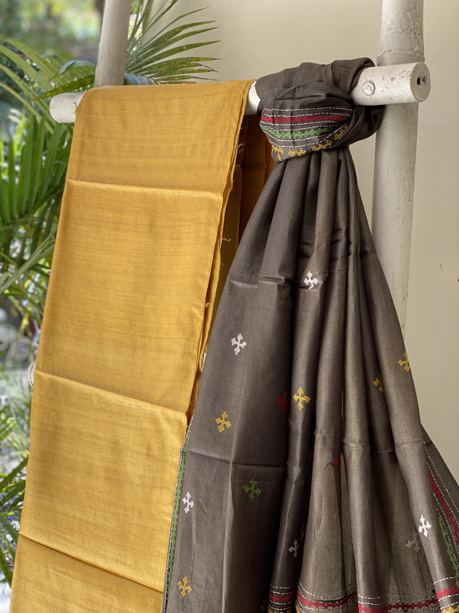 MUSTARD TUSSAR SILK shirt AND BOTTOM paired with A MOSS GREEN SINDHI HAND EMBROIDERED SILK dupatta AND accessorised with tassles.
