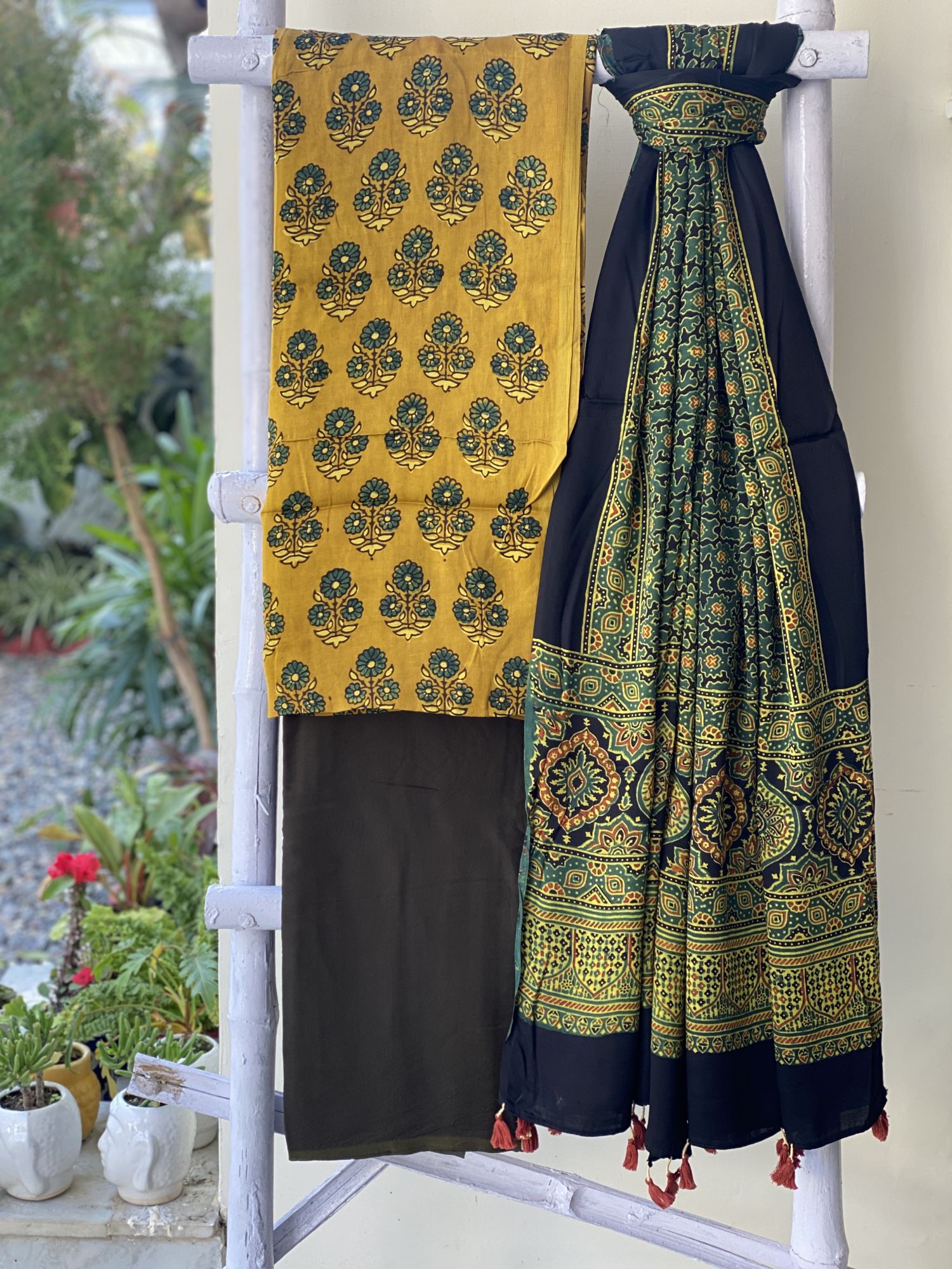 MUSTARD hand dyed ajrakh block print modal silk shirt and A MOSS GREEN MODAL SILK BOTTOM paired with A BOTTLE GREEN modal silk ajrakh block print dupatta, accessorised with tassles.