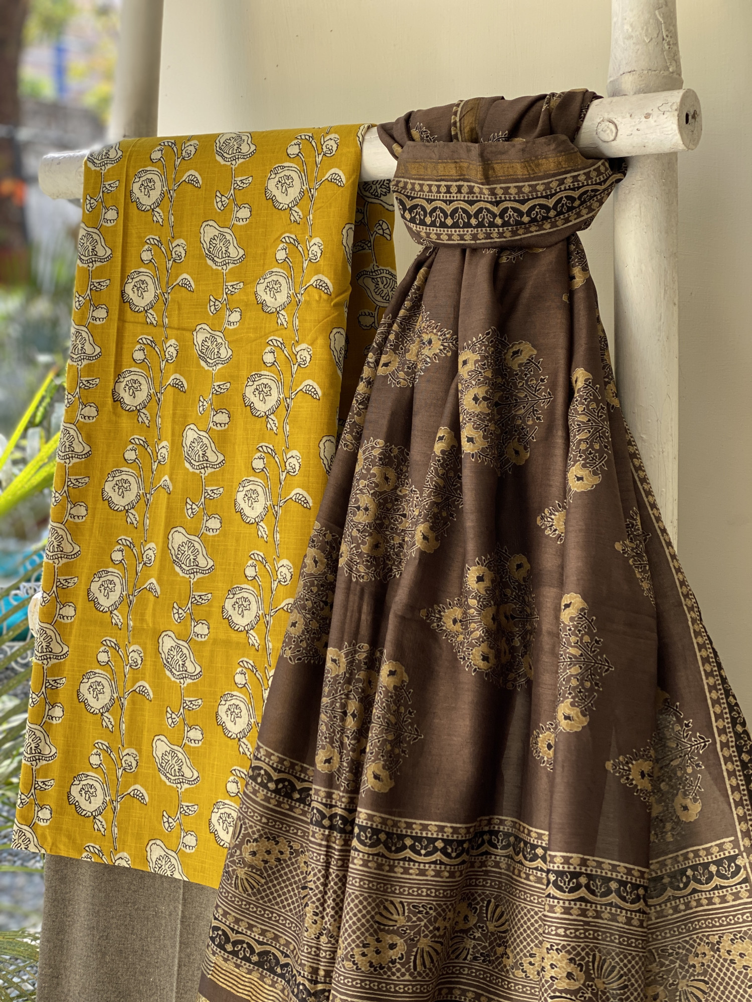 MUSTARD BLOCK PRINT COTTON SHIRT AND A BROWN BLOCK PRINTED COTTON BOTTOM PAIRED WITH A BROWN AJRAKH HAND BLOCK PRINT CHANDERI SILK AND COTTON DUPATTA WITH ZARI BORDERS, ACCESSORISED WITH TASSLES.