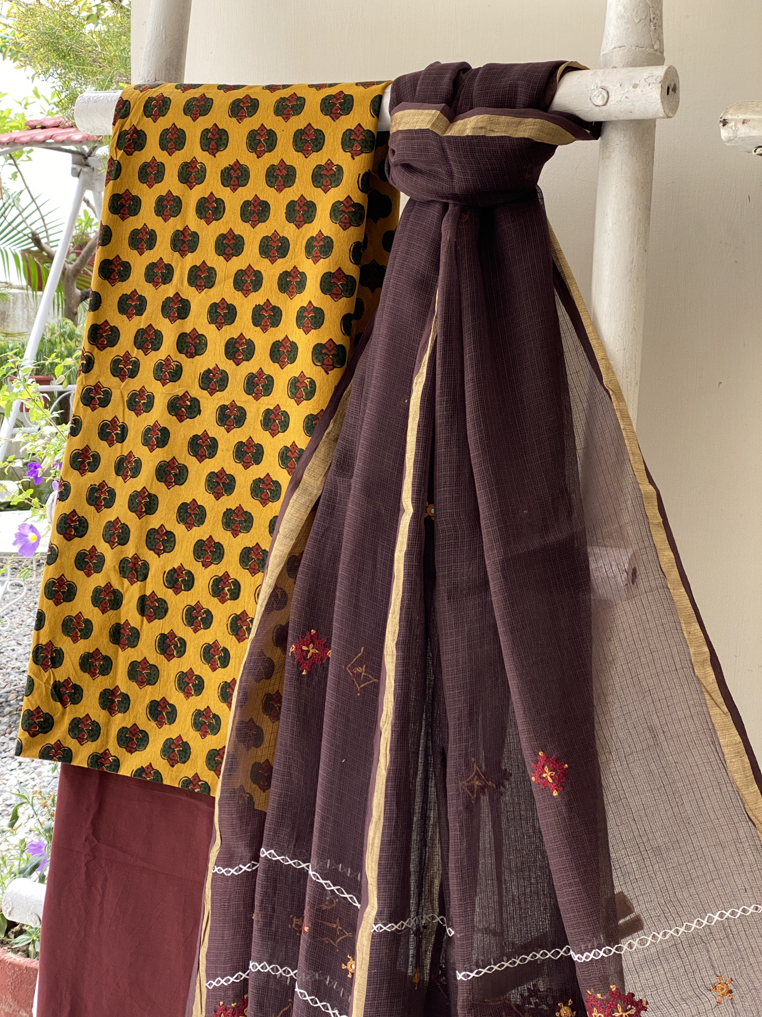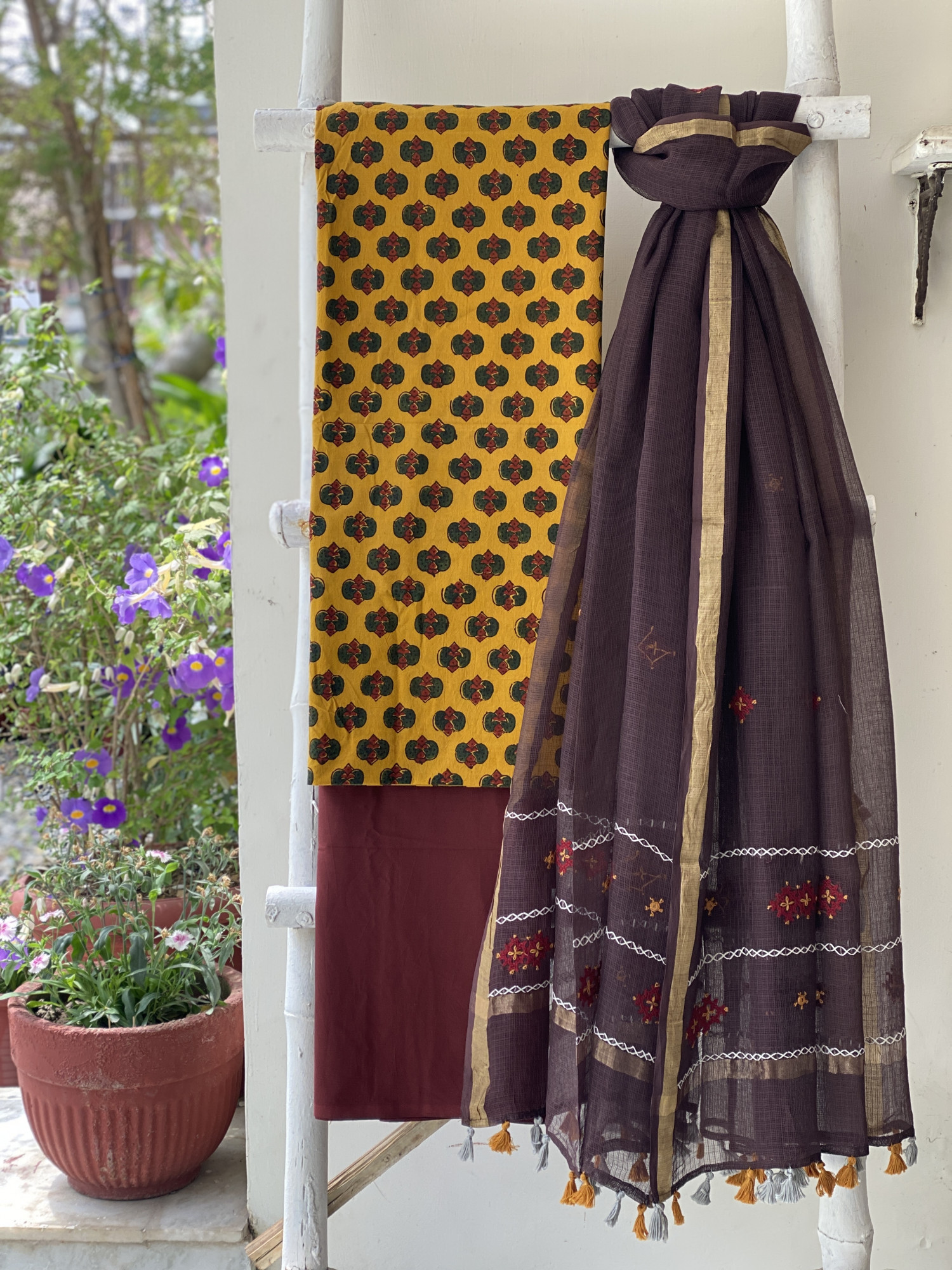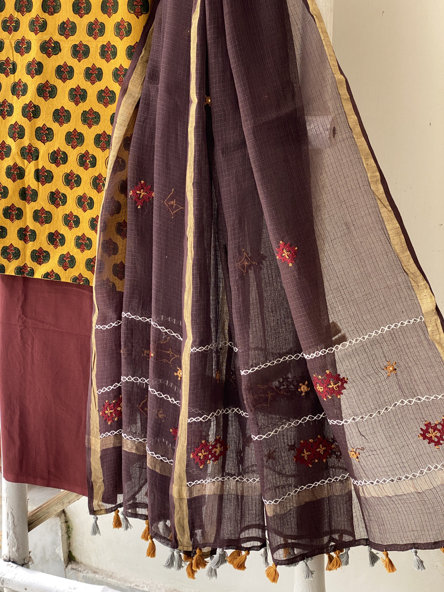 MUSTARD AJRAKH HAND BLOCK PRINT COTTON SHIRT AND A BROWN PLAIN COTTON BOTTOM PAIRED WITH A BROWN KOTA HAND EMBROIDERED DUPATTA WITH ZARI WOVEN BORDER, ACCESSORISED WITH TASSLES.