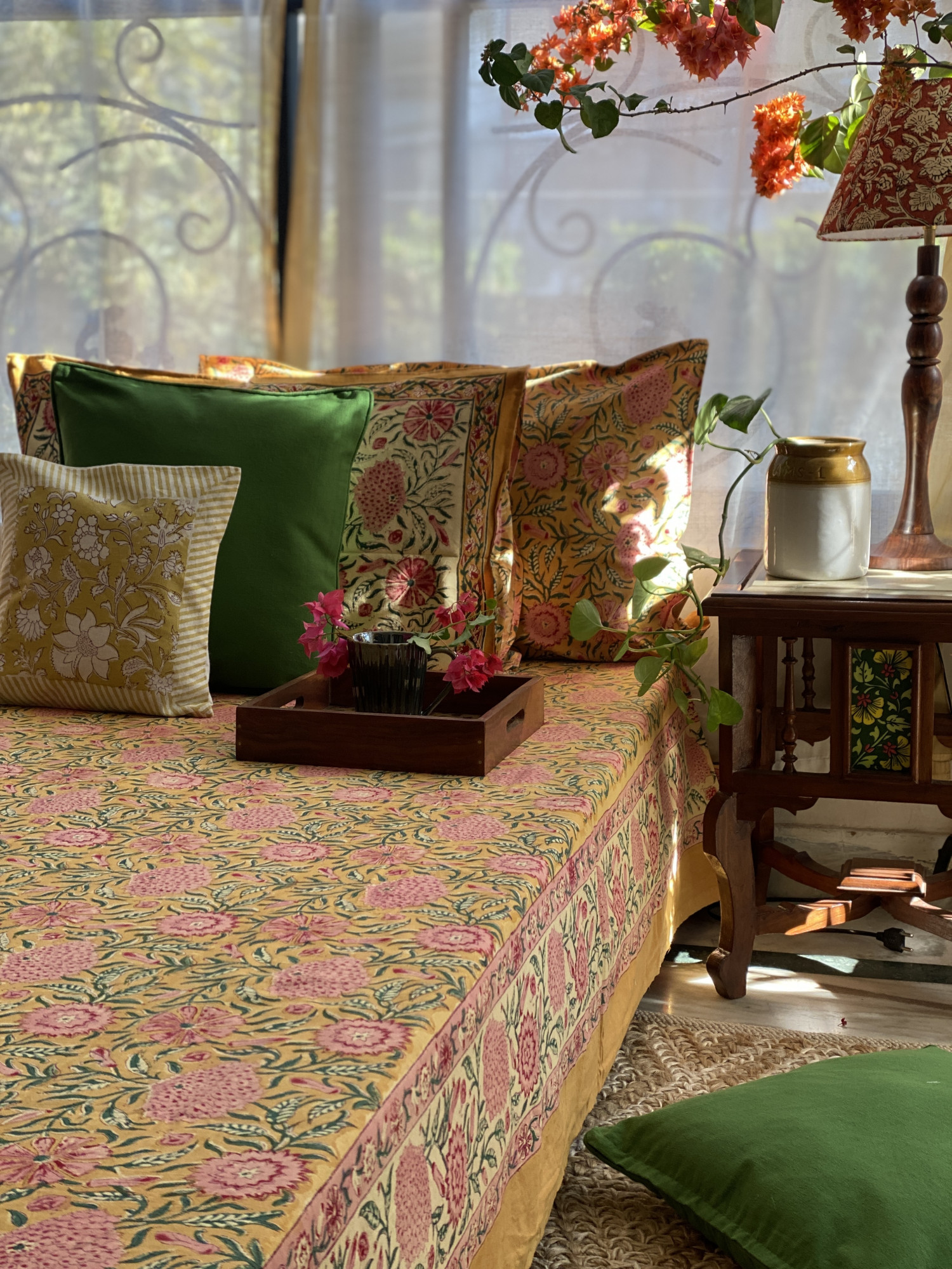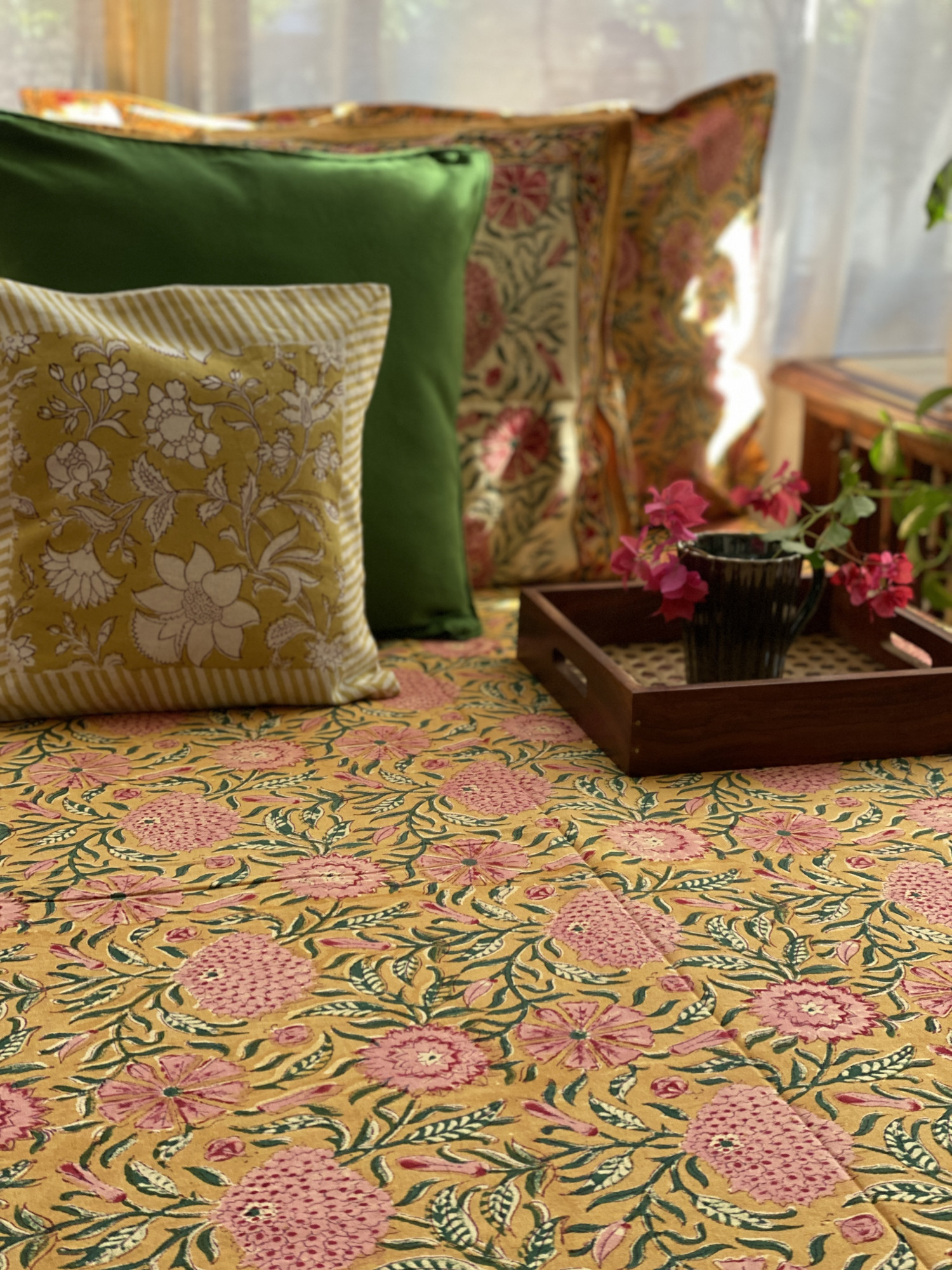 MUSTARD HAND block print COTTON KING bedsheet with REVERSIBLE pillow covers
