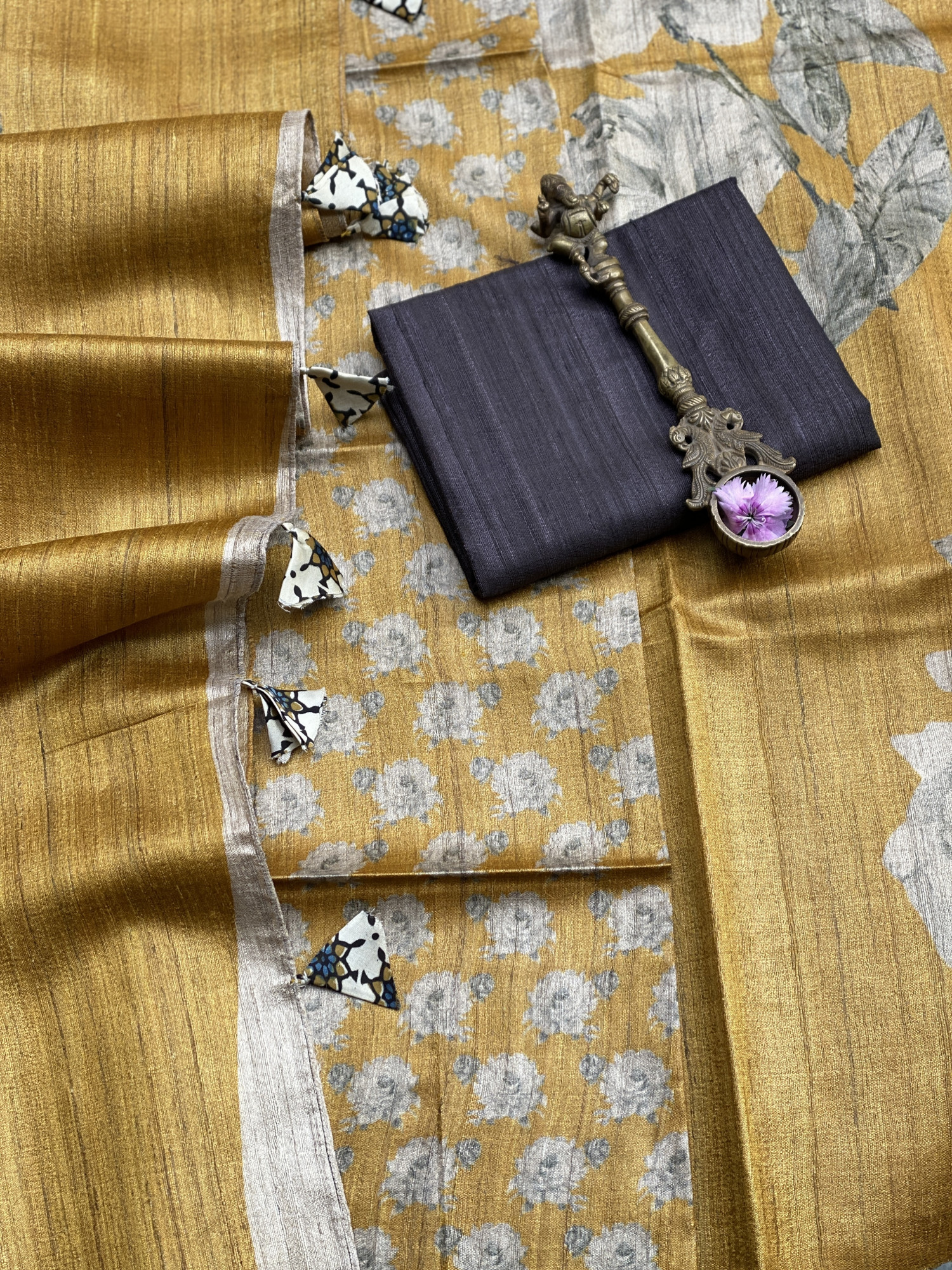 MUSTARD FLORAL PRINT TUSSAR SILK SARI