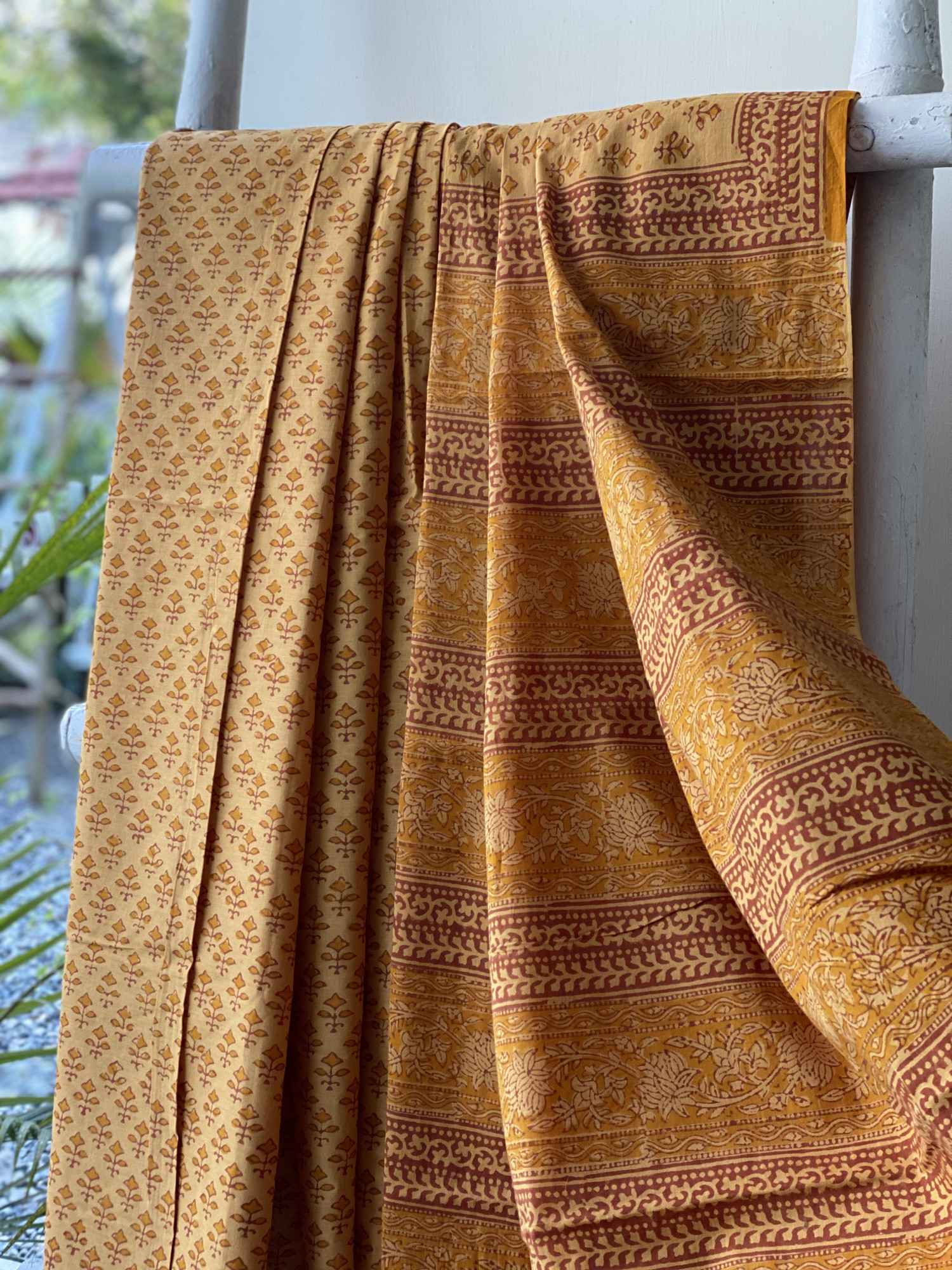 MUSTARD Cotton mull hand block print sari, accessorised with tassles. Comes with A COTTON RED HAND BLOCK PRINT blouse
