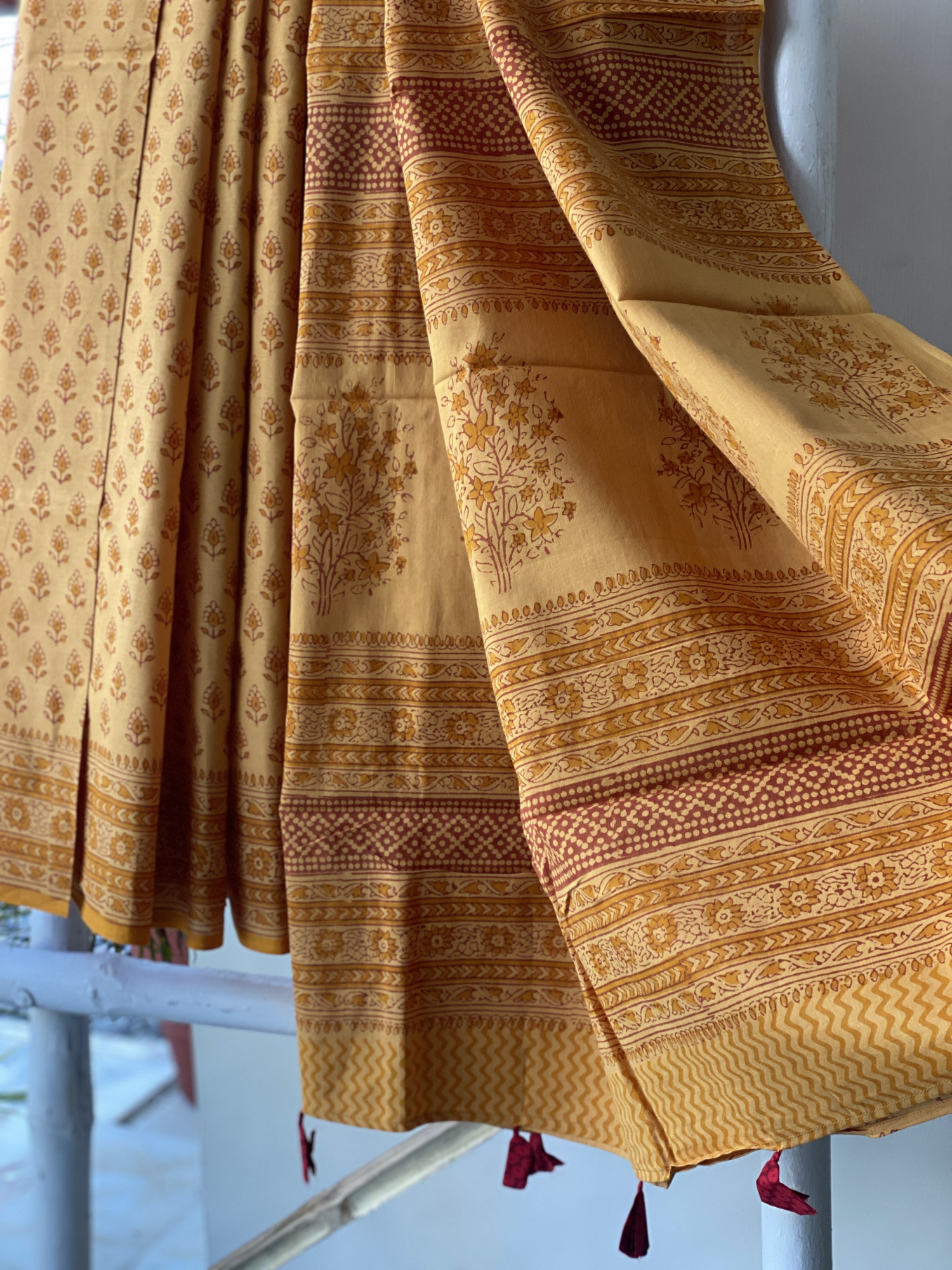 MUSTARD Cotton mull hand block print sari, accessorised with tassles. Comes with A RUST COTTON HAND BLOCK PRINT blouse