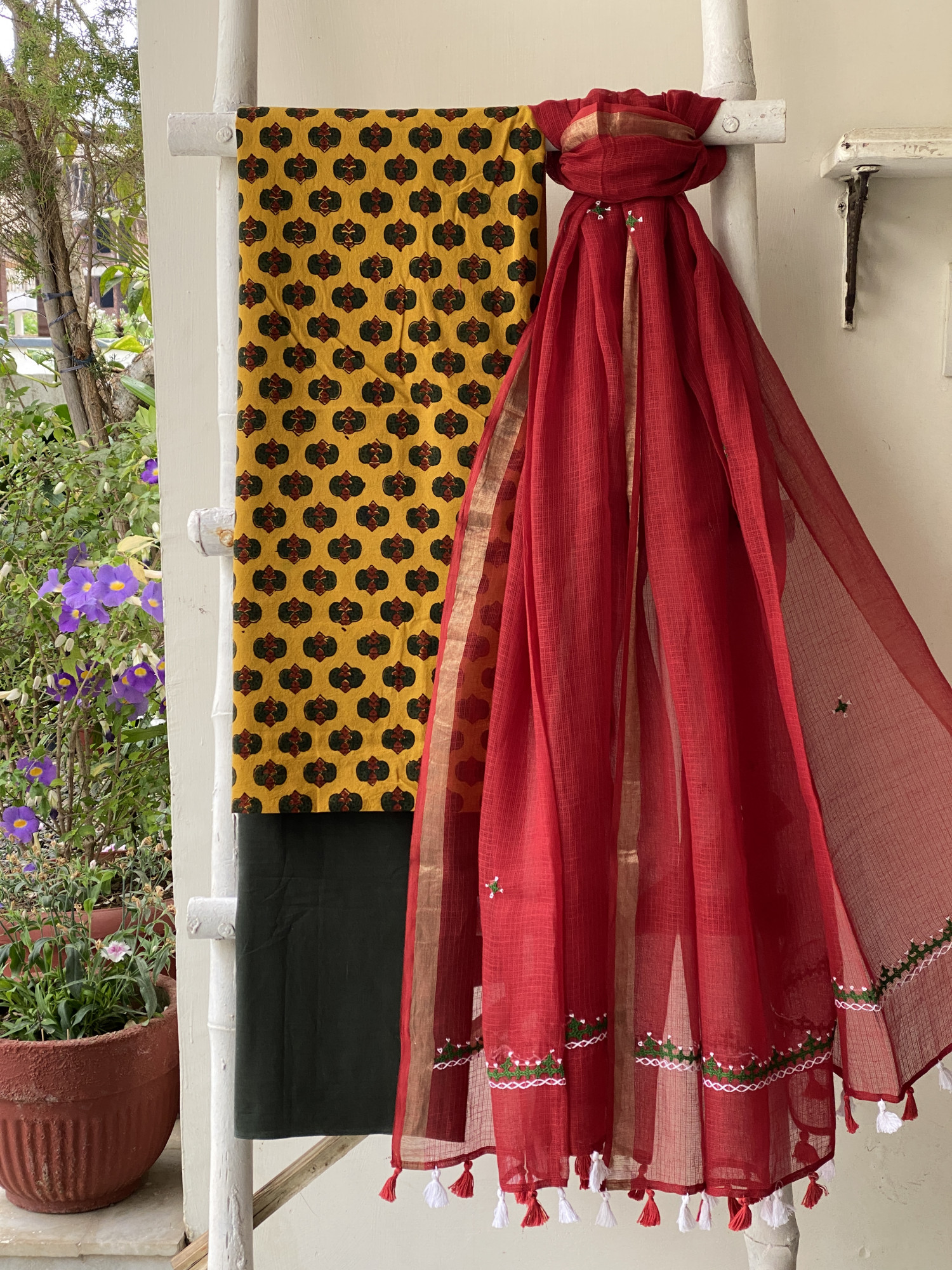 MUSTARD AJRAKH HAND BLOCK PRINT COTTON SHIRT AND A BOTTLE GREEN PLAIN COTTON BOTTOM PAIRED WITH A RED KOTA HAND EMBROIDERED DUPATTA WITH ZARI WOVEN BORDER, ACCESSORISED WITH TASSLES.