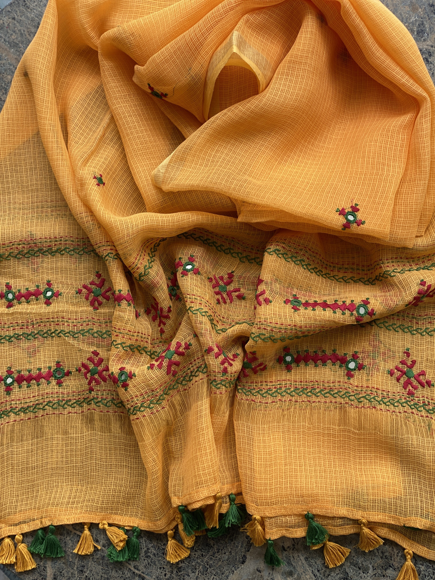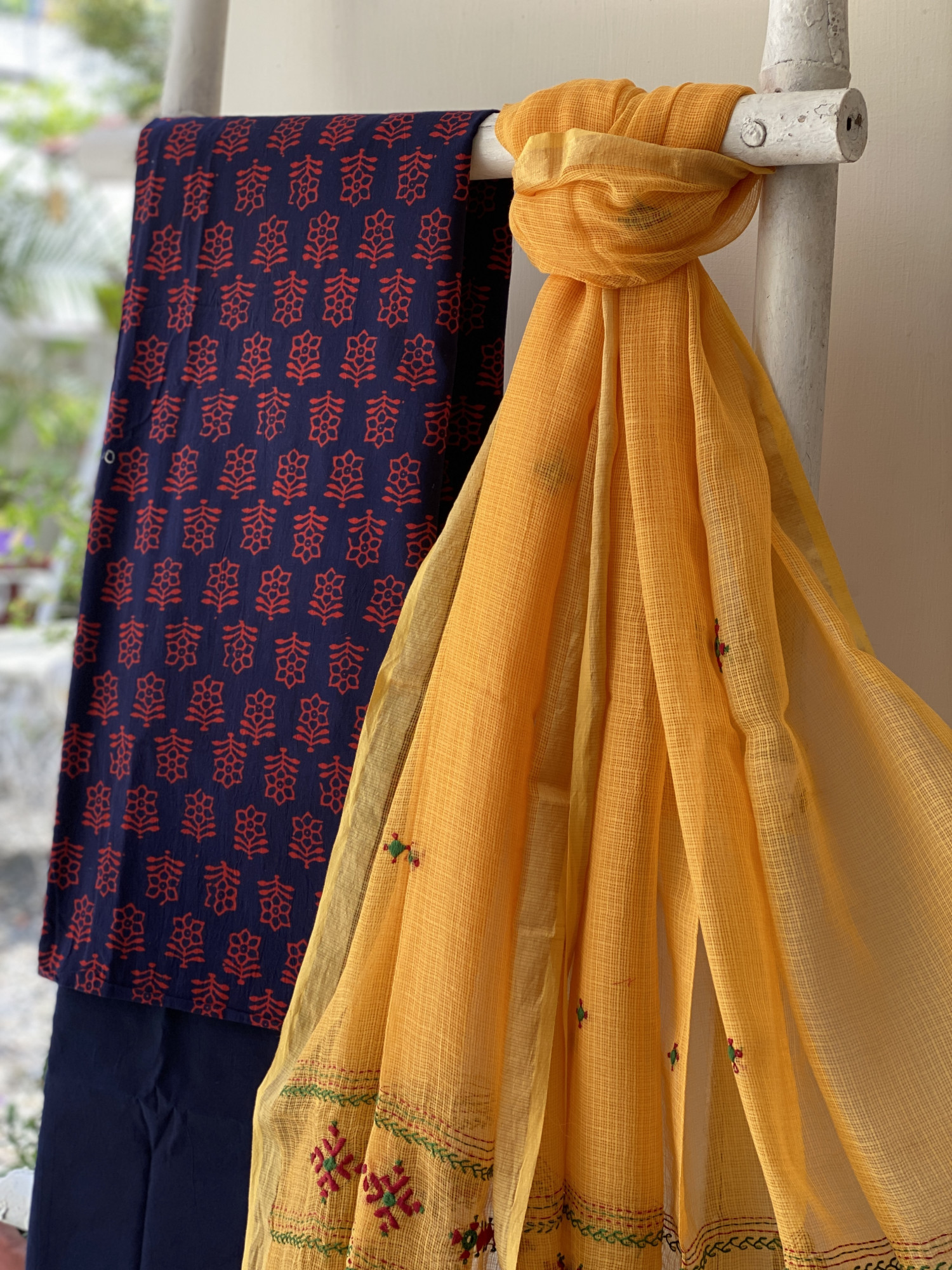 NAVY BLUE HAND BLOCK PRINT COTTON SHIRT AND A NAVY BLUE COTTON PLAIN BOTTOM PAIRED WITH A YELLOW KOTA HAND EMBROIDERED DUPATTA WITH ZARI WOVEN BORDER, ACCESSORISED WITH TASSLES.