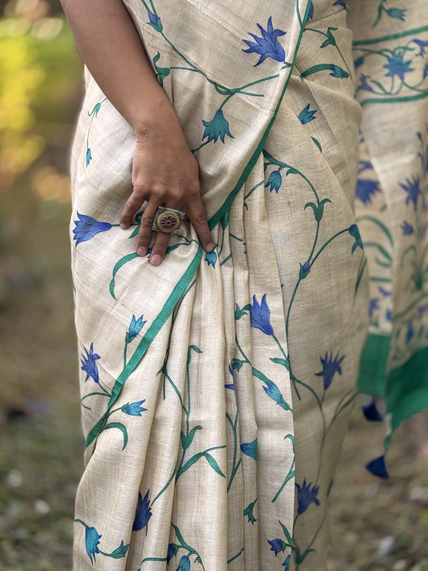 OFF WHITE-AQUA BLOCK PRINT TUSSAR SILK SARI