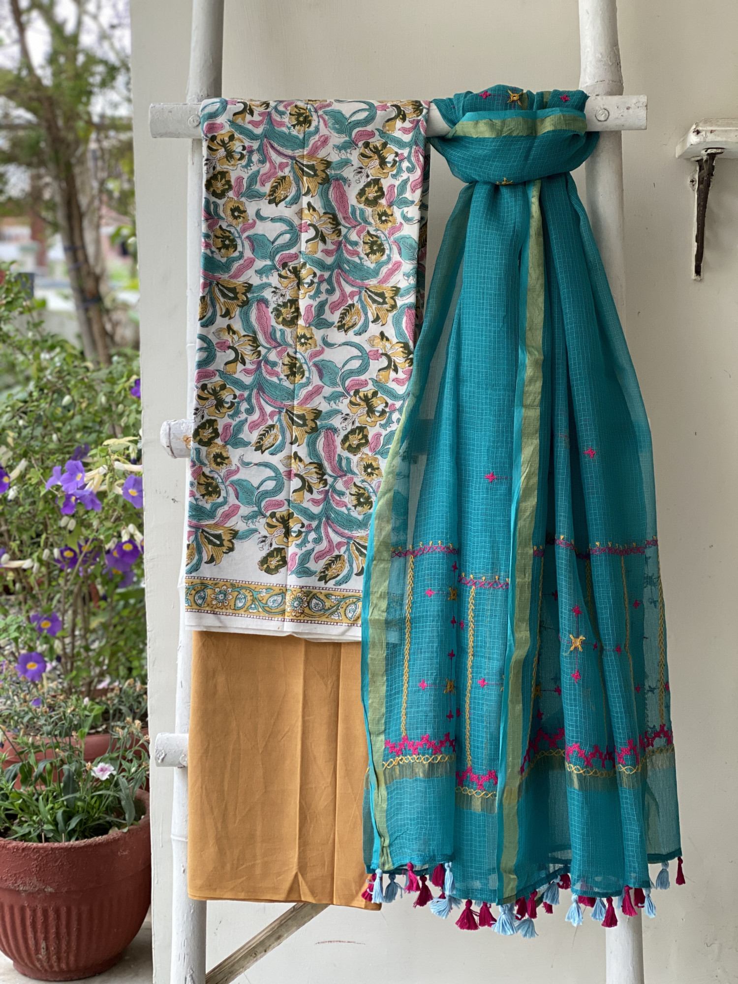 OFF WHITE HAND BLOCK PRINT COTTON SHIRT AND A MUSTARD PLAIN COTTON BOTTOM PAIRED WITH AN AQUA KOTA HAND EMBROIDERED DUPATTA WITH ZARI WOVEN BORDER, ACCESSORISED WITH TASSLES.