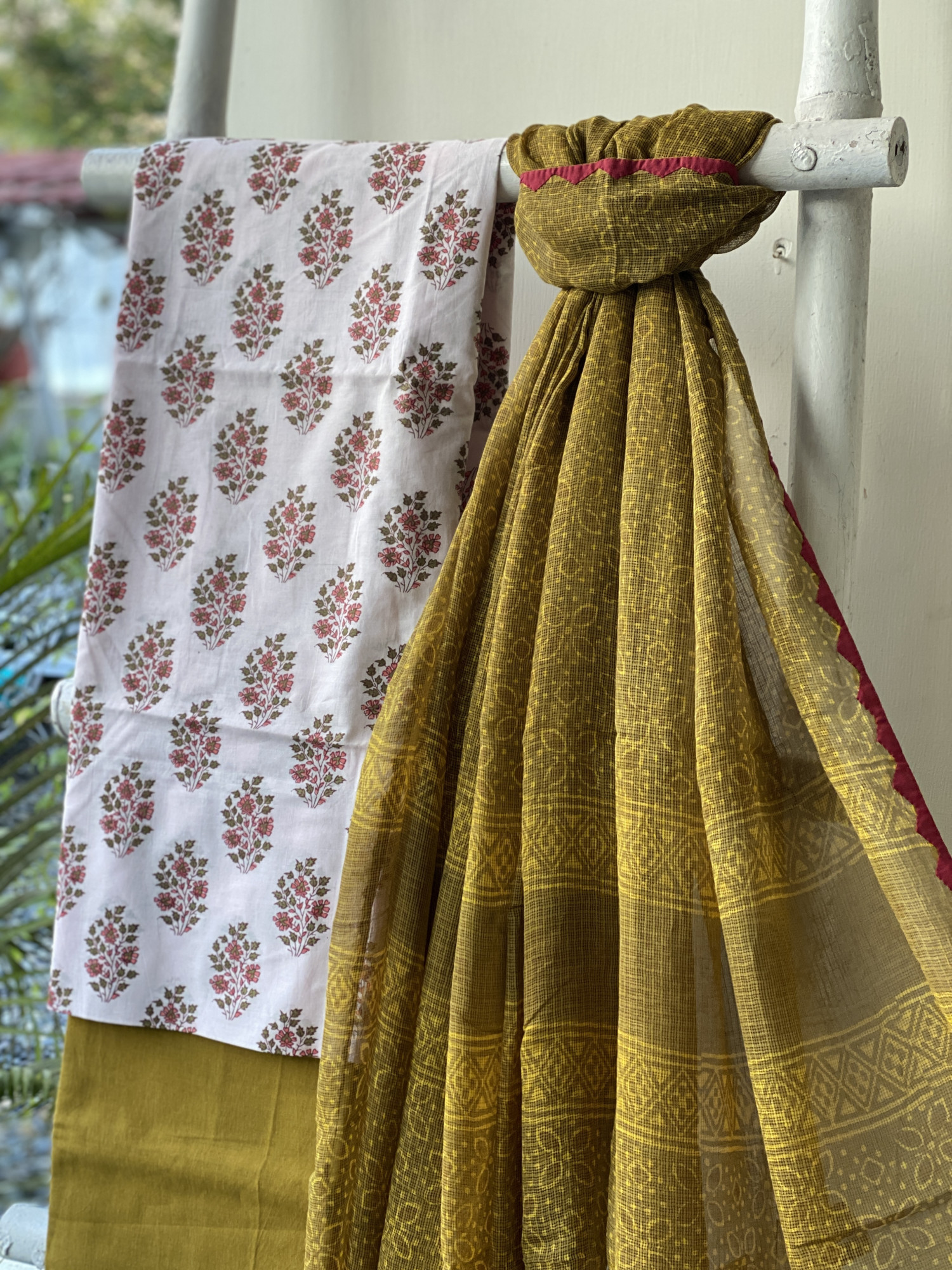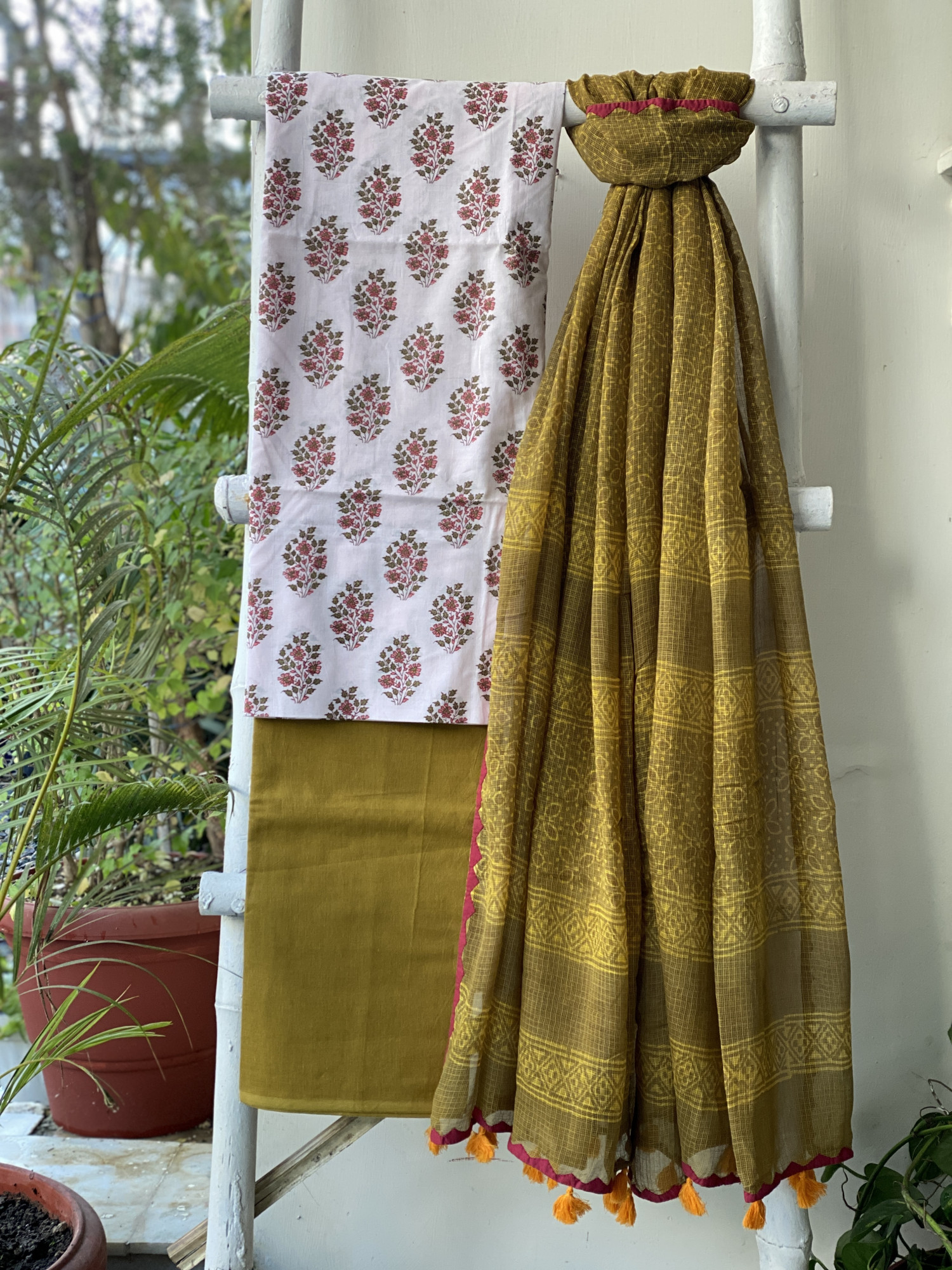 OFF WHITE HANDBLOCK PRINT COTTON SHIRT & MEHNDI GREEN COTTON PLAIN BOTTOM, PAIRED WITH A MEHNDI GREEN KOTA HAND BLOCK PRINTED DUPATTA WITH APPLIQUE BORDERS, ACCESSORISED WITH TASSLES.