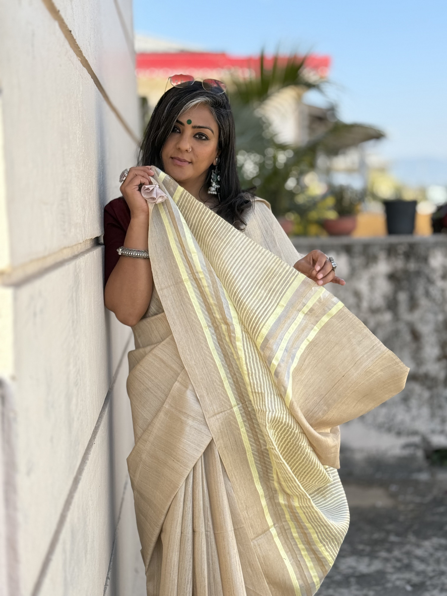 BEIGE HAND WOVEN TUSSAR SILK SARI WITH ZARI WOVEN BORDER AND LEMON AND SILVER ZARI STRIPED PALLA, ACCESSORISED WITH TASSLES.