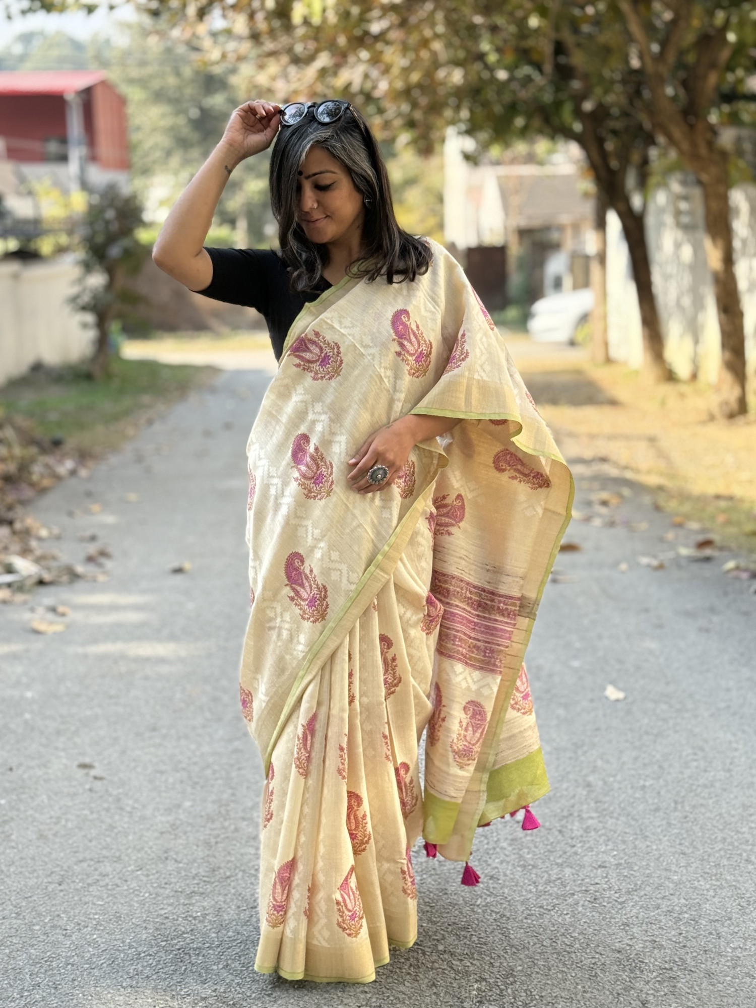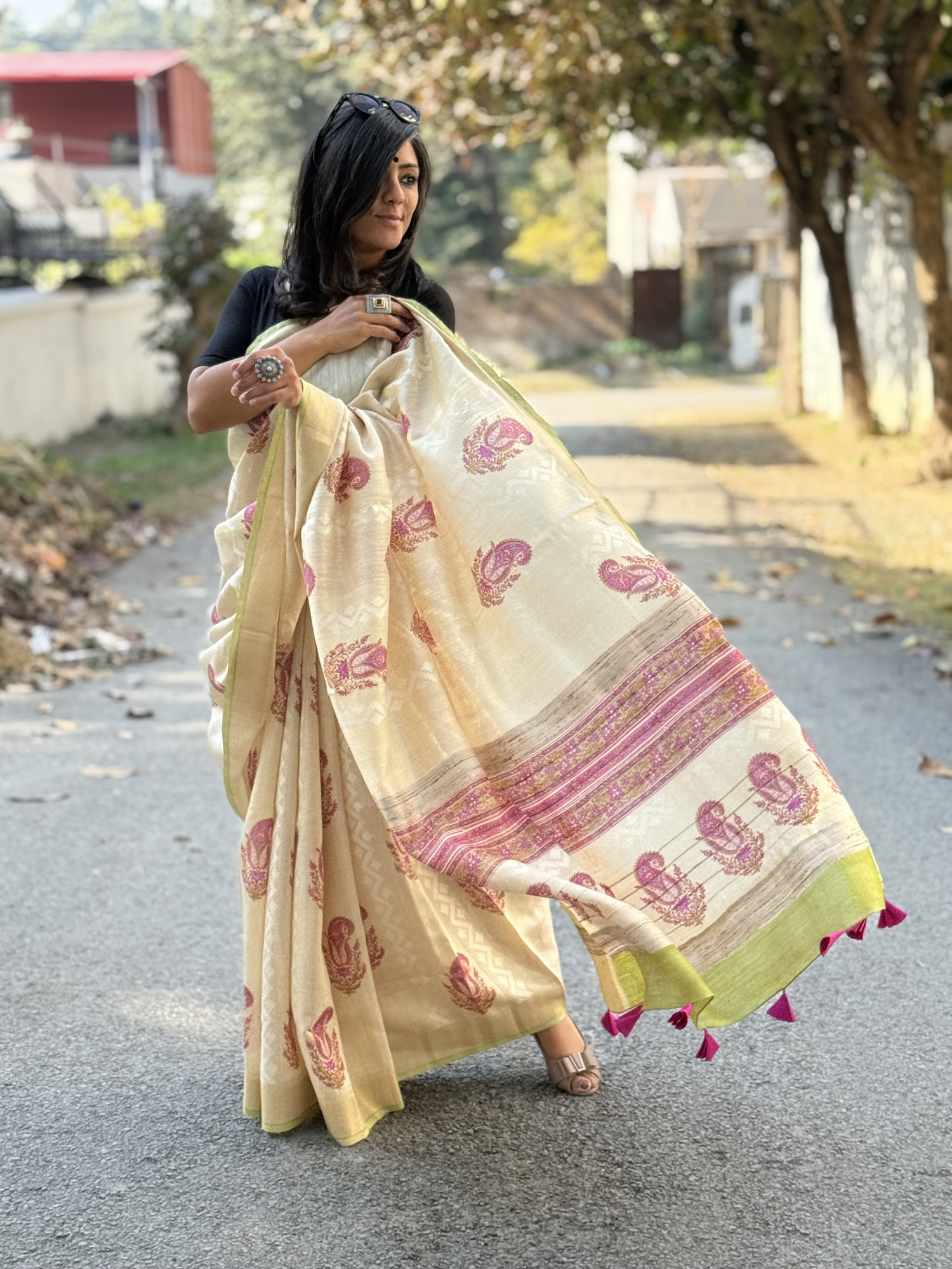 OFF WHITE-PINK HAND BLOCK PRINT HANDLOOM SILK SARI WITH JAMDANI WEAVE AND ZARI BORDER, ACCESSORISED WITH TASSLES.