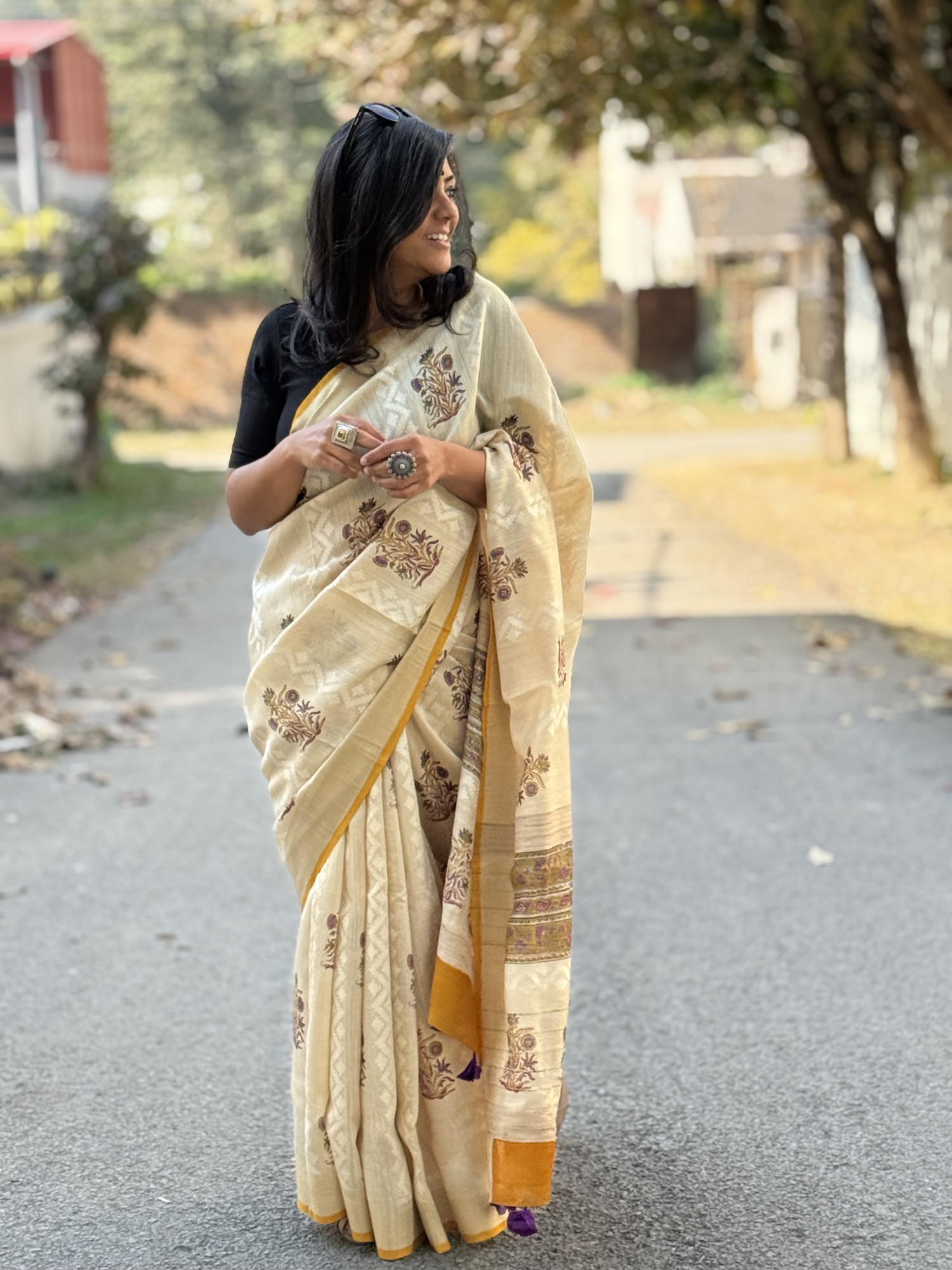 OFF WHITE-PURPLE HAND BLOCK PRINT HANDLOOM SILK SARI WITH JAMDANI WEAVE AND ZARI BORDER, ACCESSORISED WITH TASSLES.