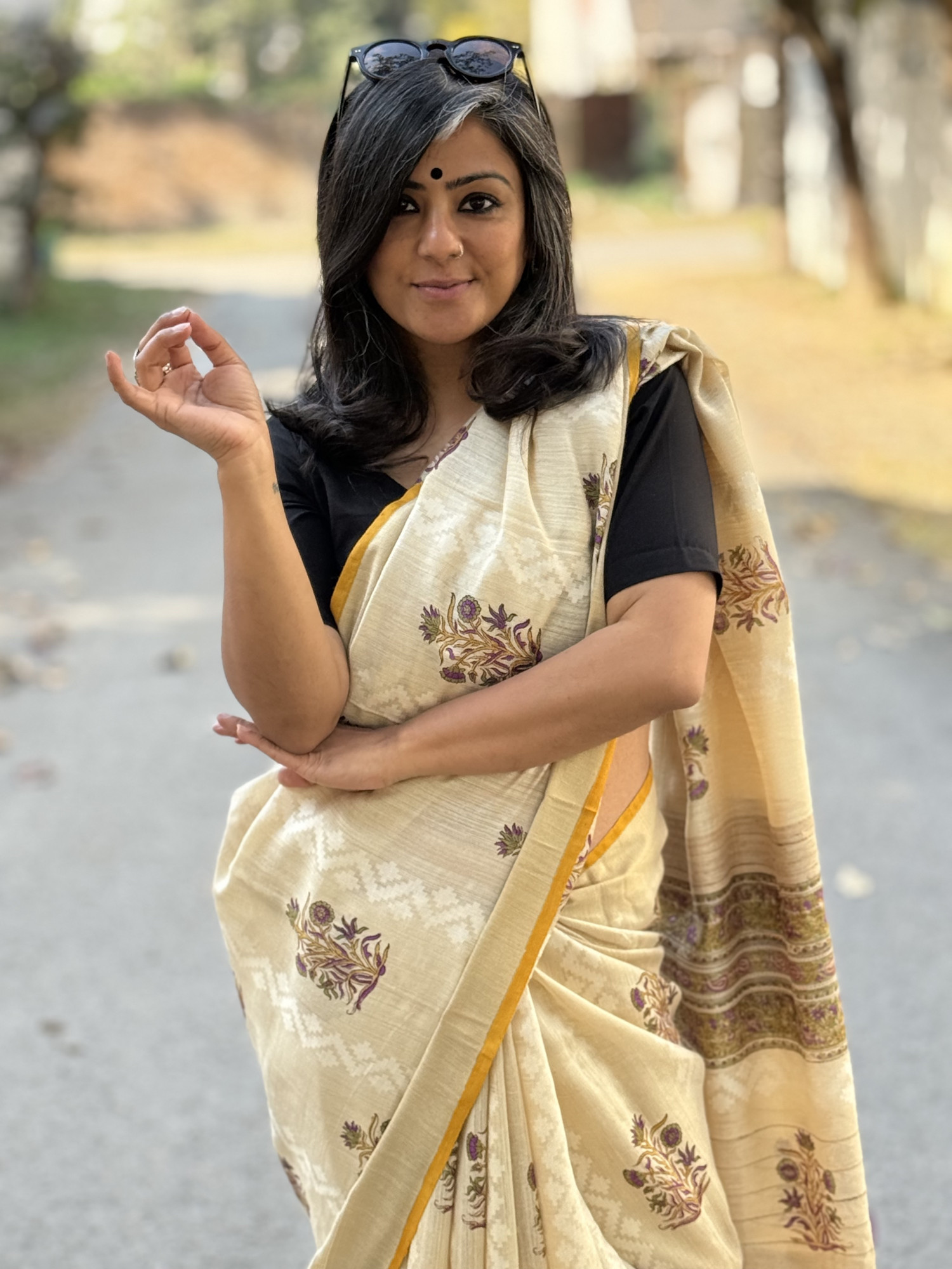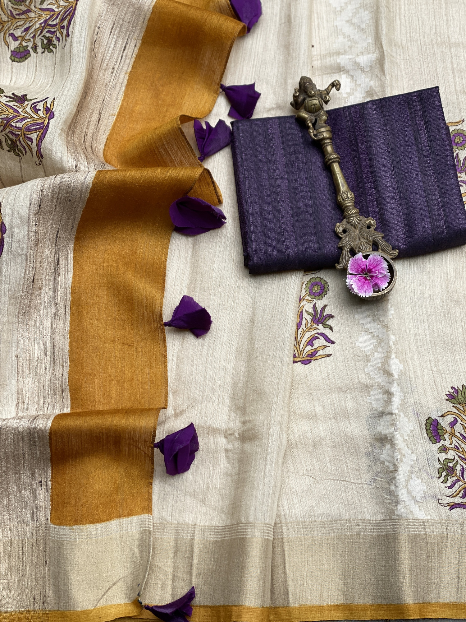 OFF WHITE-PURPLE HAND BLOCK PRINT HANDLOOM SILK SARI