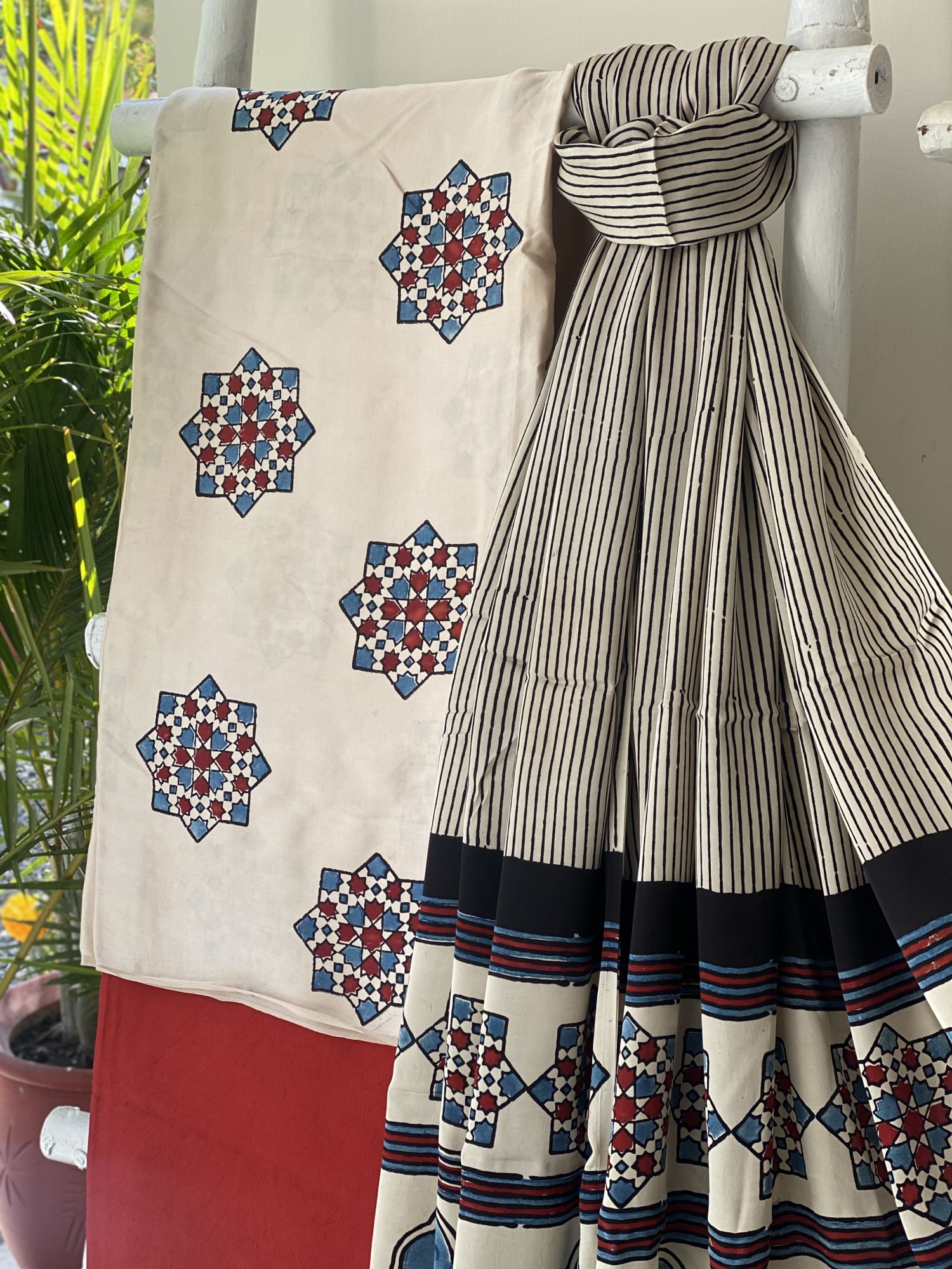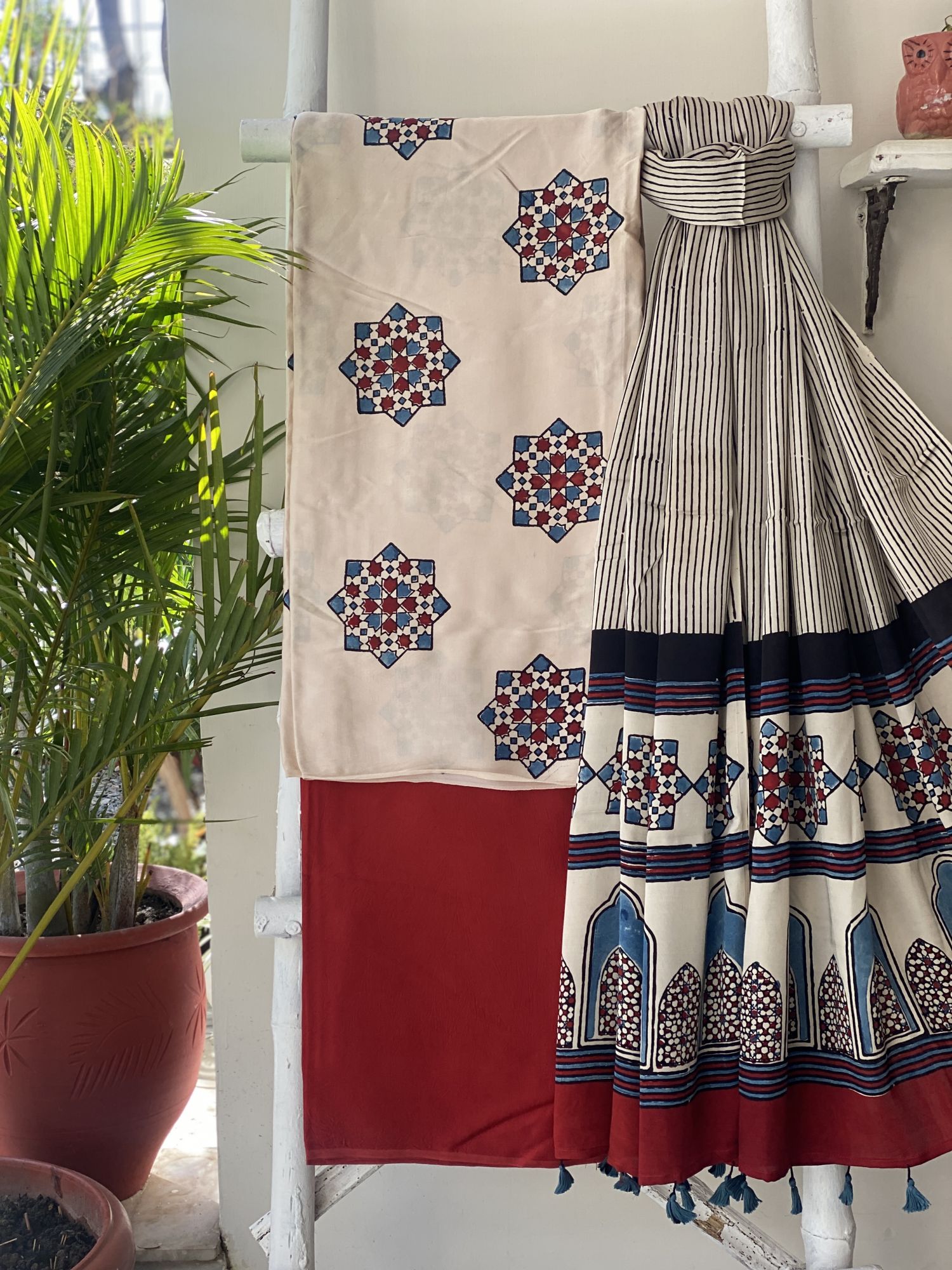 OFF WHITE hand dyed ajrakh block print modal silk shirt and RUST-RED MODAL SILK PLAIN BOTTOM paired with AN OFF WHITE modal silk ajrakh block print dupatta, accessorised with tassles.