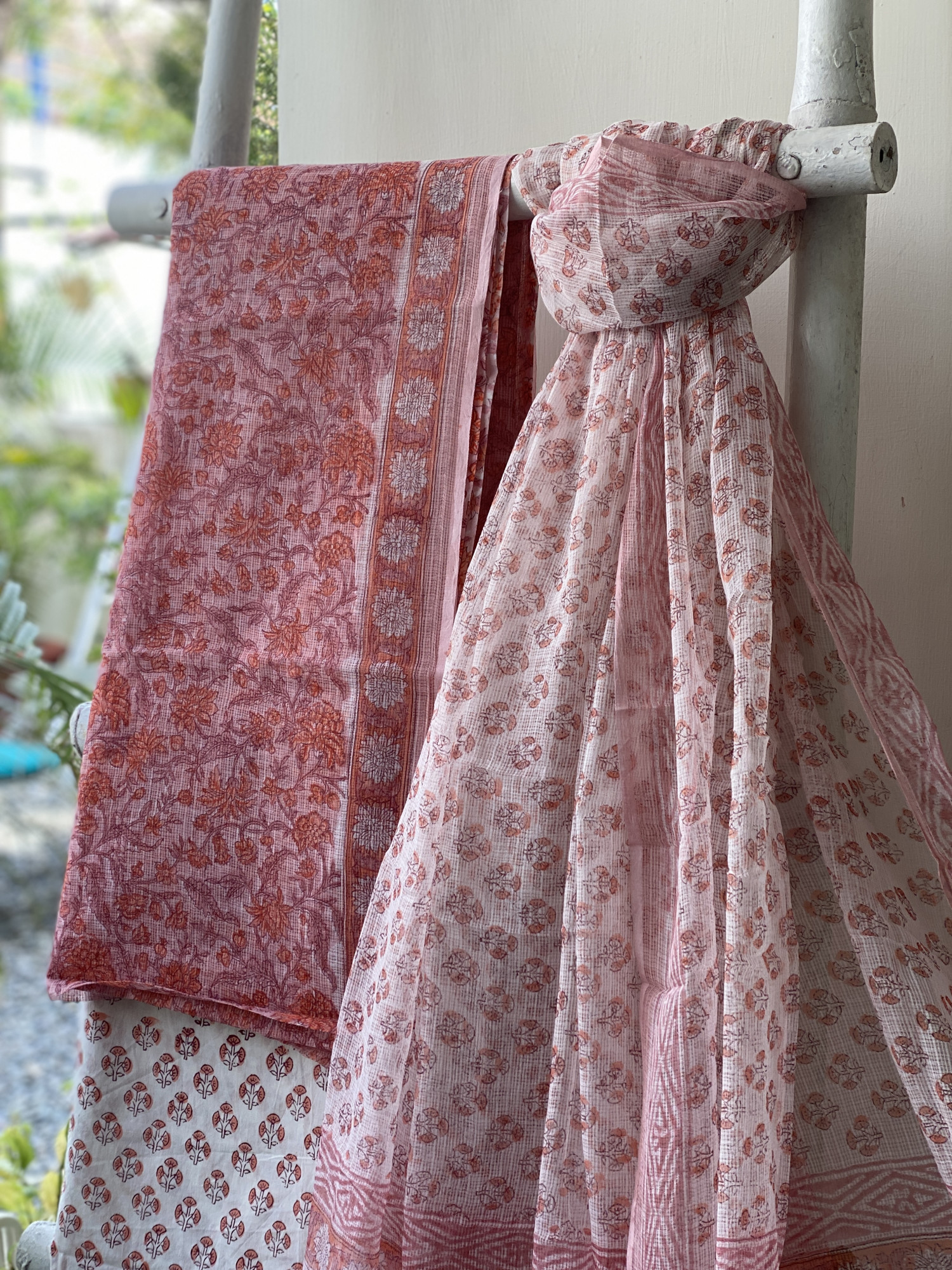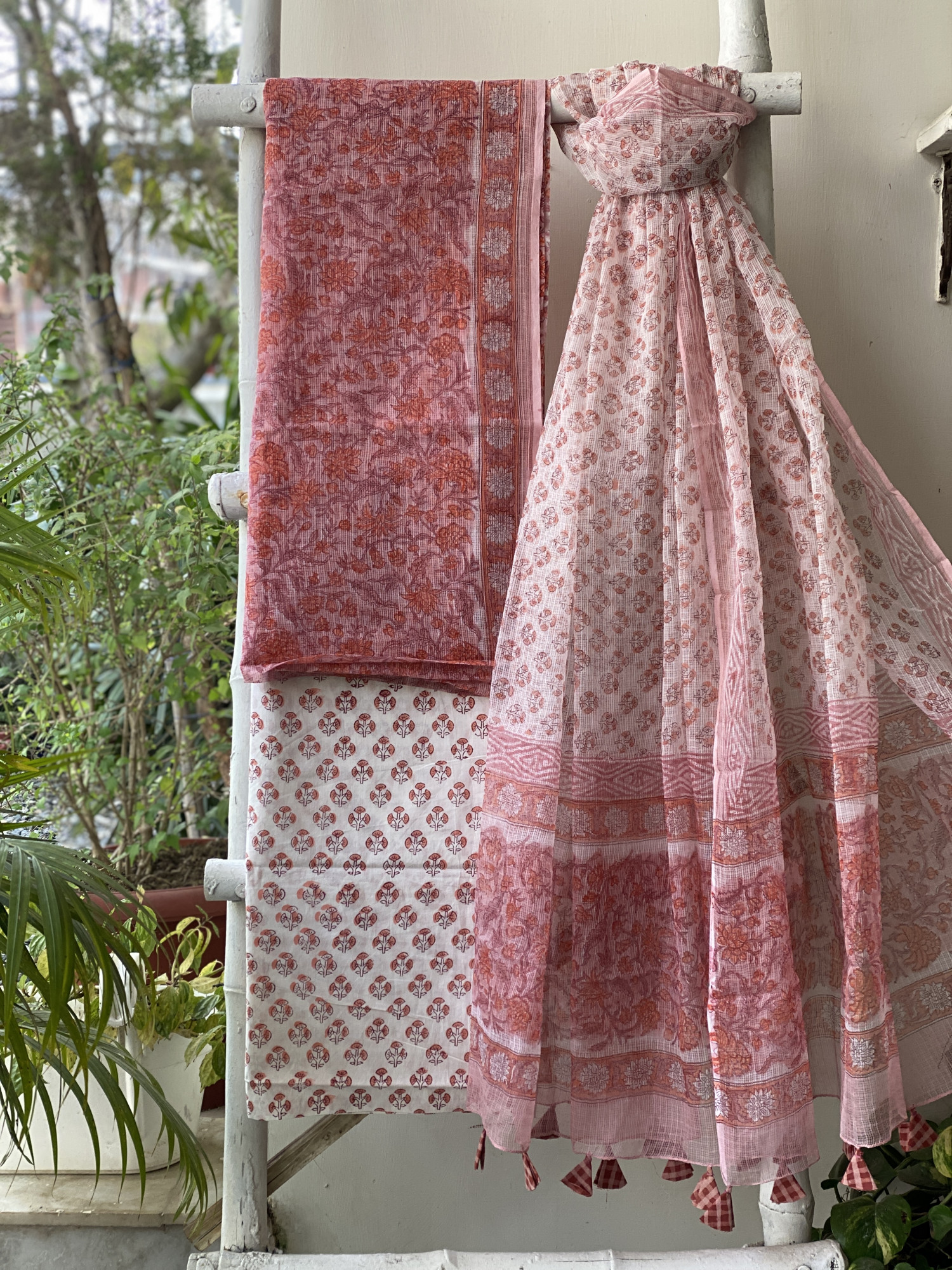 PEACH HAND BLOCK PRINT KOTA SHIRT (COMES WITH A MATCHING COTTON LINING PIECE) AND AN OFF WHITE COTTON BLOCK PRINT BOTTOM PAIRED WITH AN OFF WHITE-PEACH KOTA BLOCK PRINT DUPATTA, ACCESSORISED WITH TASSLES.