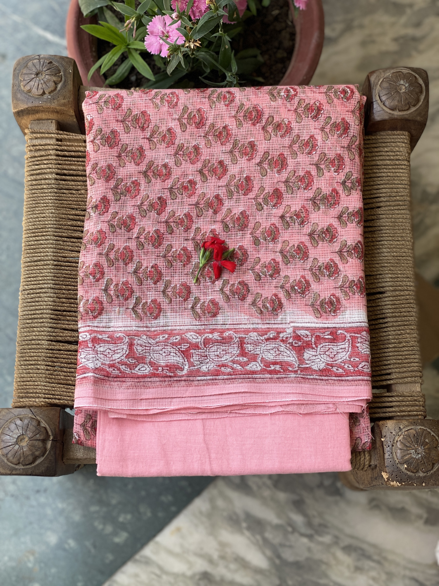 PEACH HAND BLOCK PRINT KOTA SHIRT (COMES WITH A MATCHING COTTON LINING PIECE) AND AN OFF WHITE COTTON BLOCK PRINT BOTTOM PAIRED WITH AN OFF WHITE KOTA BLOCK PRINT DUPATTA, ACCESSORISED WITH TASSLES.