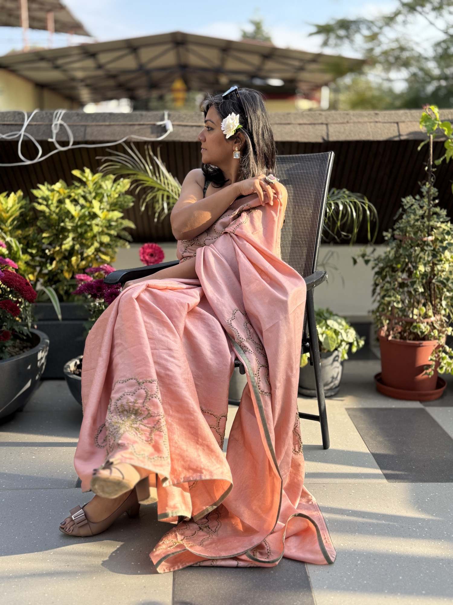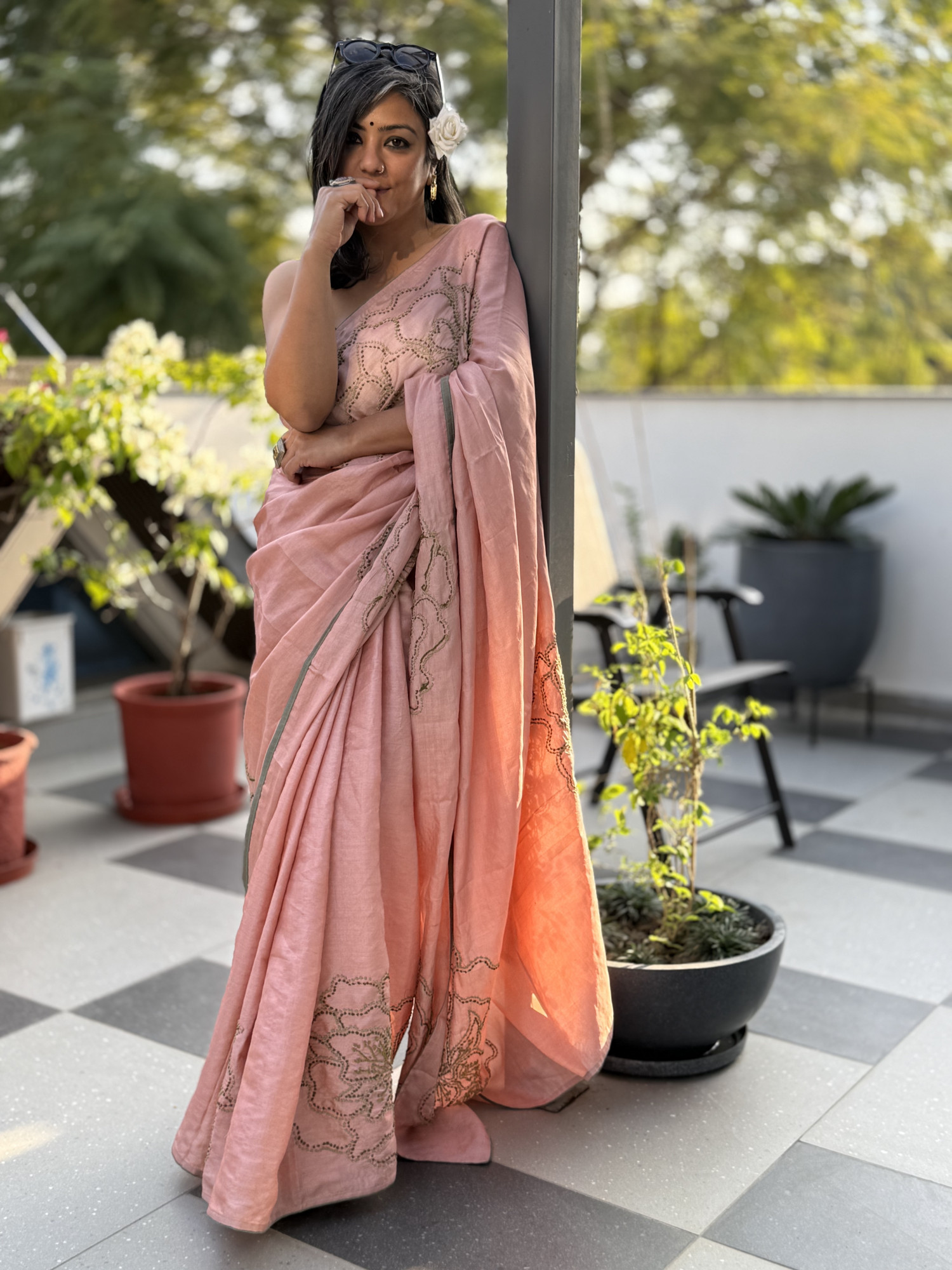 PEACH NATURAL DYED TUSSAR SILK SARI WITH HAND EMBROIDERY ALL OVER , ACCESSORISED WITH TAPINGS.