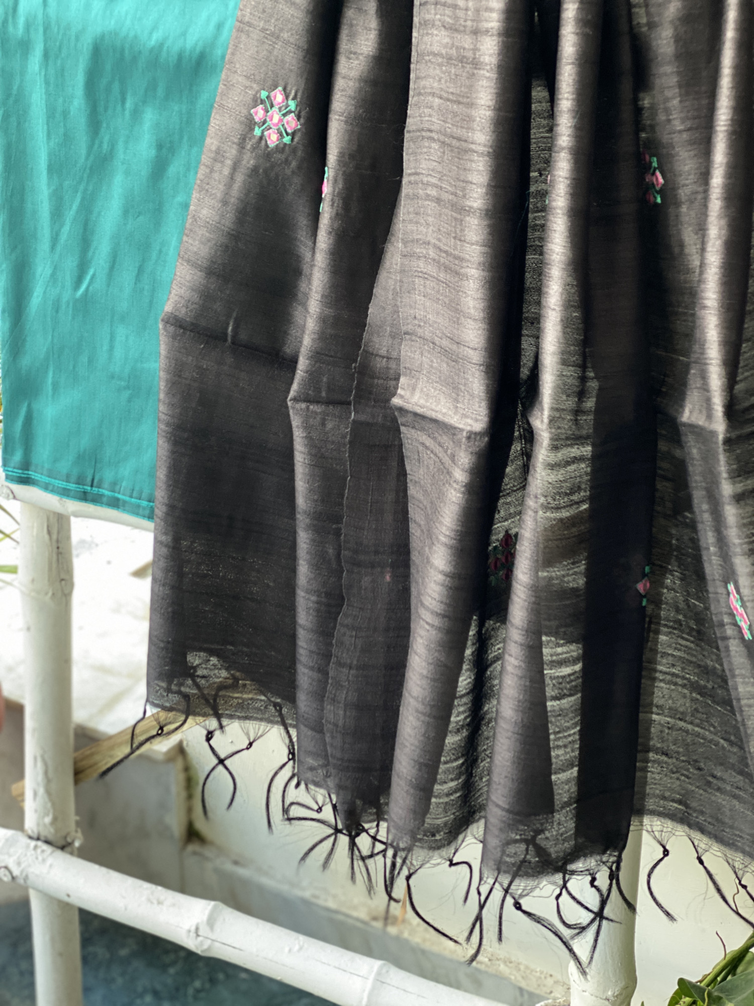 PEACOCK BLUE SILK SHIRT AND BOTTOM PAIRED WITH A BLACK TUSSAR SILK MANUAL MACHINE EMBROIDERED DUPATTA . ACCESSORISED WITH TASSELS