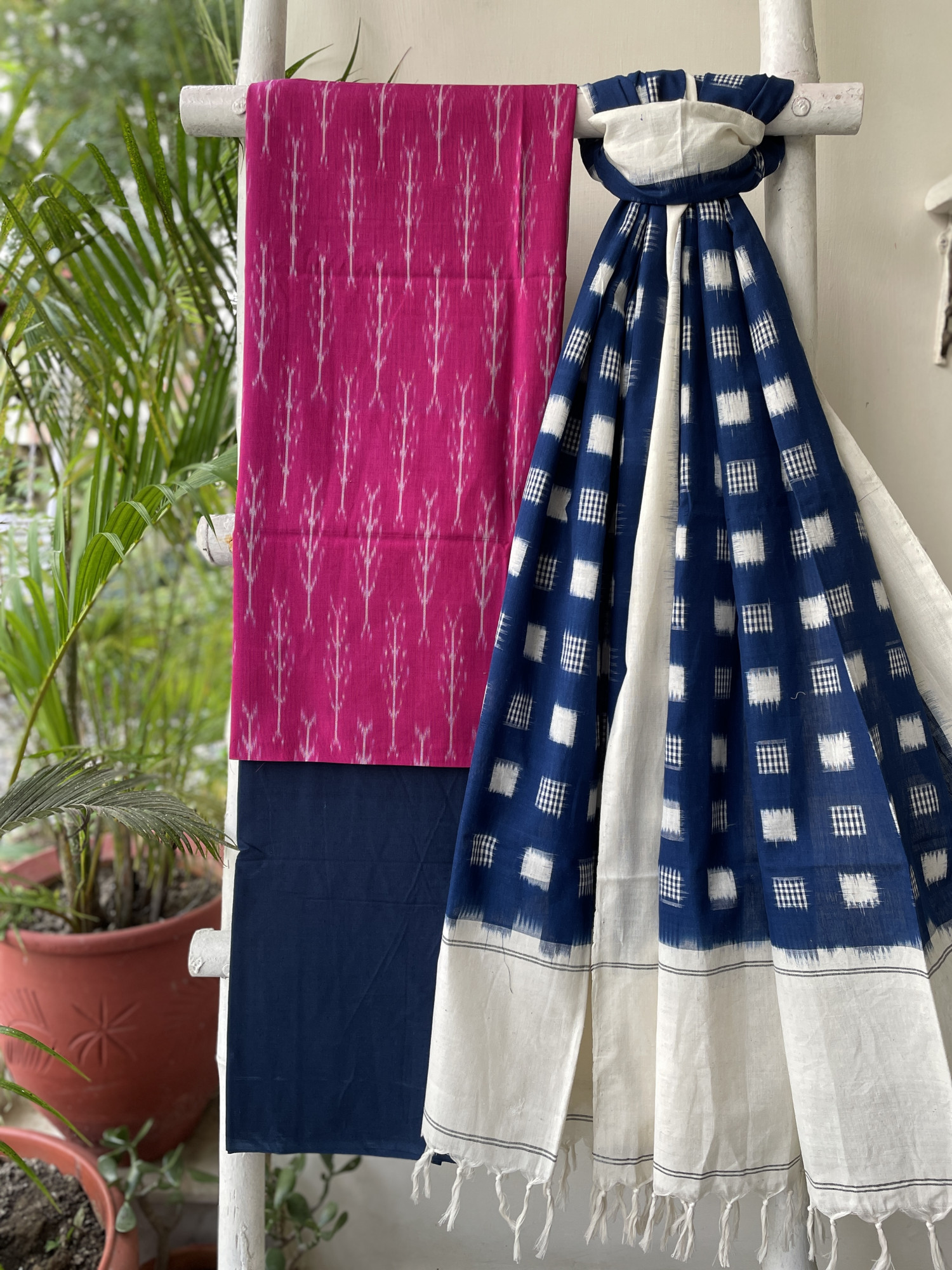 PINK MERCERISED COTTON WOVEN IKKAT SHIRT WITH INDIGO COTTON BOTTOM paired with a INDIGO -OFF WHITE COTTON WOVEN IKKAT dupatta
