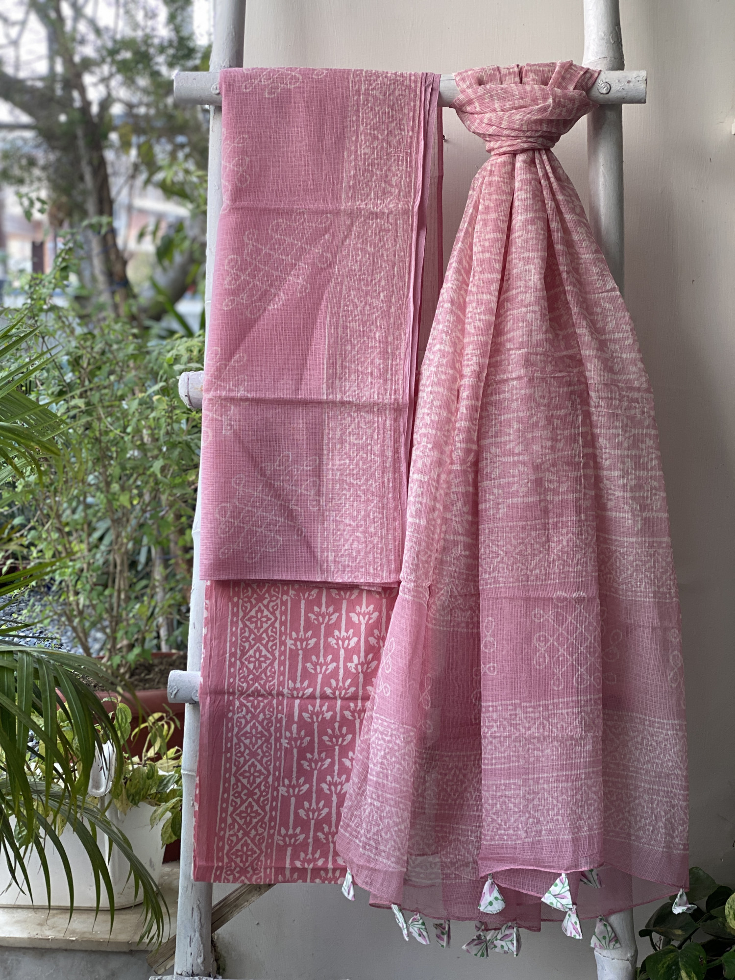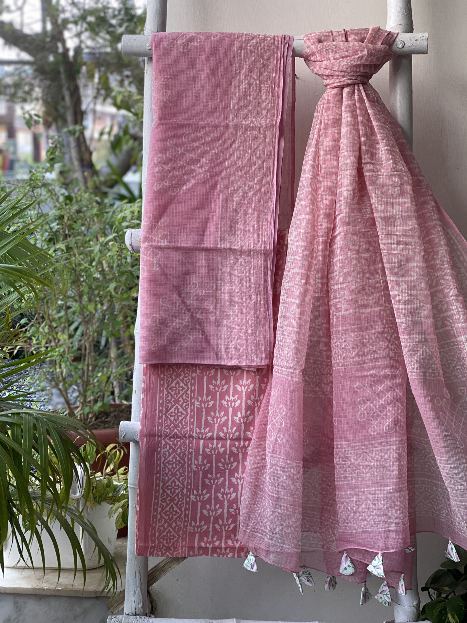 PINK HAND BLOCK PRINT KOTA SHIRT (COMES WITH A MATCHING COTTON LINING PIECE) AND A PINK COTTON BLOCK PRINT BOTTOM PAIRED WITH A PINK KOTA BLOCK PRINT DUPATTA, ACCESSORISED WITH TASSLES.