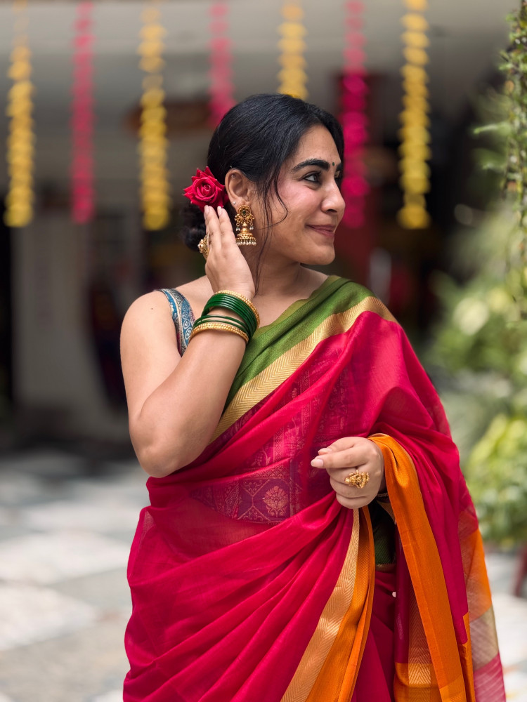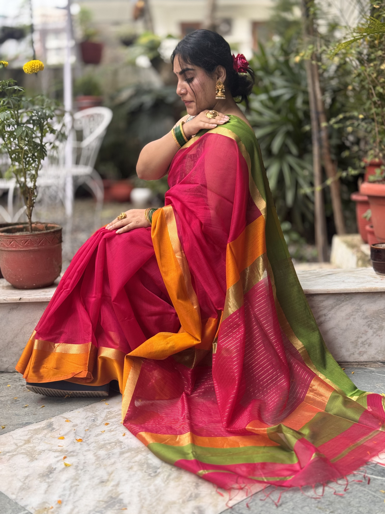 PINK MAHESHWARI SILK AND COTTON SARI WITH WOVEN RESHAM- ZARI BORDER AND PALLA .