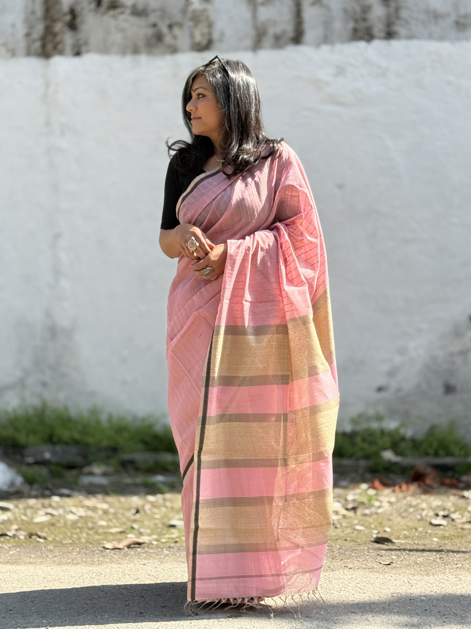 PINK MAHESHWARI SILK AND COTTON JUTE WOVEN STRIPED SARI WITH RESHAM BORDER AND JUTE WOVEN PALLA.