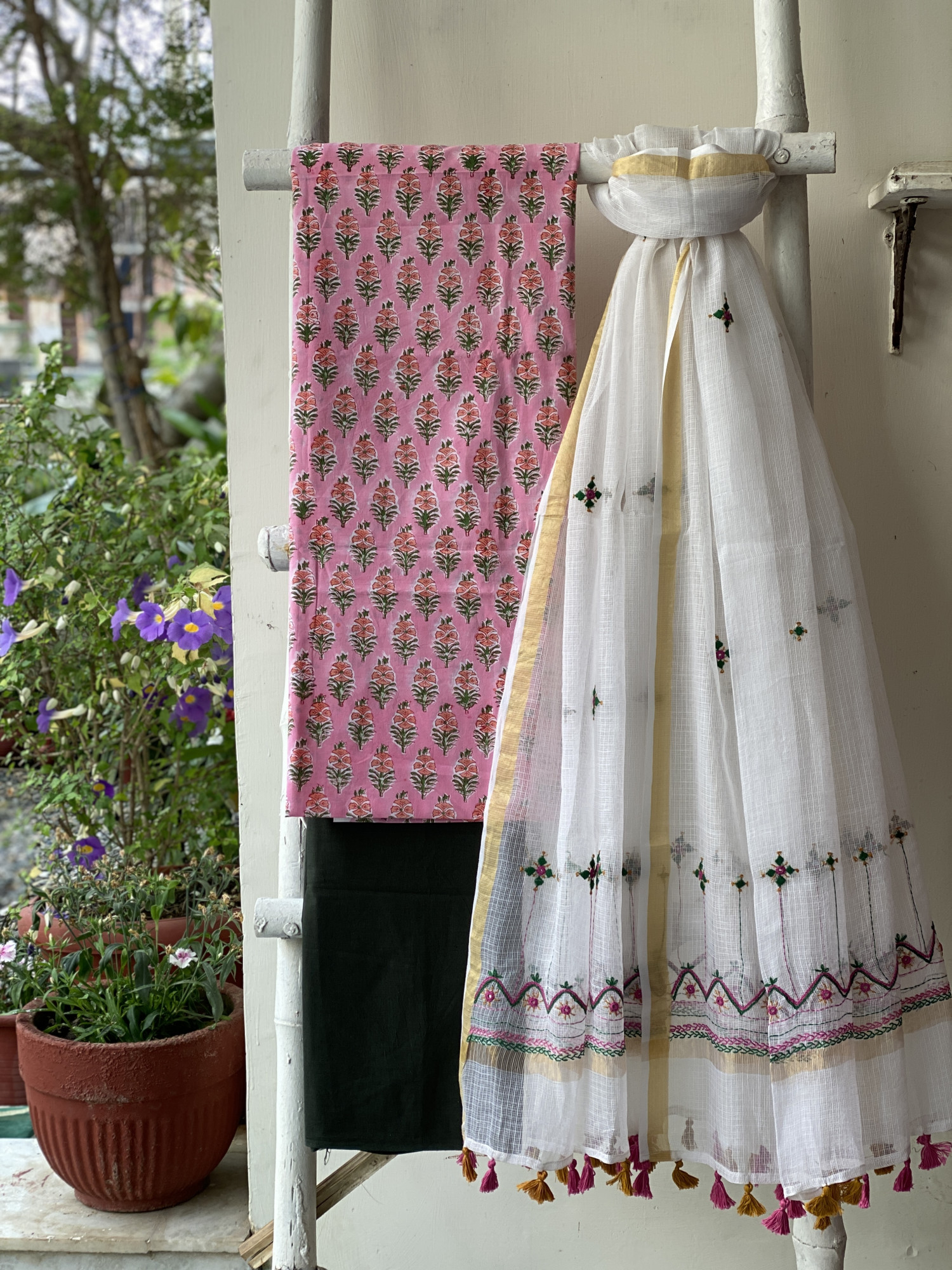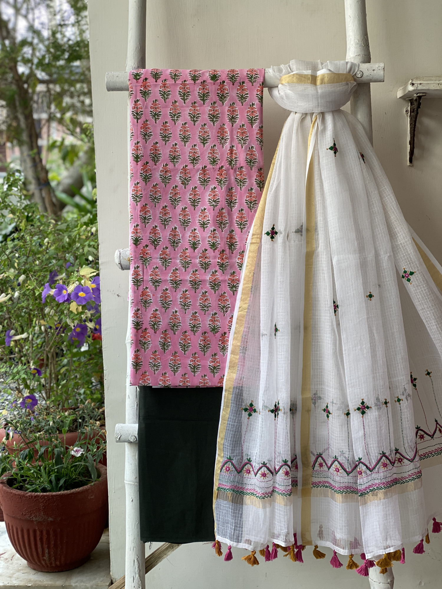 PINK HAND BLOCK PRINT COTTON SHIRT AND A BOTTLE GREEN PLAIN COTTON BOTTOM PAIRED WITH AN OFF WHITE KOTA HAND EMBROIDERED DUPATTA WITH ZARI WOVEN BORDER, ACCESSORISED WITH TASSLES.