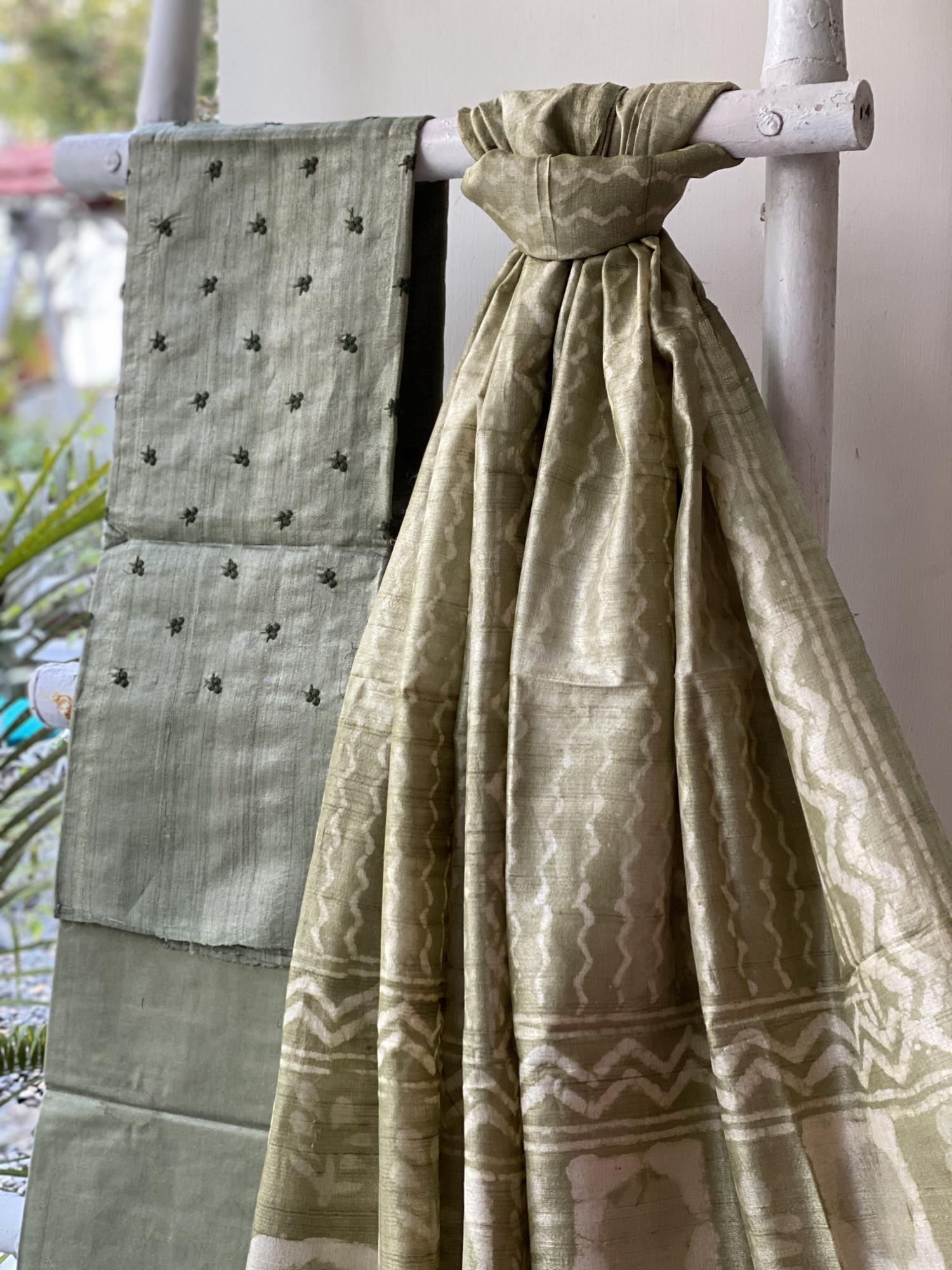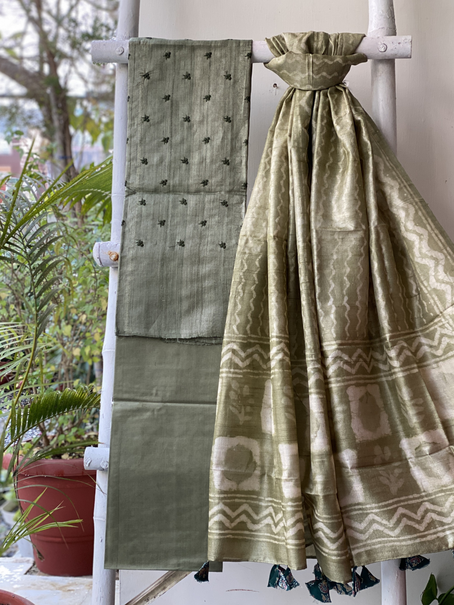 PISTA GREEN TUSSAR SILK SHIRT WITH EMBROIDERY AND PISTA GREEN HANDLOOM SILK BOTTOM PAIRED WITH A PISTA GREEN TUSSAR SILK BATIK DUPATTA . ACCESSORISED WITH TASSELS