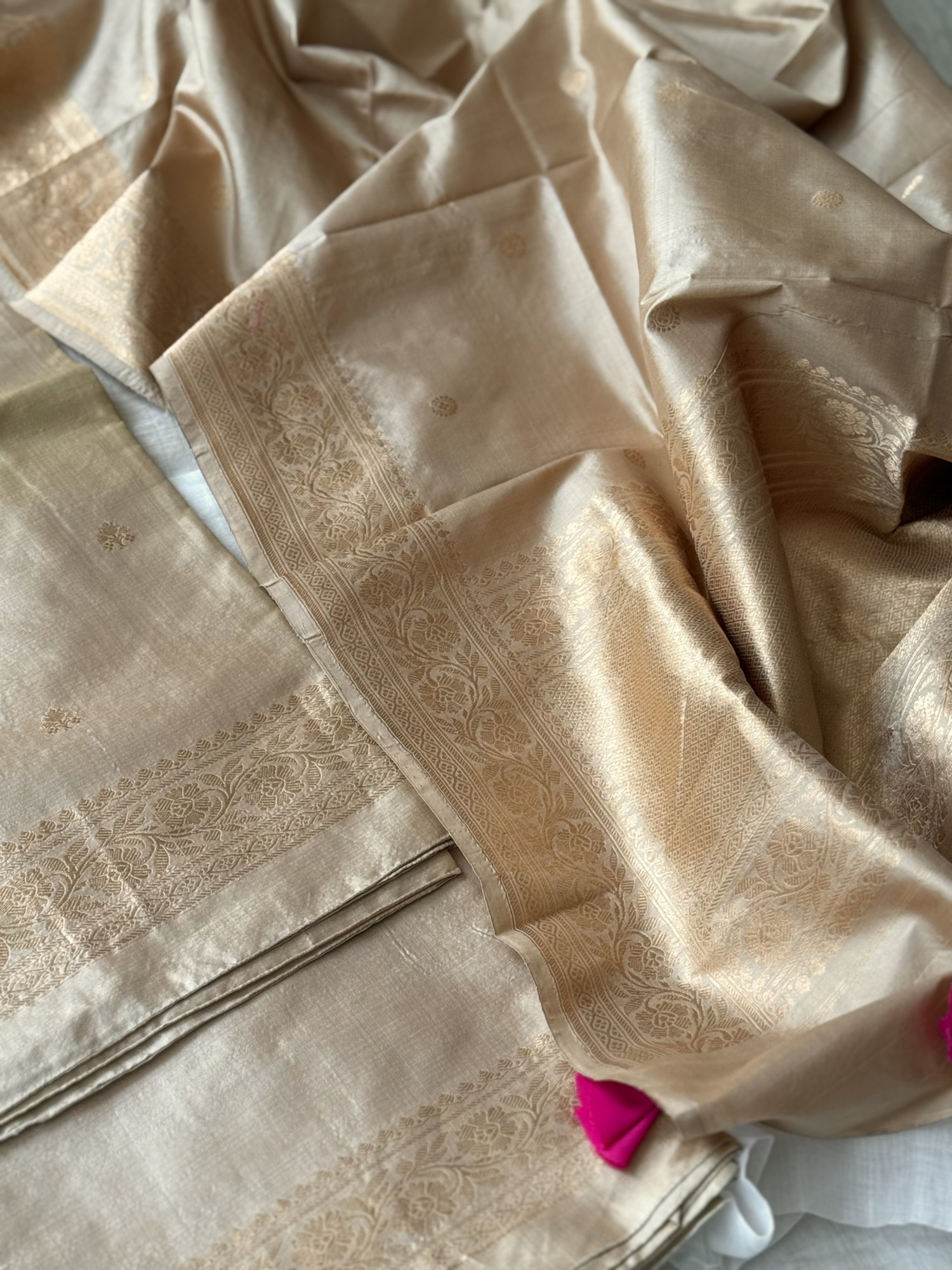 BEIGE BANARSI SILK SHIRT AND BOTTOM WITH ZARI WOVEN BOOTAS AND BORDER PAIRED WITH BEIGE ZARI WOVEN BANARSI SILK DUPATTA, ACCESSORISED WITH TASSELS.