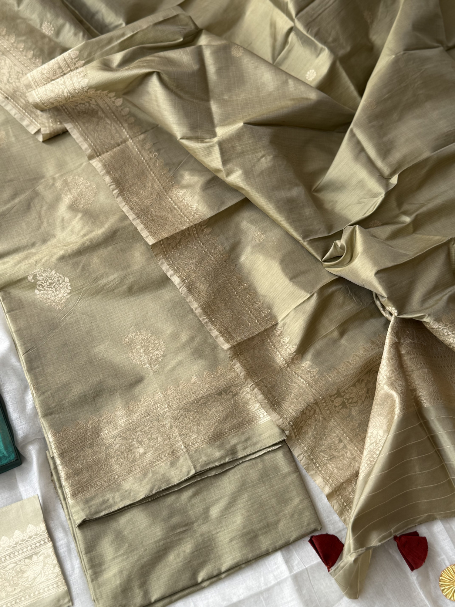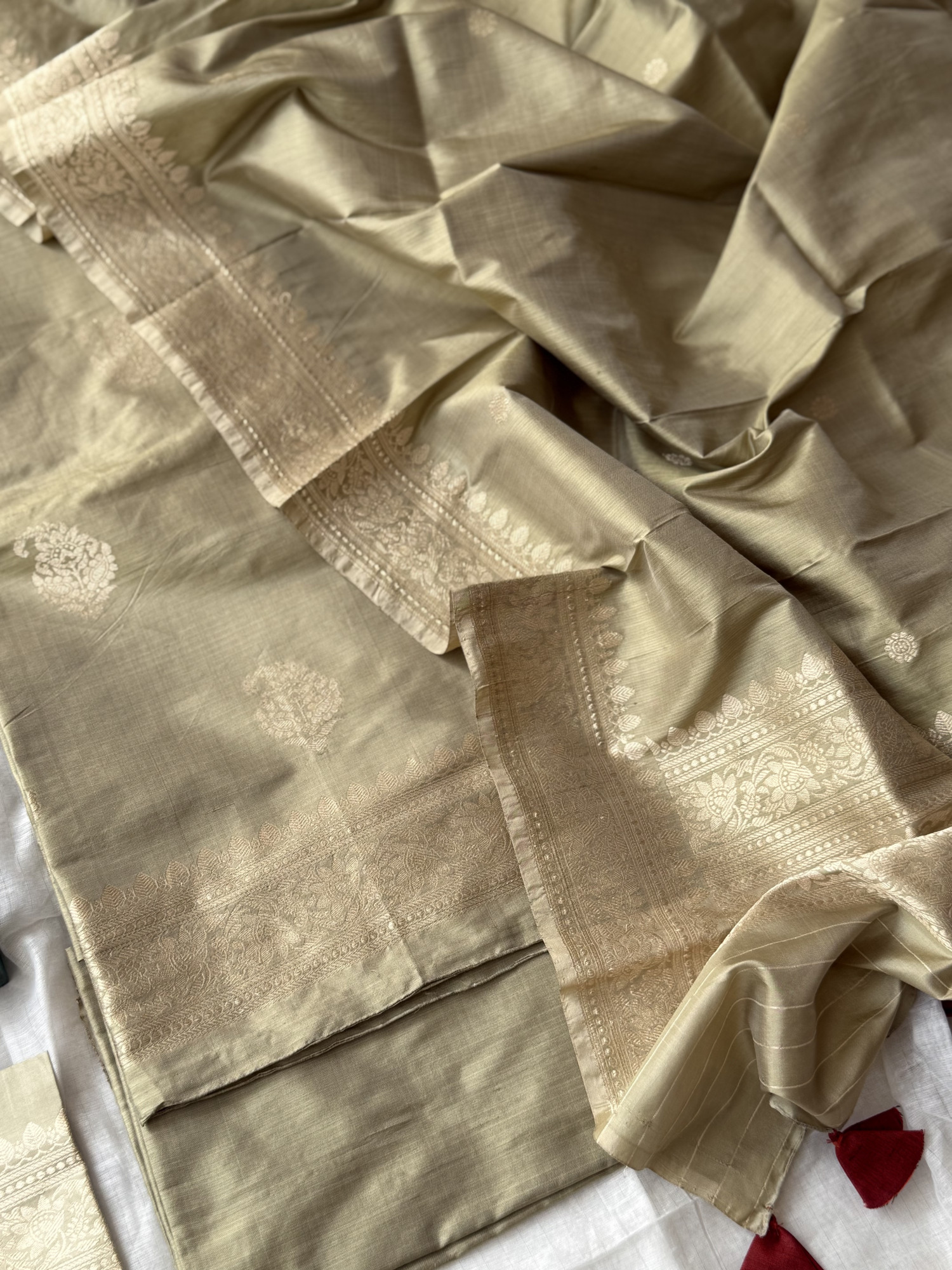 PISTA GREEN BANARSI SILK SHIRT AND BOTTOM WITH ZARI WOVEN BOOTAS AND BORDER PAIRED WITH PISTA GREEN ZARI WOVEN BANARSI SILK DUPATTA, ACCESSORISED WITH TASSELS.