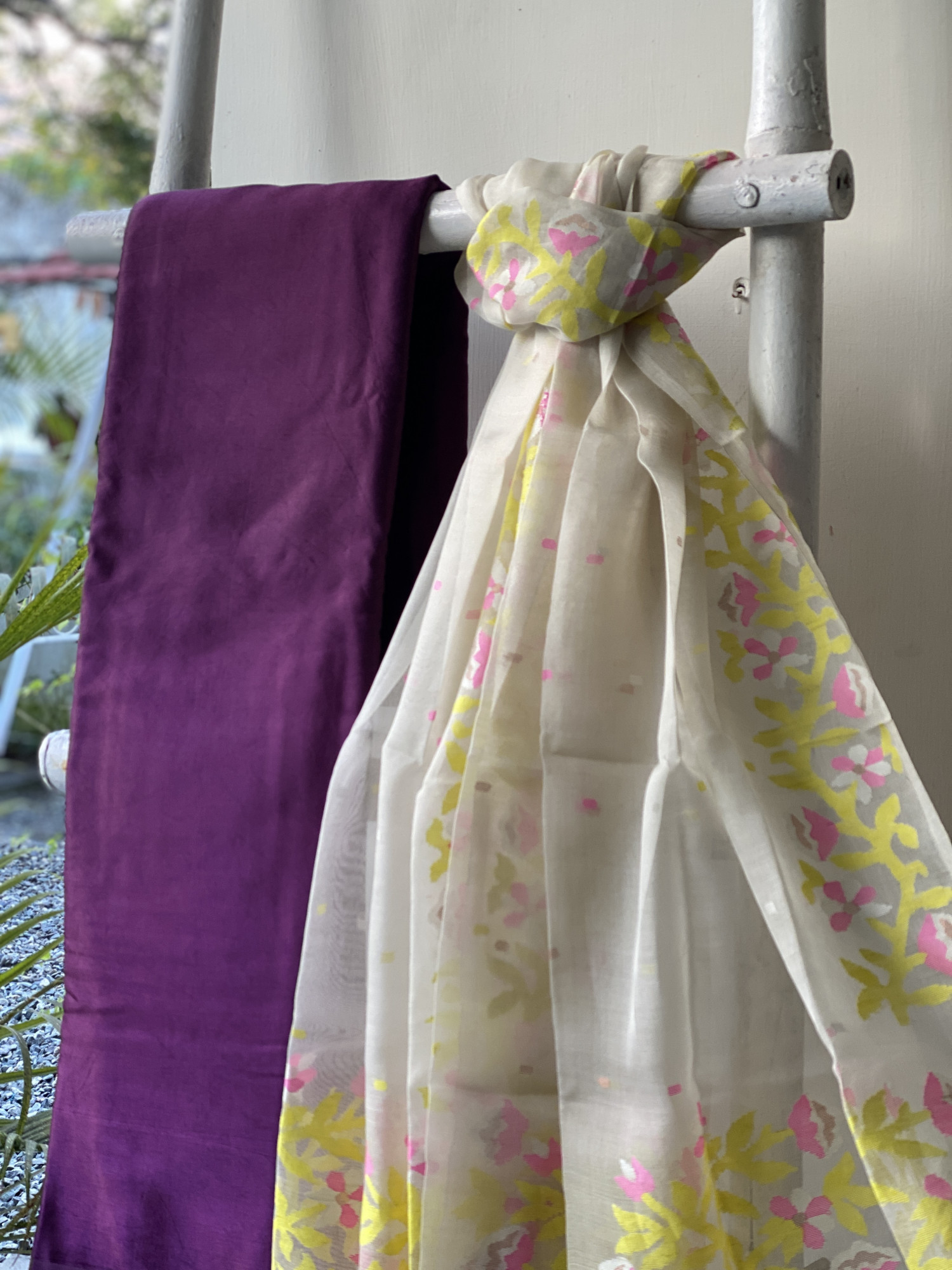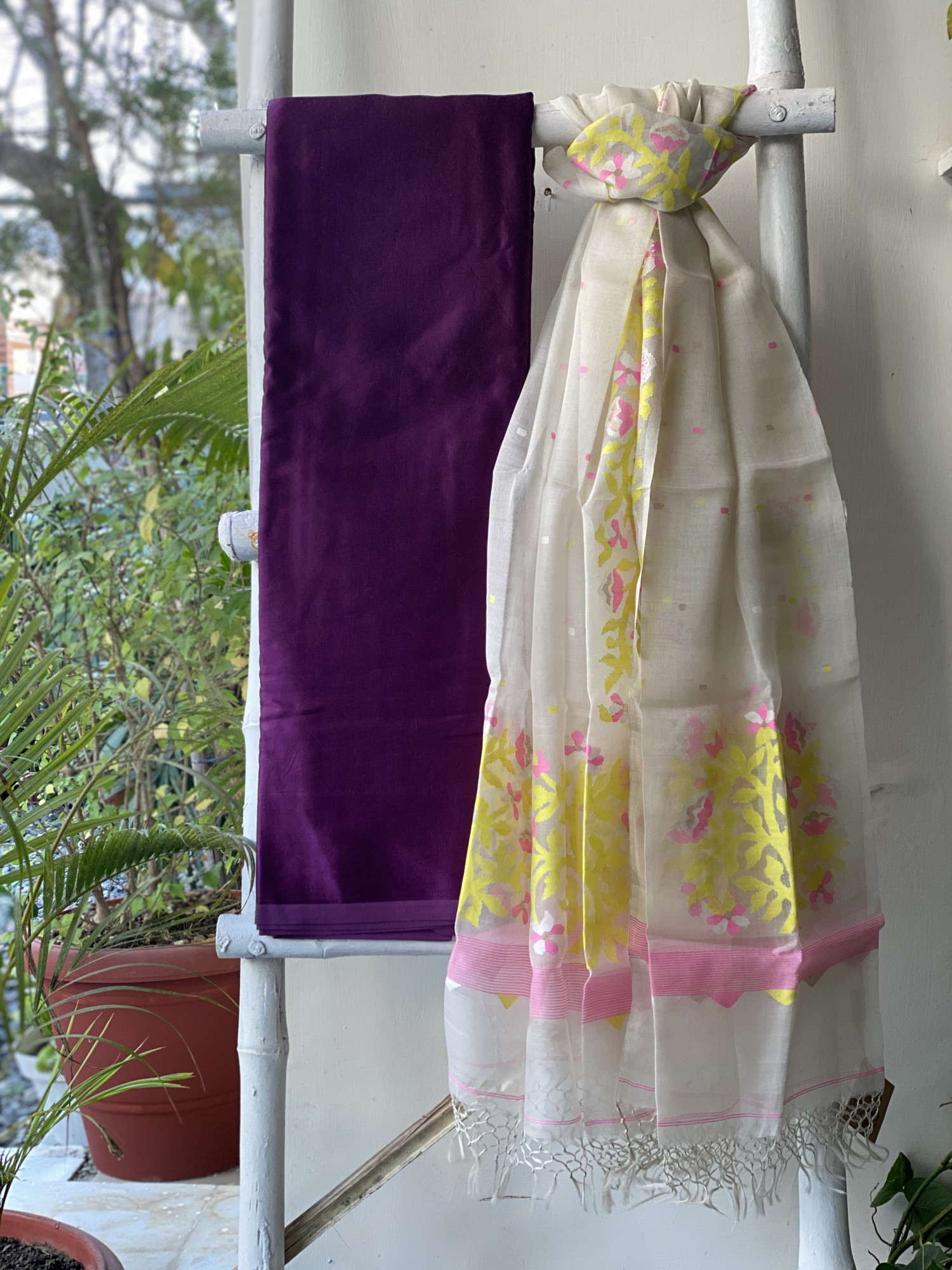 PURPLE MASHRU SILK PLAIN SHIRT AND BOTTOM PAIRED WITH AN OFF WHITE JAMDANI MUSLIN SILK WOVEN DUPATTA . ACCESSORISED WITH TASSELS