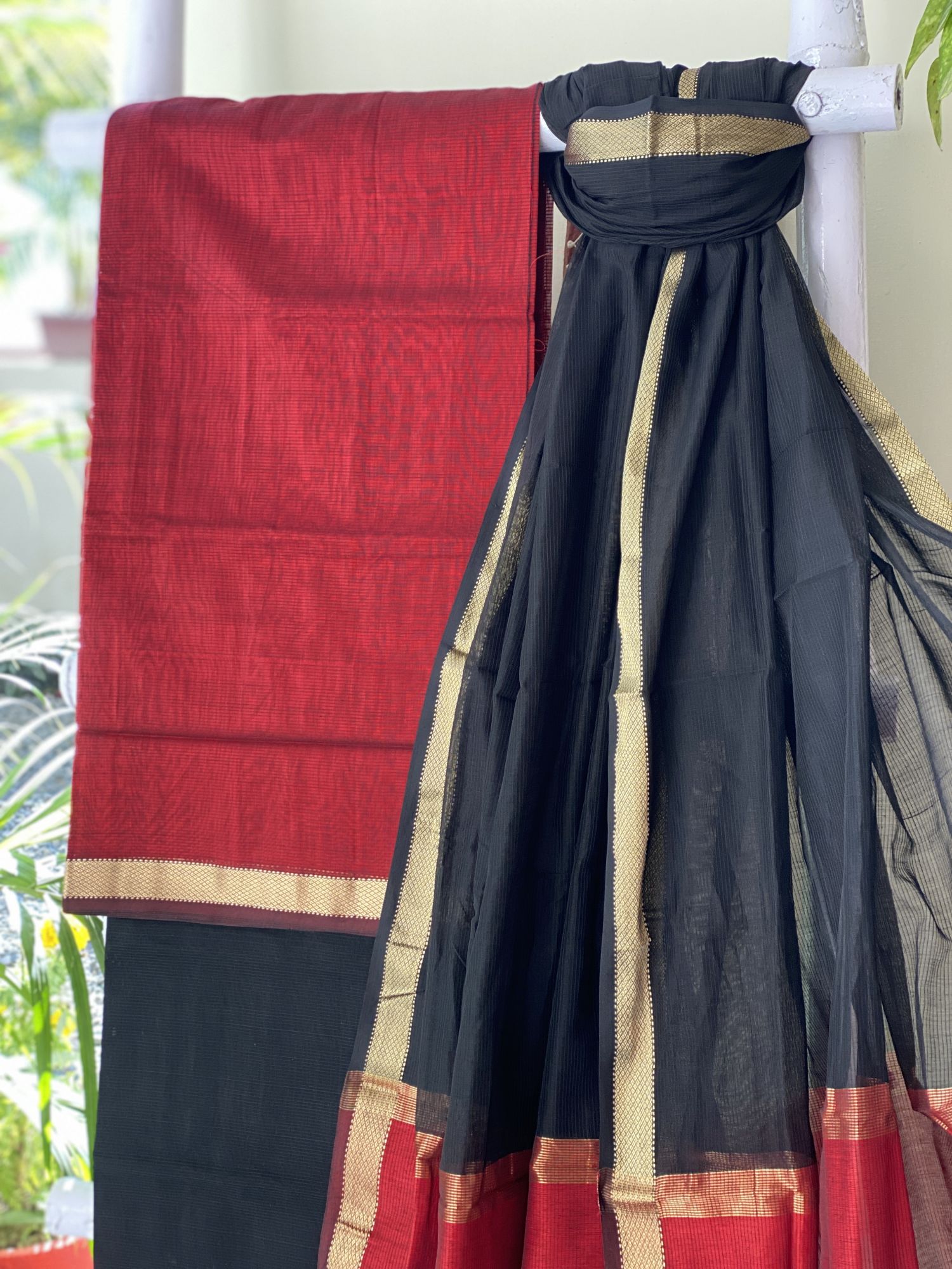 DUPATTA- BLACK & RED MAHESHWARI SILK-COTTON ZARI BORDER WOVEN DUPATTA