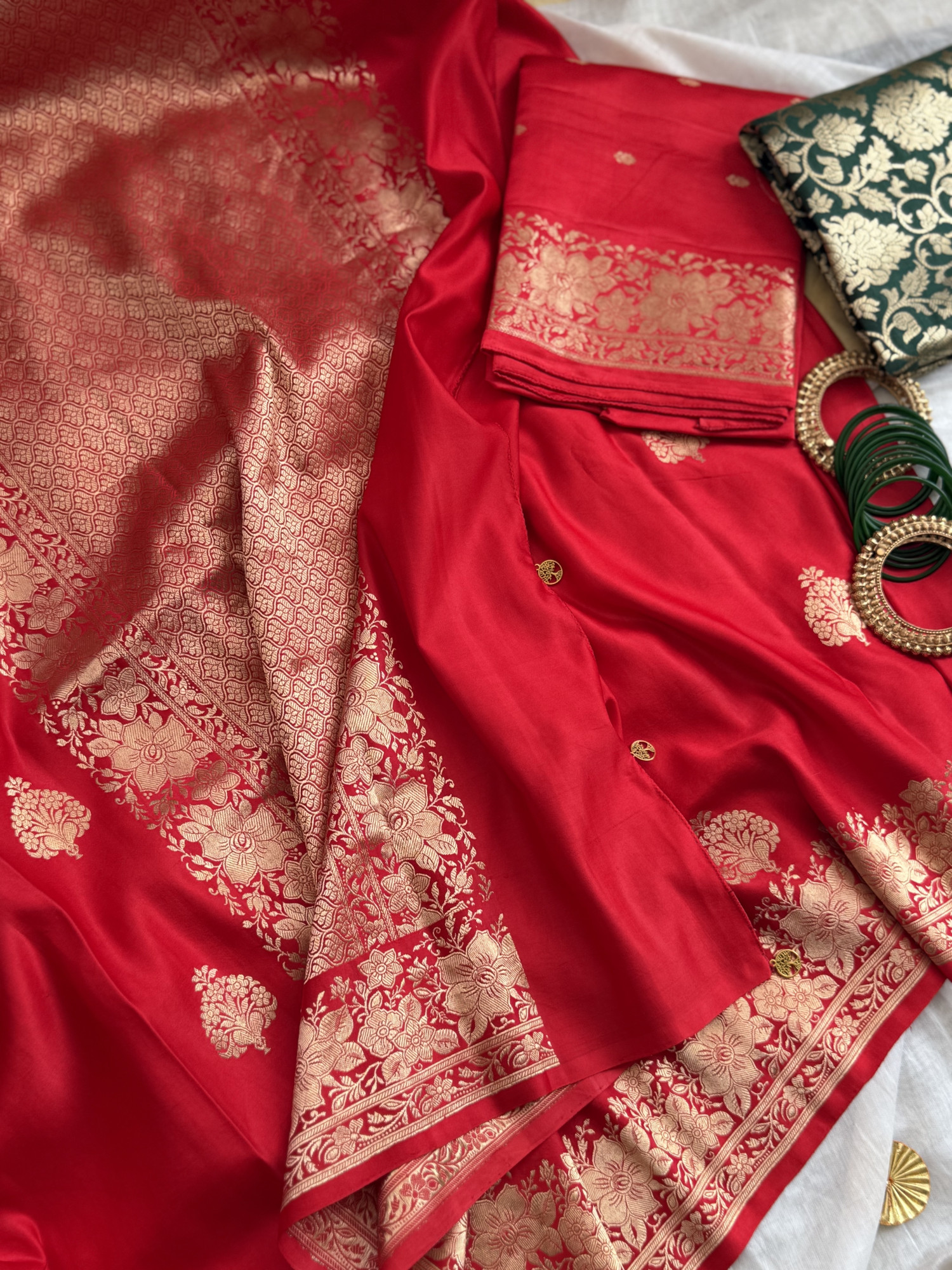 Comes with its own RED MASHRU SILK Blouse WITH ZARI BORDER AND AN EXTRA GREEN BROCADE SILK BLOUSE PIECE ( 90 cms)