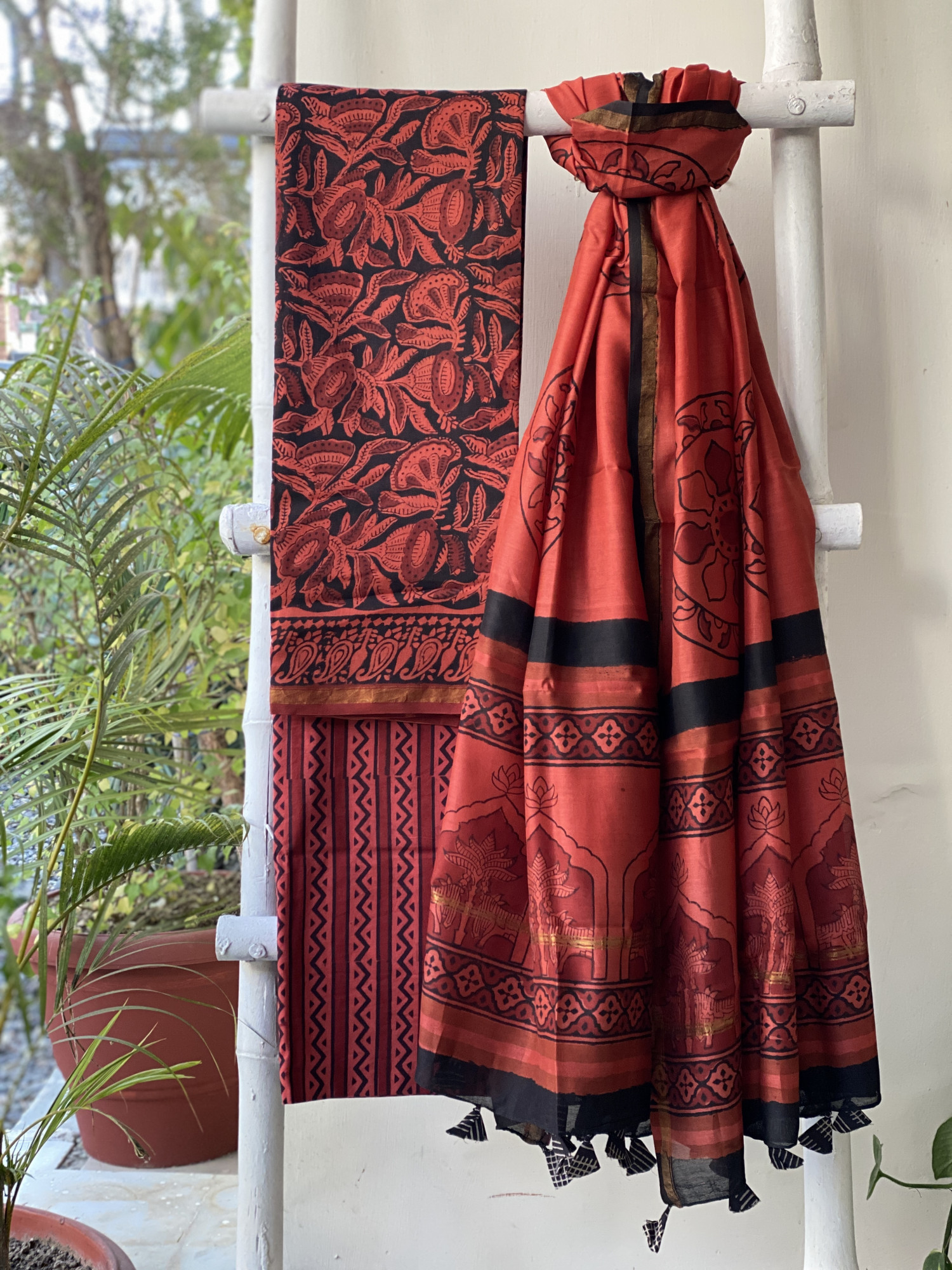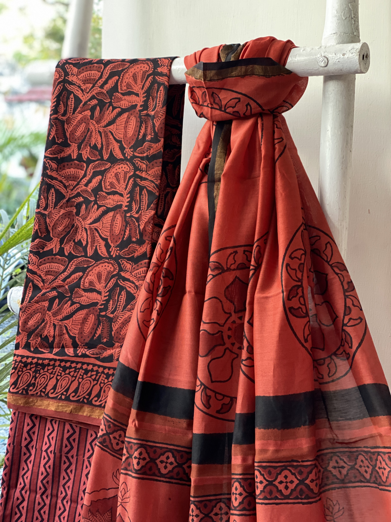 RED-BLACK CHANDERI HAND BLOCK PRINTED SILK & COTTON ZARI WOVEN BORDER SHIRT WITH A RED-BLACK HAND BLOCK PRINTED COTTON MULL BOTTOM PAIRED WITH A RED-BLACK HAND BLOCK PRINT CHANDERI ZARI WOVEN BORDER DUPATTA, ACCESSORISED WITH TASSLES.
