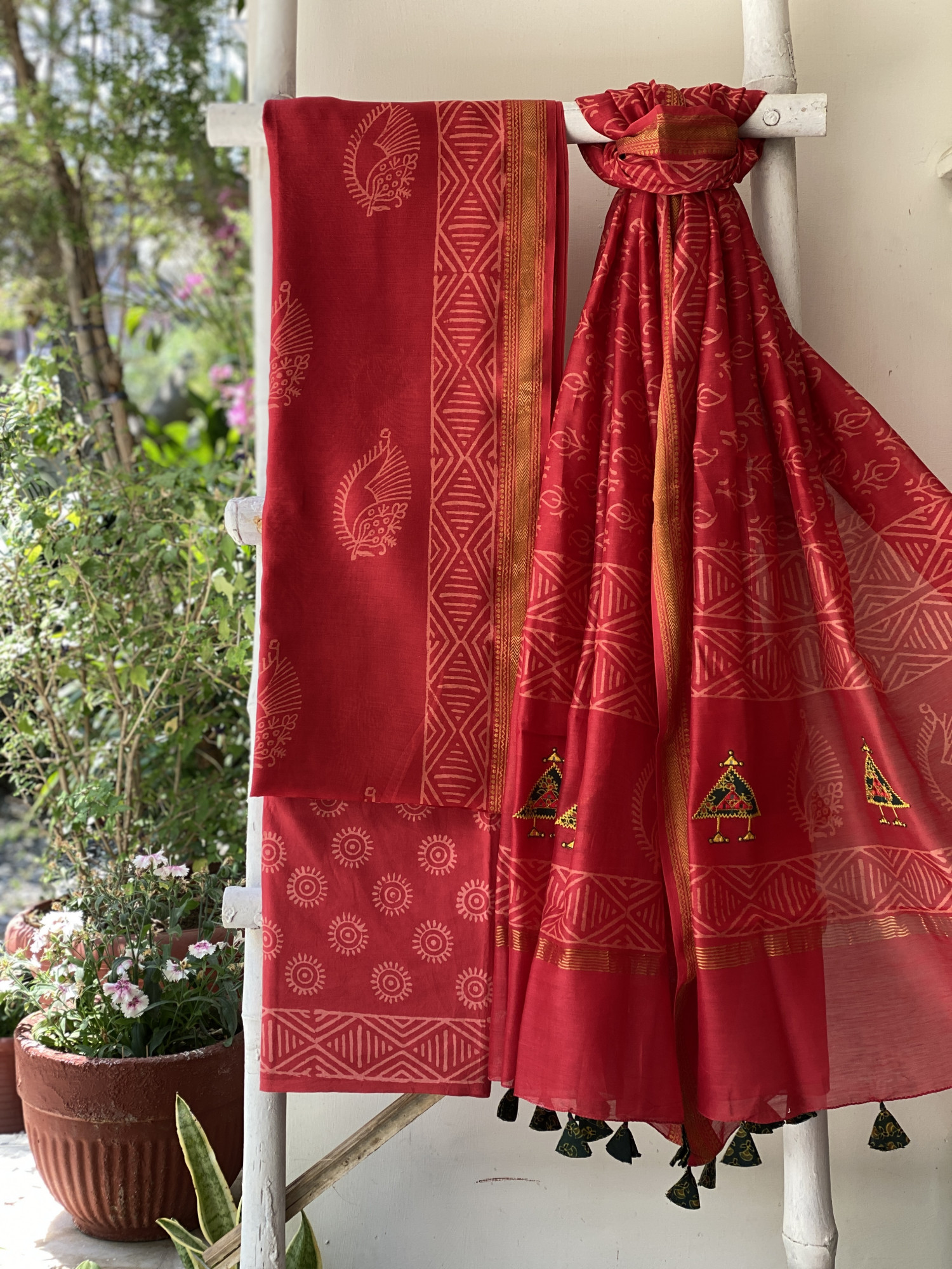 RED CHANDERI cotton silk block print shirt with RED BLOCK PRINT COTTON BOTTOM paired with A RED CHANDERI silk and cotton BLOCK PRINT DUPATTA WITH MANUAL MACHINE EMBROIDERY, accessorised with tassles.