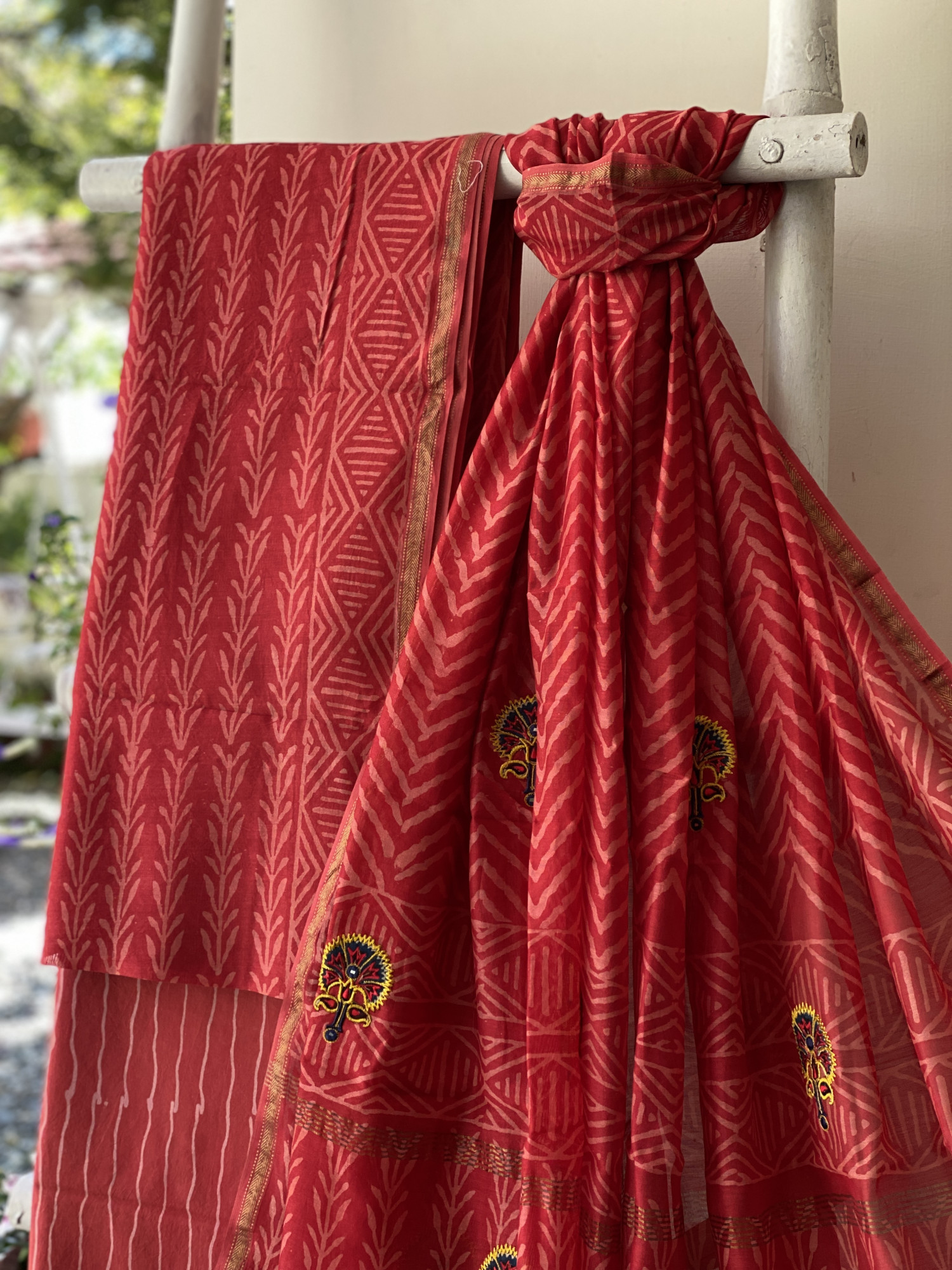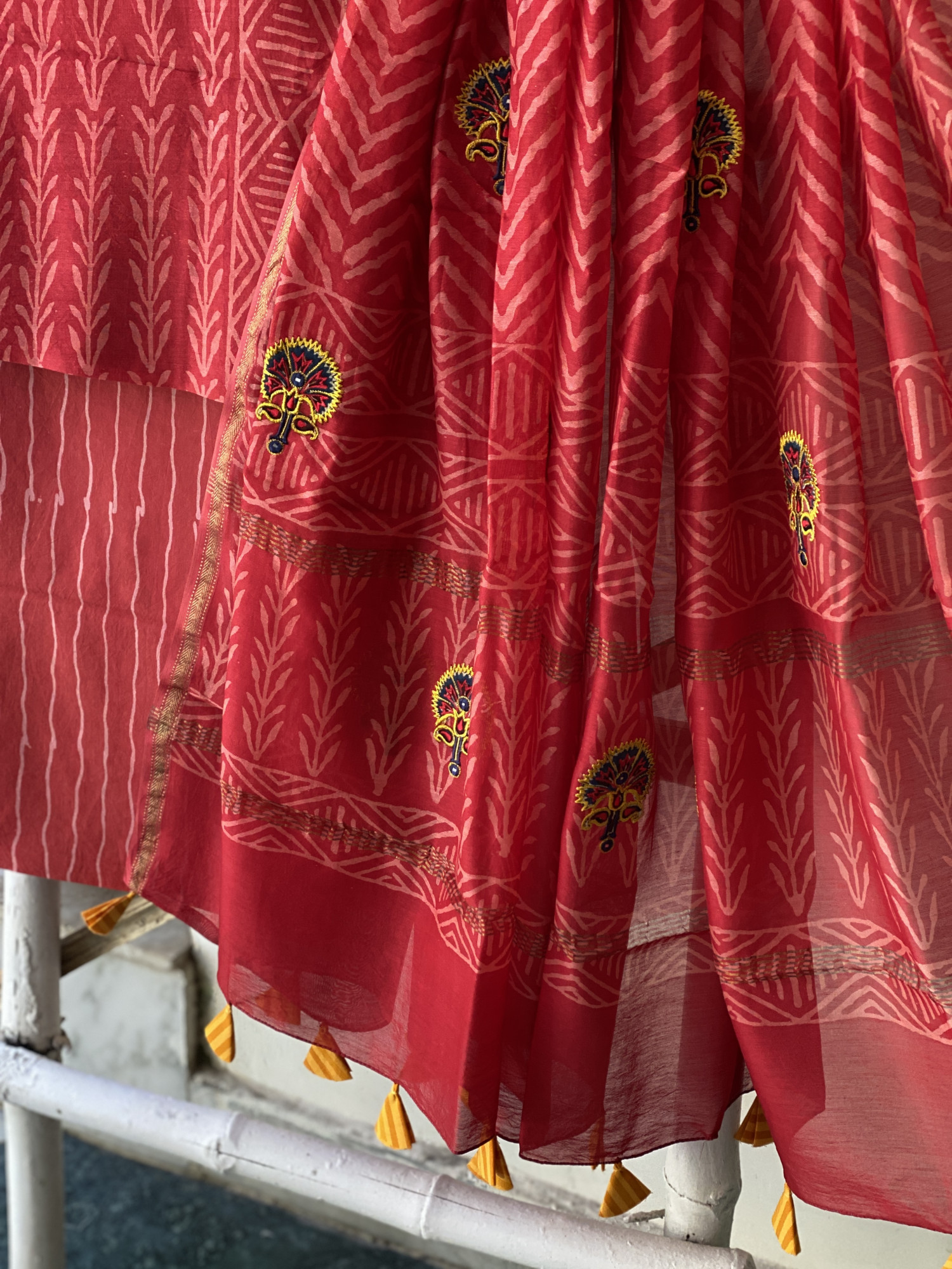 RED CHANDERI COTTON BLOCK PRINT EMBROIDERED DUPATTA SET