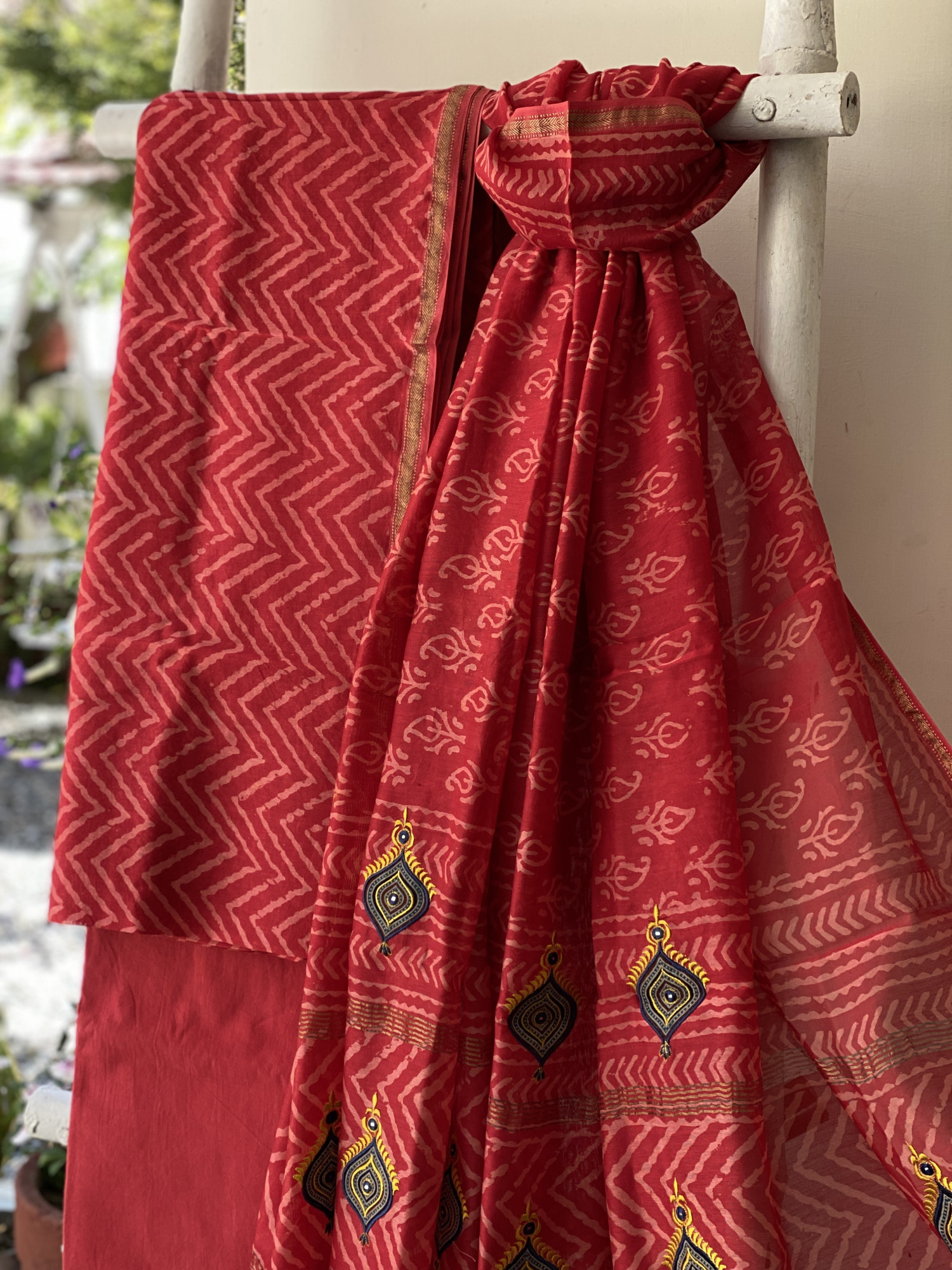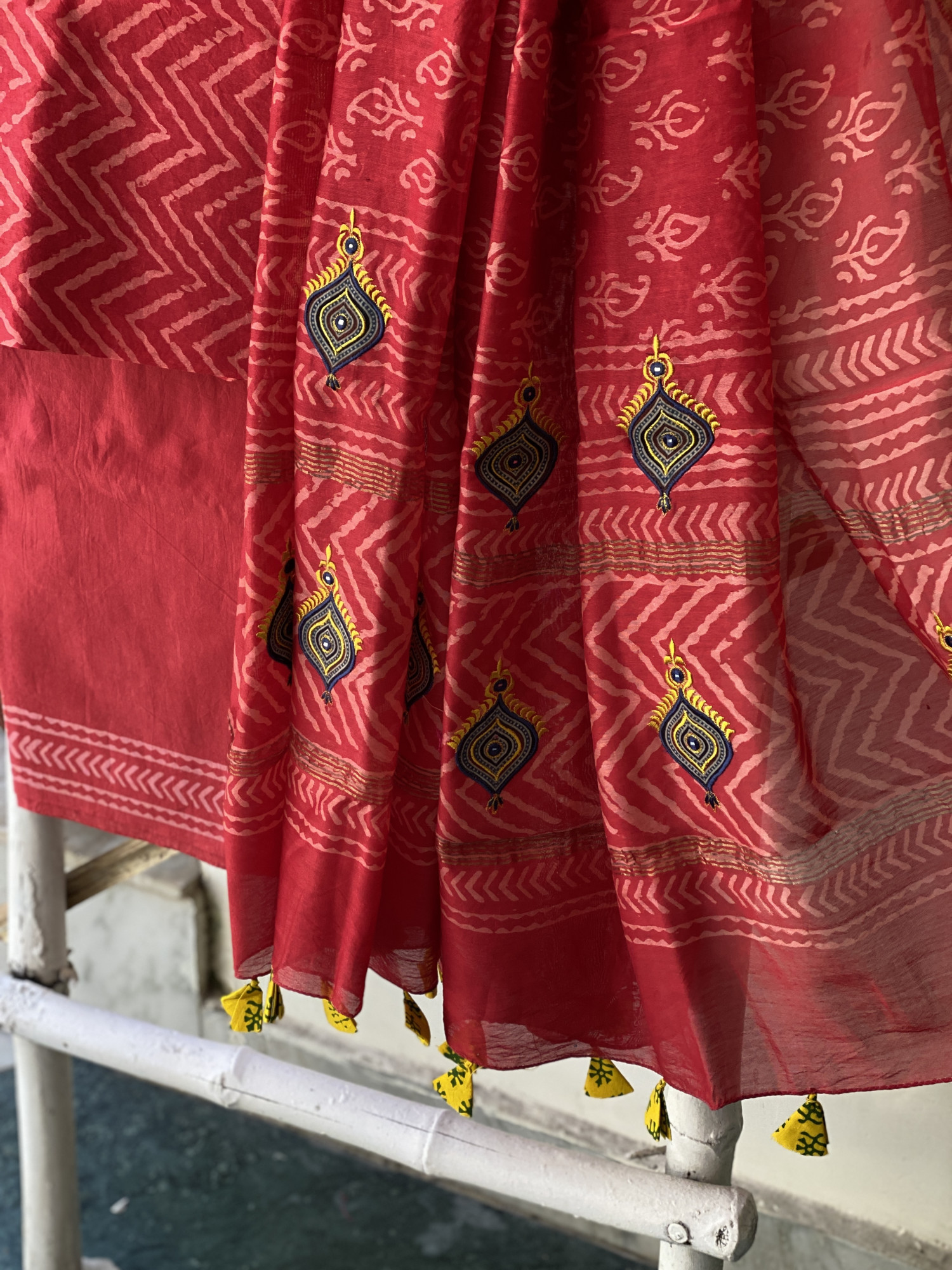 RED CHANDERI COTTON BLOCK PRINT EMBROIDERED DUPATTA SET
