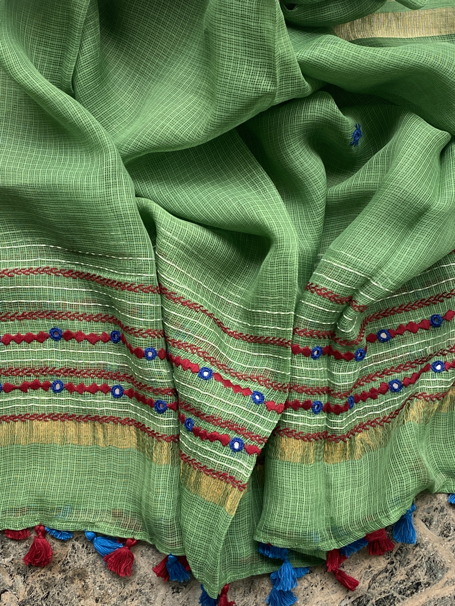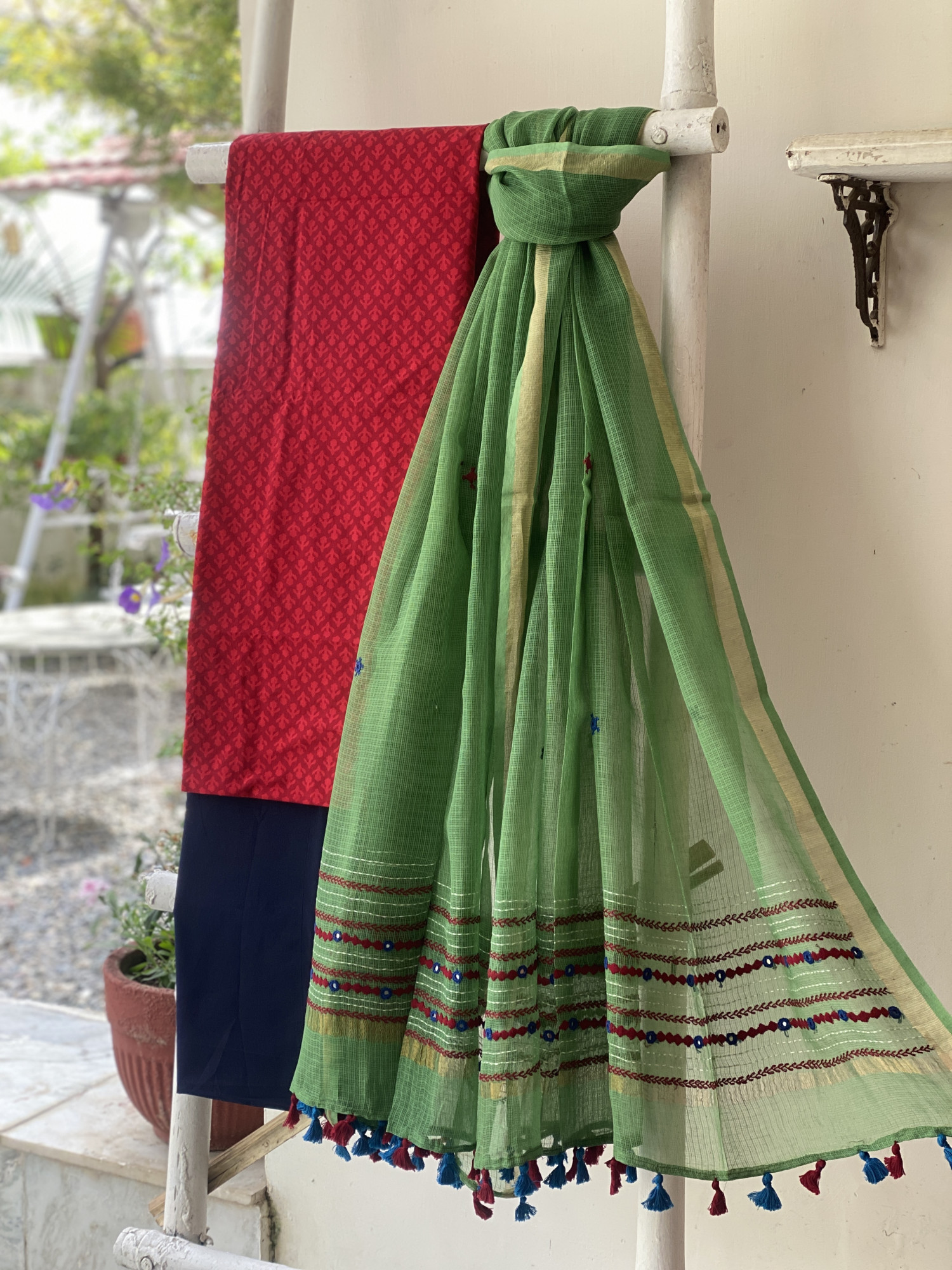 RED HAND BLOCK PRINT COTTON SHIRT AND A NAVY BLUE PLAIN COTTON BOTTOM PAIRED WITH A PARROT GREEN KOTA HAND EMBROIDERED DUPATTA WITH ZARI WOVEN BORDER, ACCESSORISED WITH TASSLES.