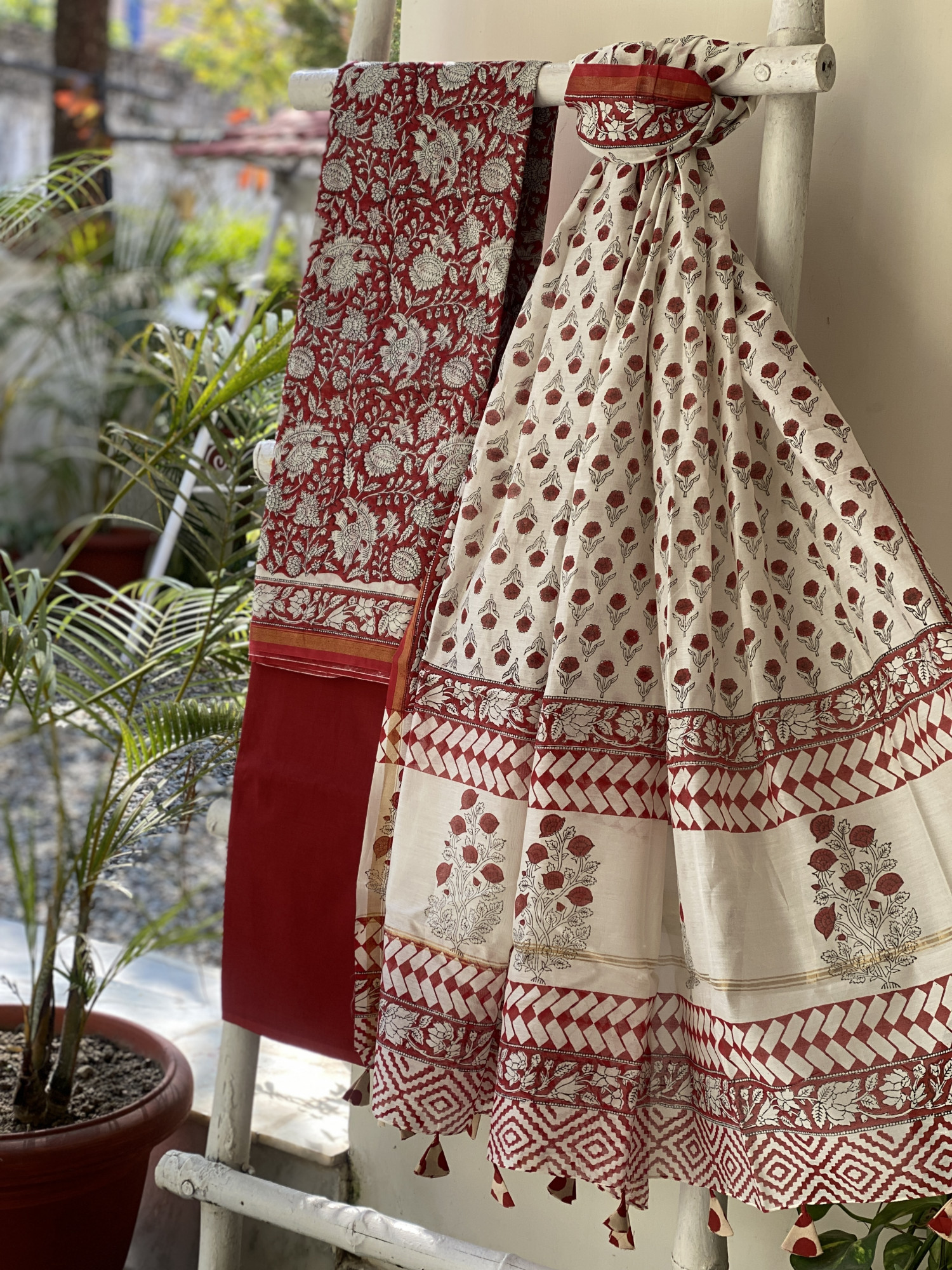 RED CHANDERI HAND BLOCK PRINTED SILK & COTTON ZARI WOVEN BORDER SHIRT WITH A RED PLAIN COTTON MULL BOTTOM PAIRED WITH AN OFF WHITE HAND BLOCK PRINT CHANDERI ZARI WOVEN BORDER DUPATTA, ACCESSORISED WITH TASSLES.