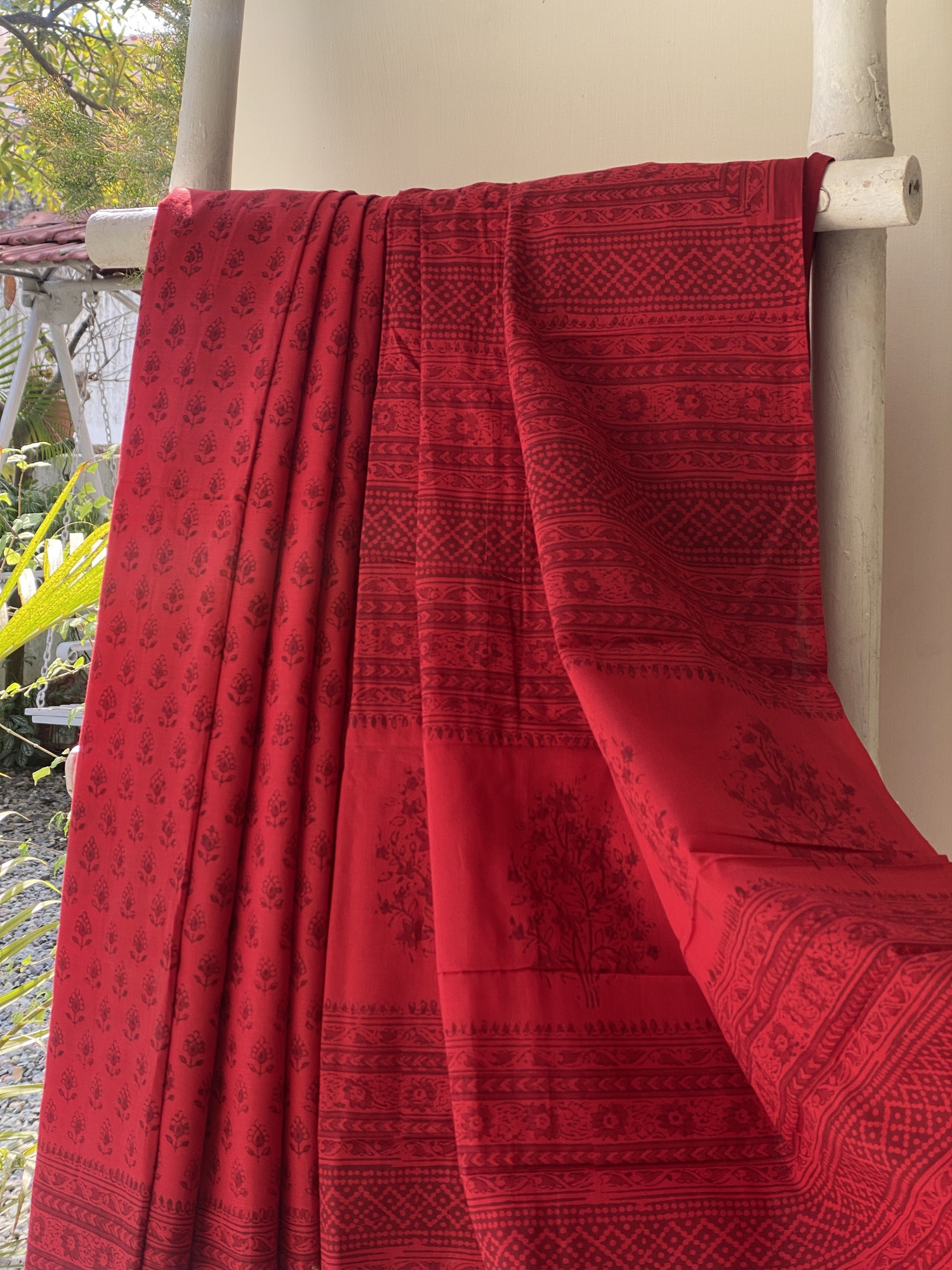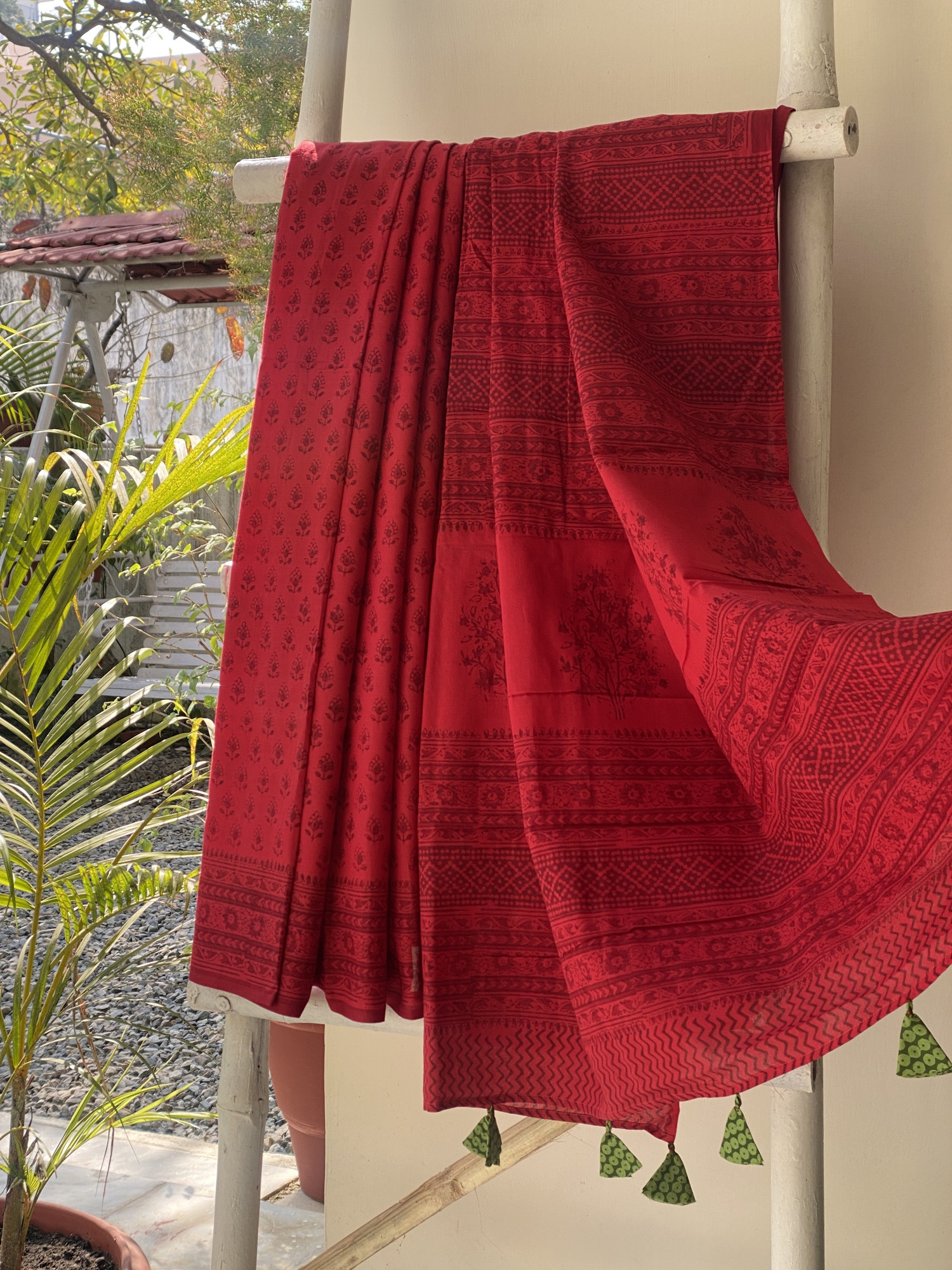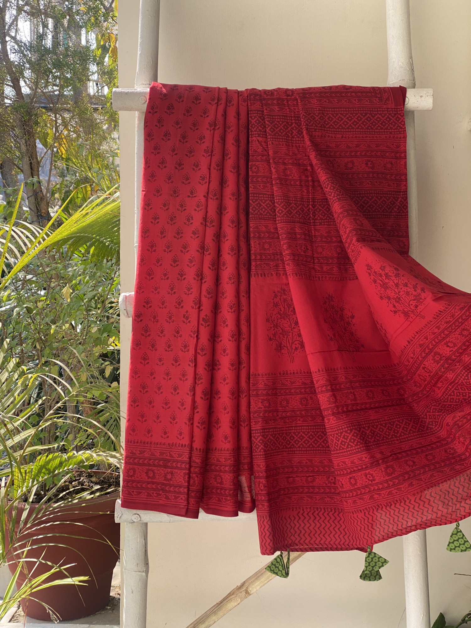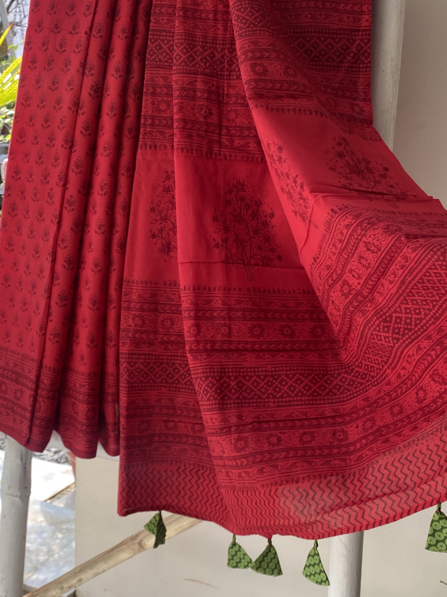 RED Cotton mull hand block print sari, accessorised with tassles. Comes with A INDIGO COTTON HAND BLOCK PRINT blouse