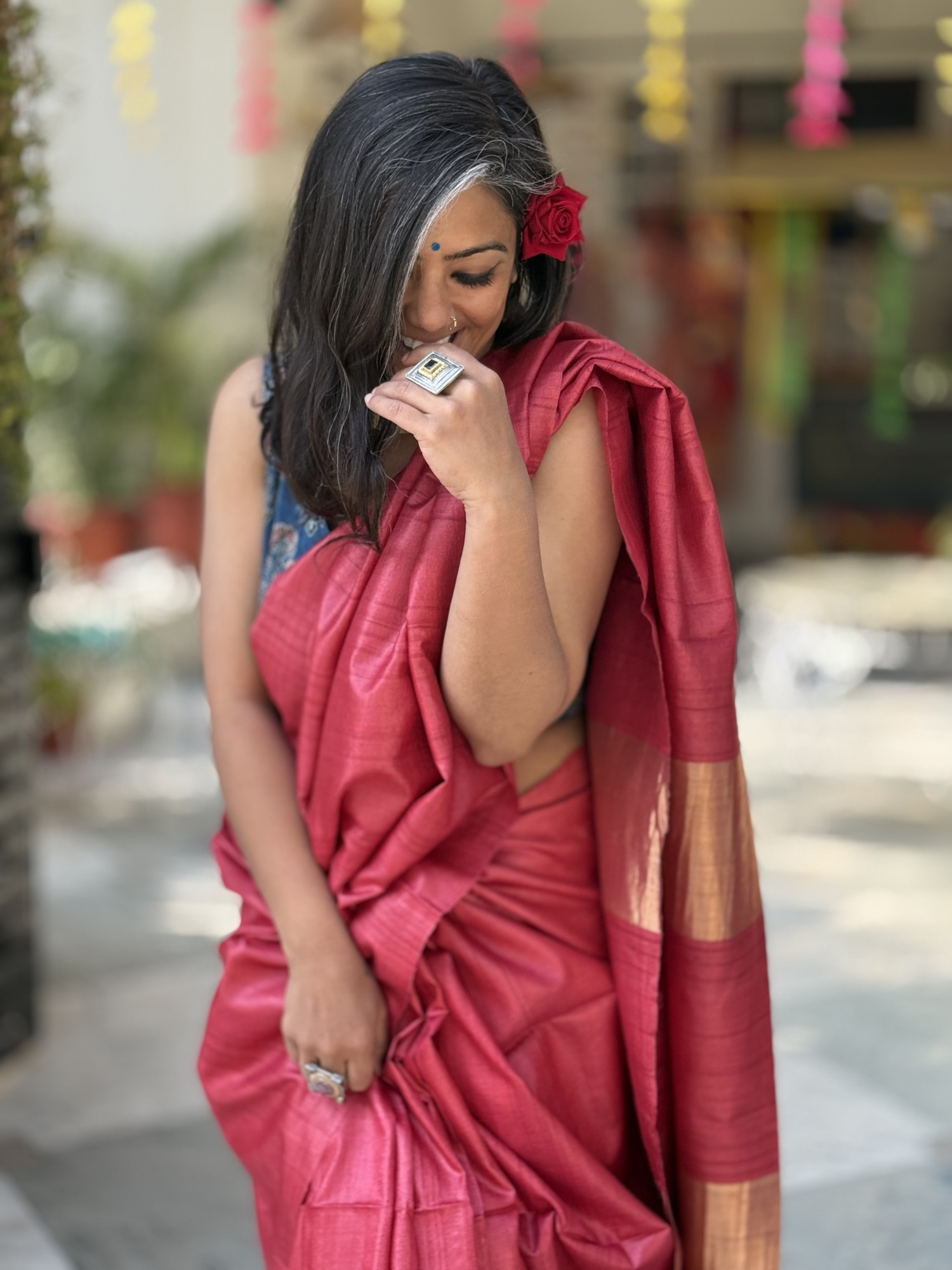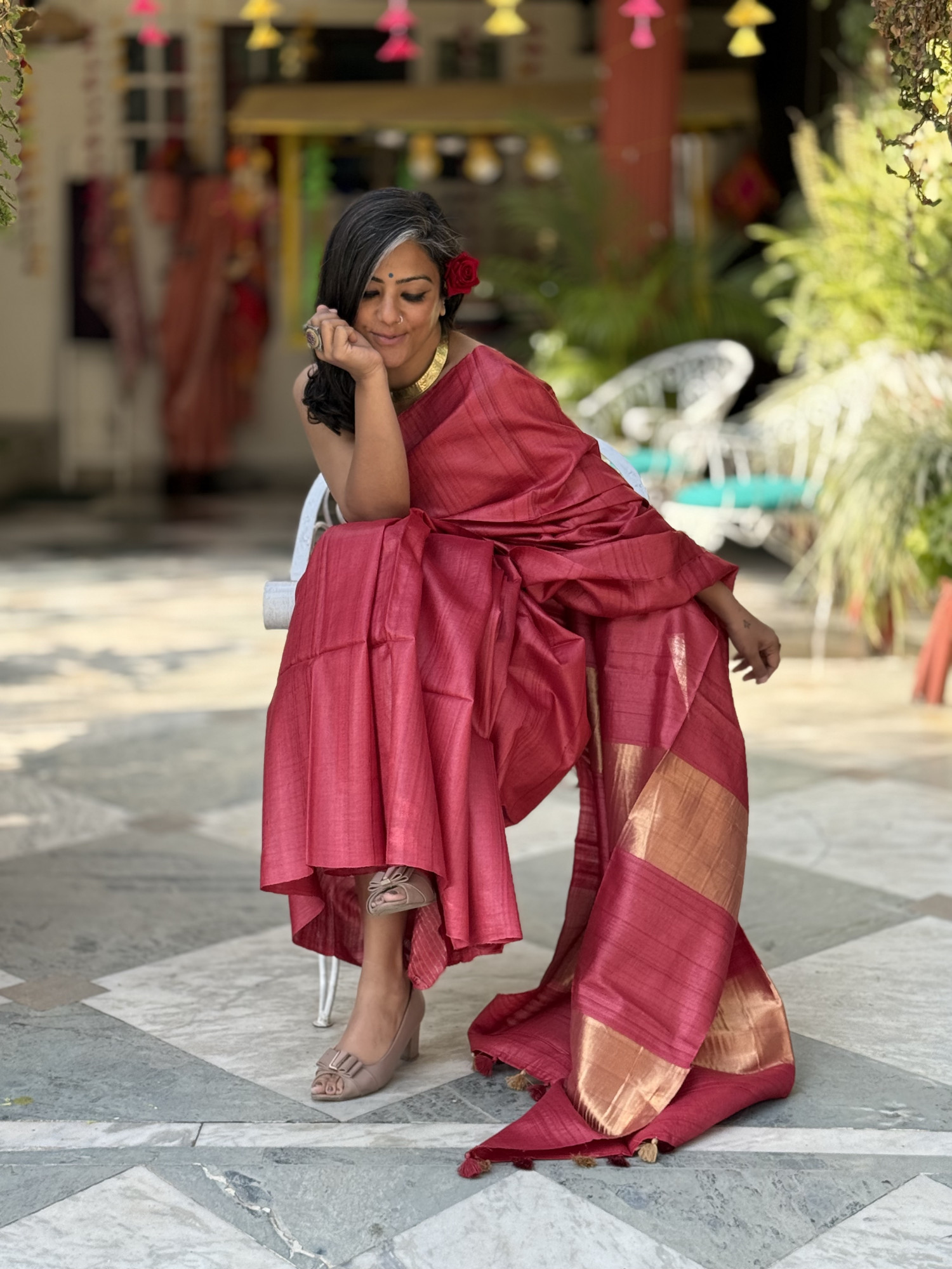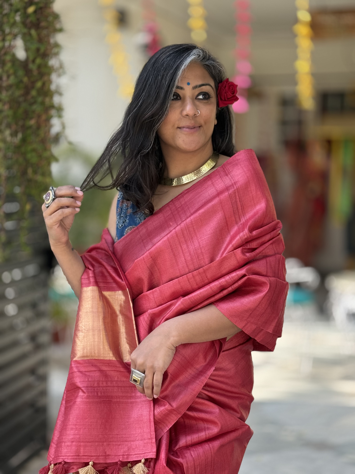RED DESI TUSSAR WOVEN SILK sari with WITH DOUBLE ZARI patta WOVEN PALLA accessorised with tassles.