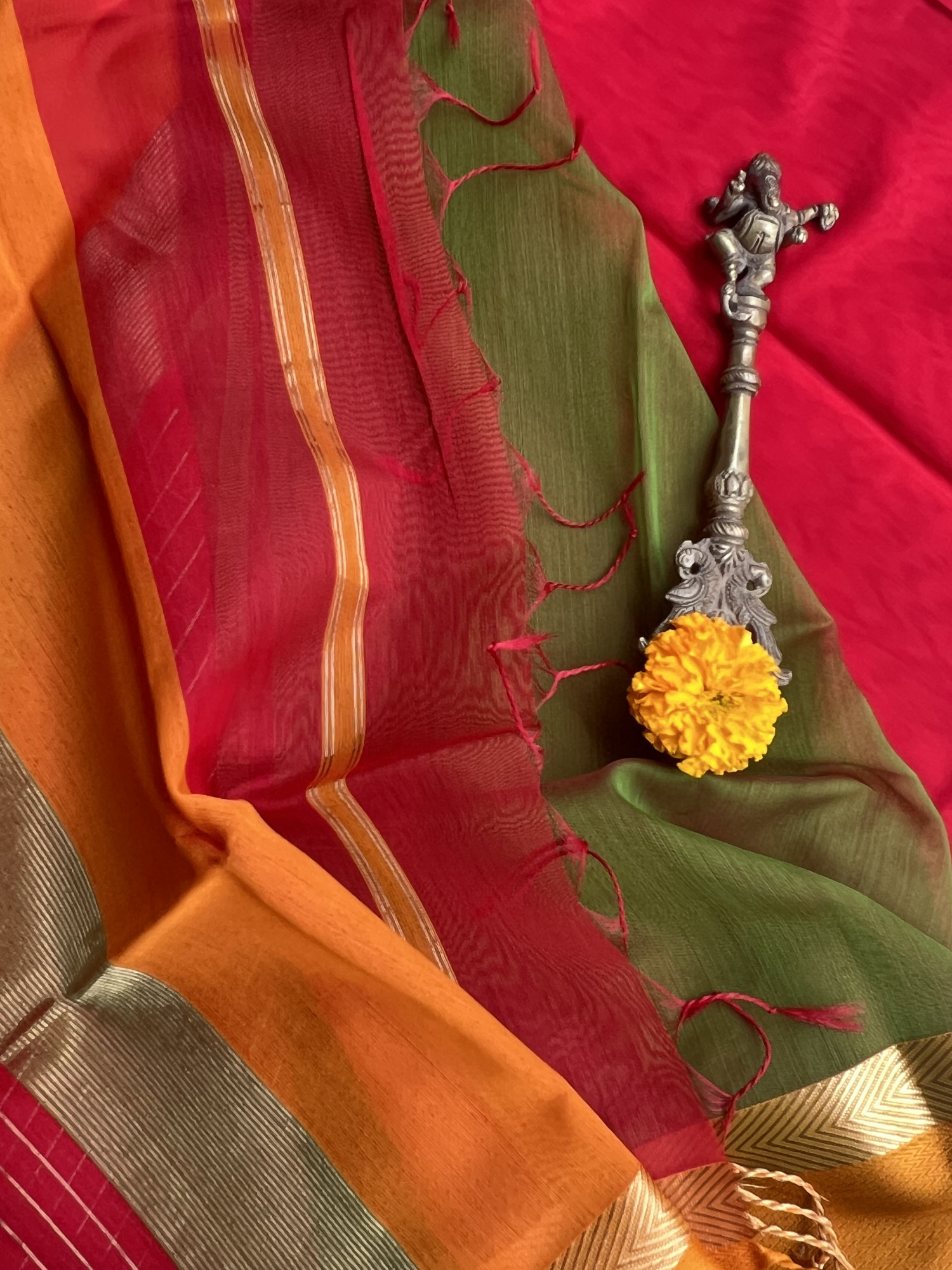 Comes with its own GREEN MAHESHWARI SILK AND COTTON Blouse WITH RESHAM-ZARI BORDER