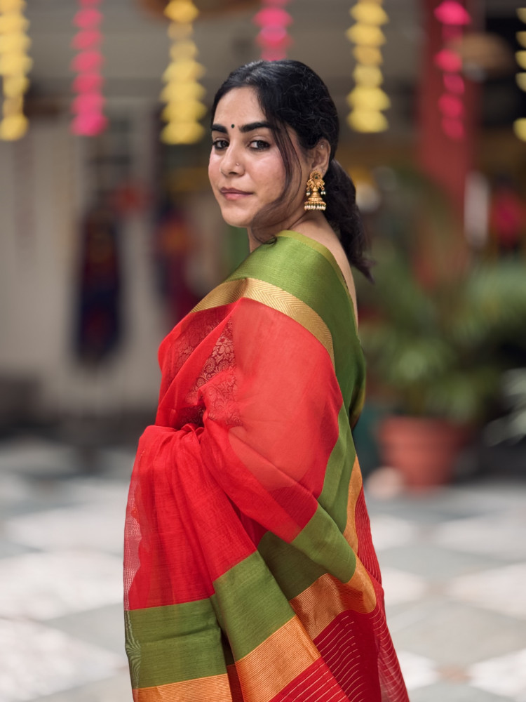 RED MAHESHWARI SILK AND COTTON SARI WITH WOVEN RESHAM- ZARI BORDER AND PALLA .