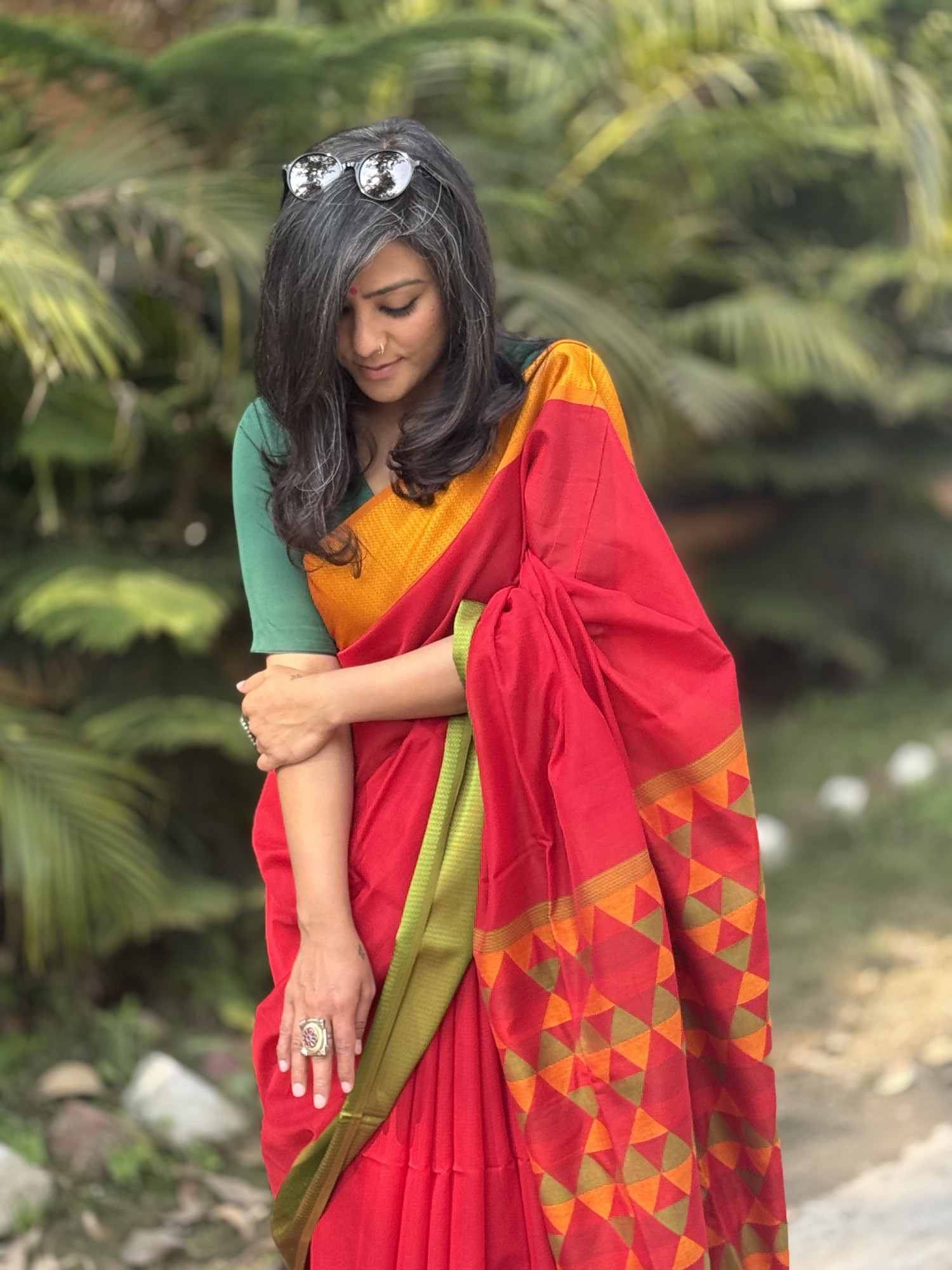 Comes with its own SHADED GREEN MAHESHWARI SILK AND COTTON Blouse WITH RESHAM BORDER