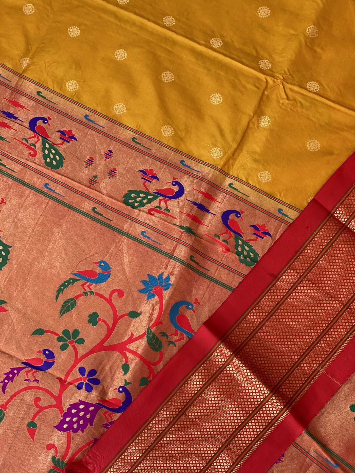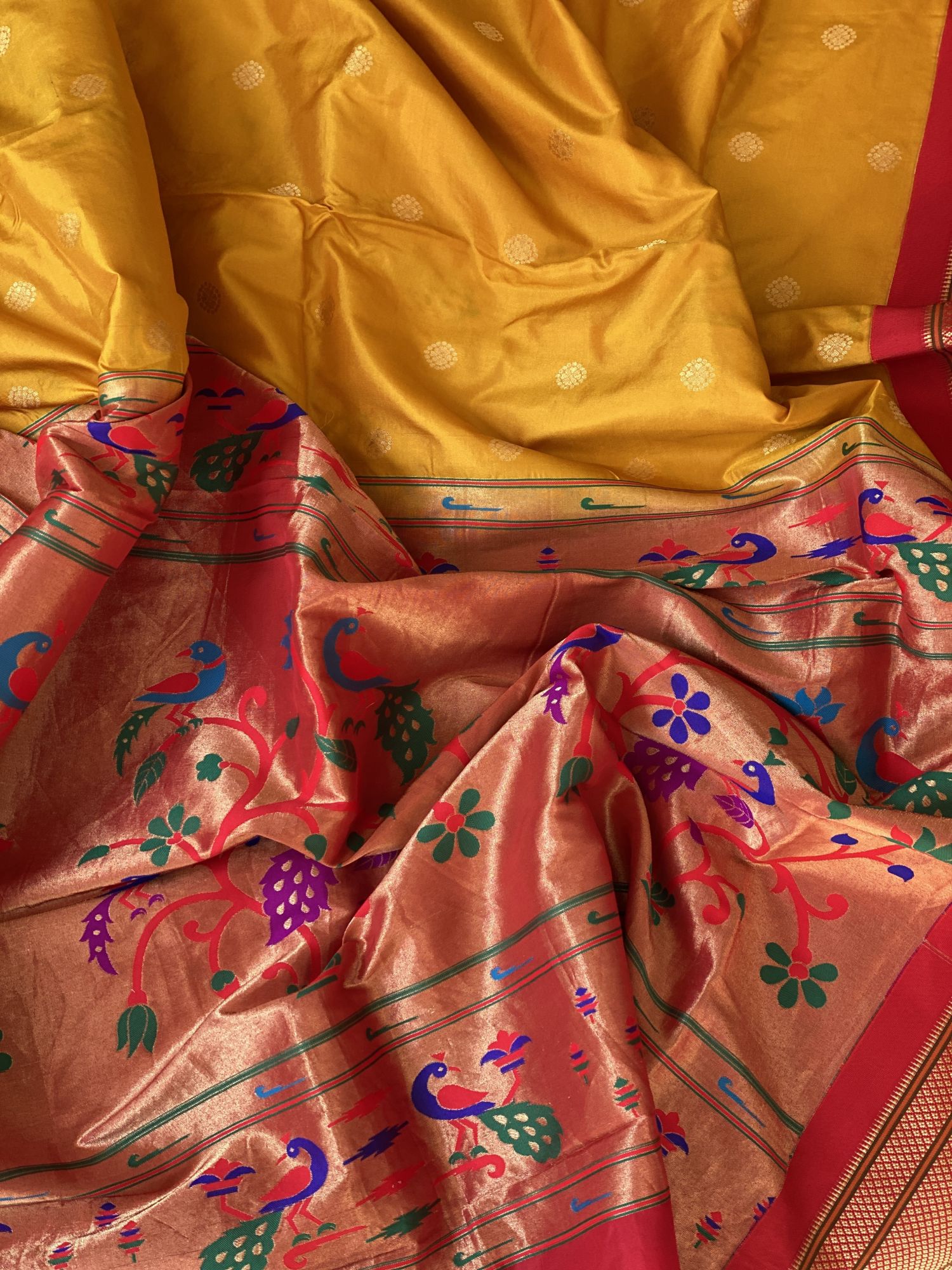 RED PRINTED PURE SOFT SILK SHIRT AND PLAIN RED PURE SOFT SILK BOTTOM PAIRED WITH A MUSTARD PAITHANI PURE ZARI WOVEN SILK DUPATTA WITH CONTRAST RED BORDER WOVEN WITH ZARI, ACCESSORISED WITH TASSELS.