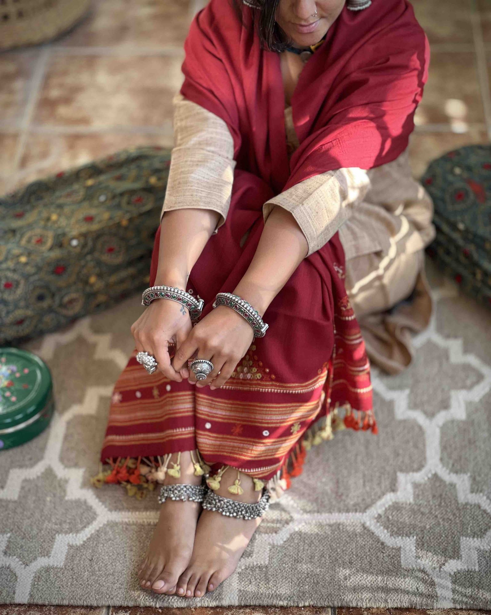 RED pure merino wool hand dyed AND DEVRA EMBROIDERED stole, ACCESSORISED WITH TASSLES.