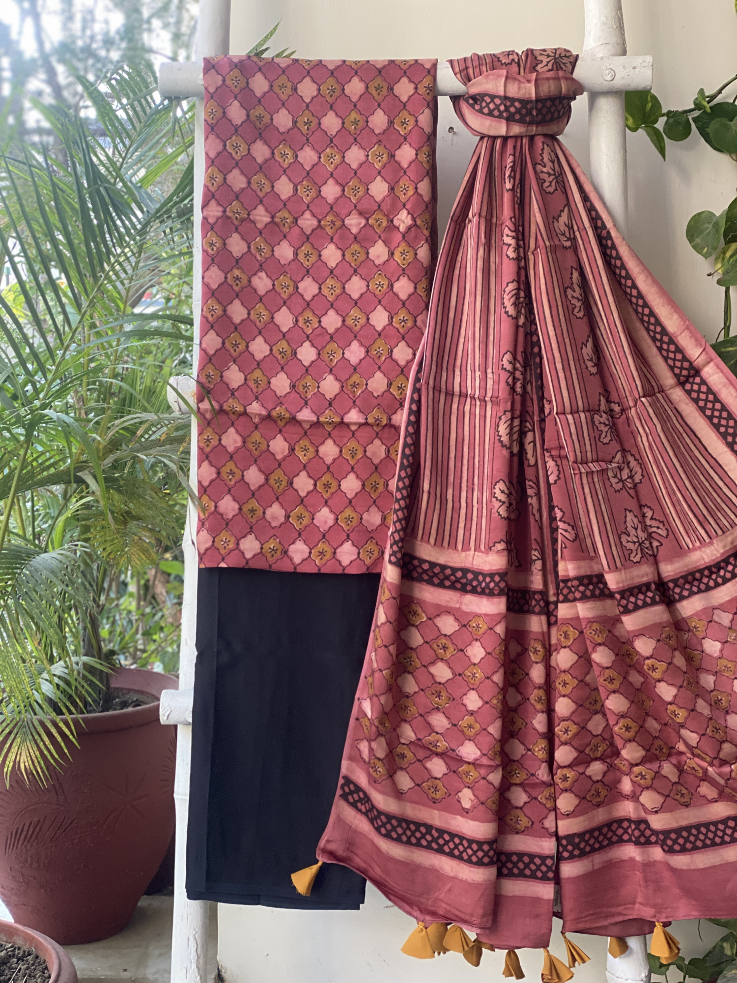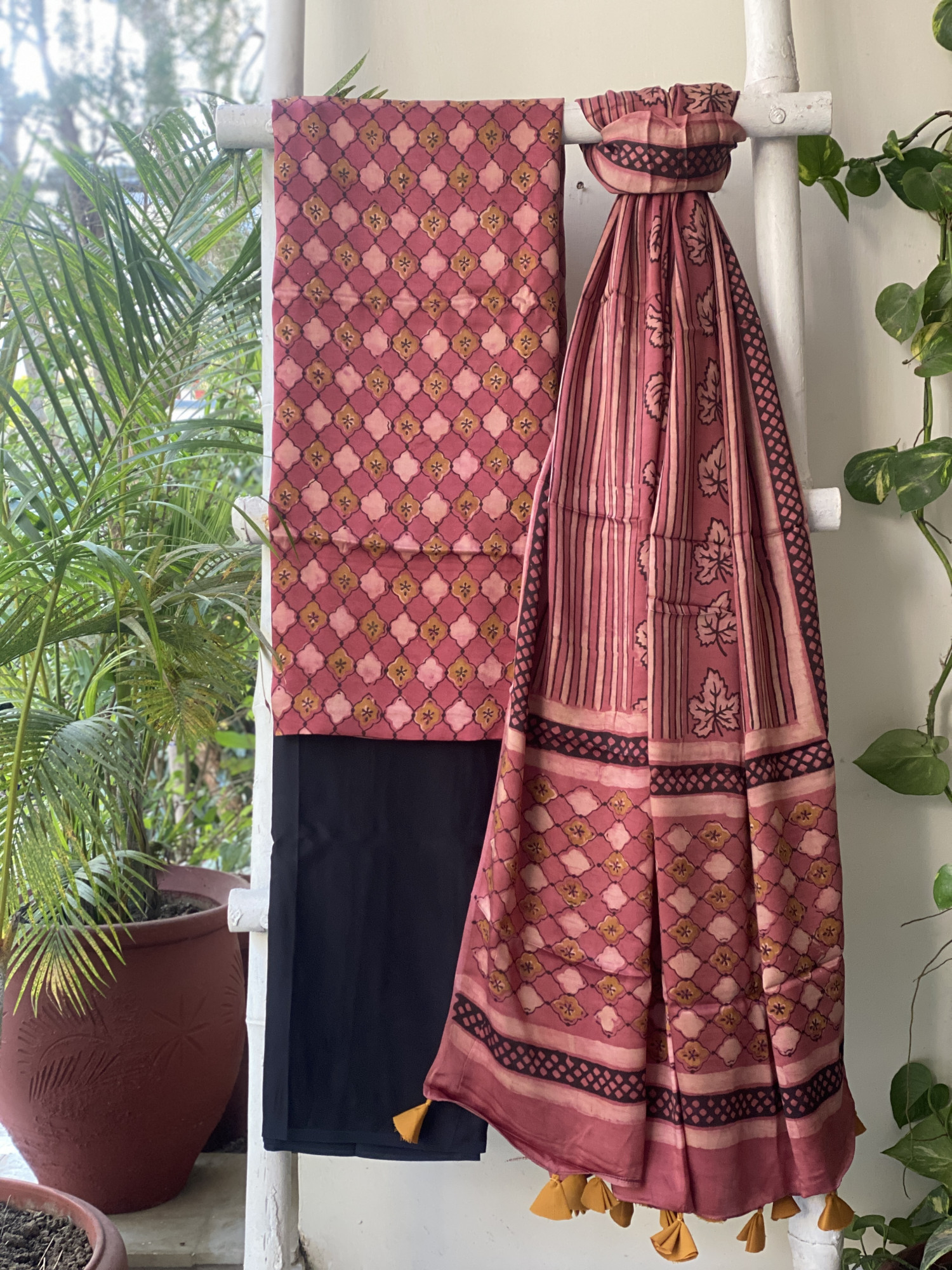 RUBY hand dyed ajrakh block print modal silk shirt and BLACK MODAL SILK PLAIN BOTTOM paired with A RUBY modal silk ajrakh block print dupatta, accessorised with tassles.